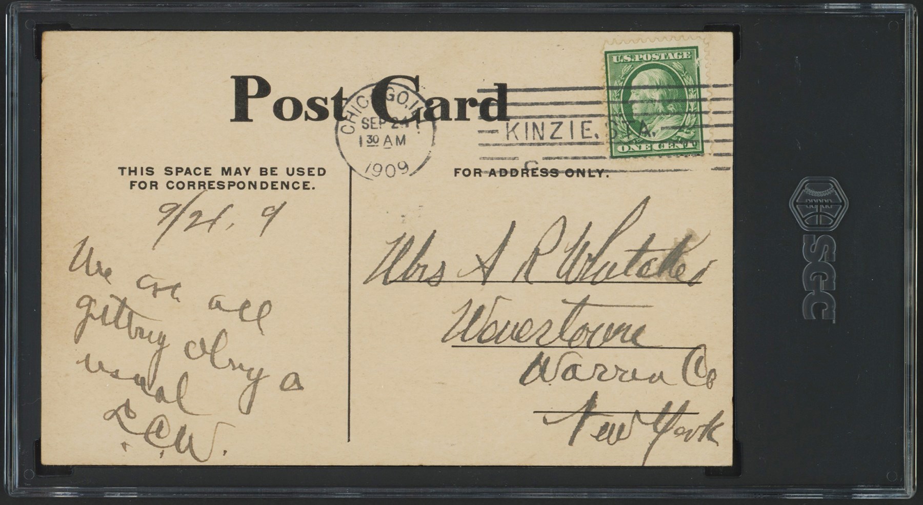 Exceedingly rare 1909 PC798-D146 Rand McNally & Co. Strike Out! Post Card has been encapsulated and deemed "Authentic" by SGC. Standard sized post card with an image of an early left handed pitcher (who appears to bear a resemblance Rube Marquard) reads, "Strike Out! The old number. Our new house number is...." Designed to be used by people who are moving, the sender would put their new home address on the front and mail it to their friends and family. Post card has been filled out entirely and features a September 24, 1909, postmark. Card is a Pop 1 example as of the time of cataloging.