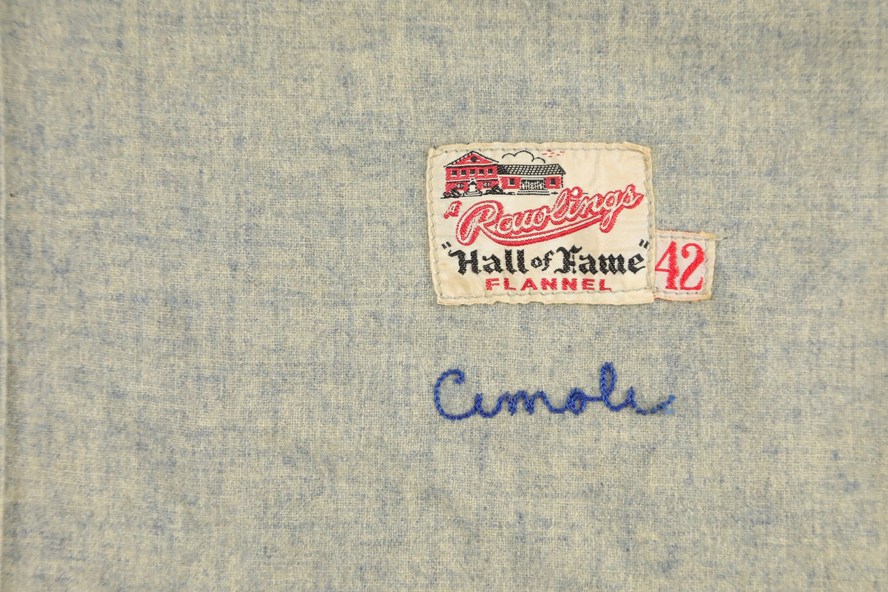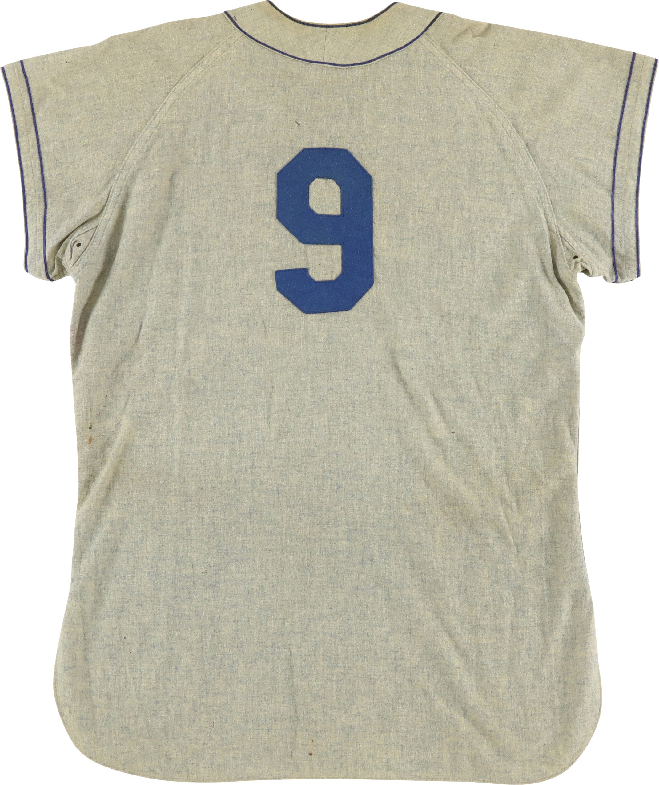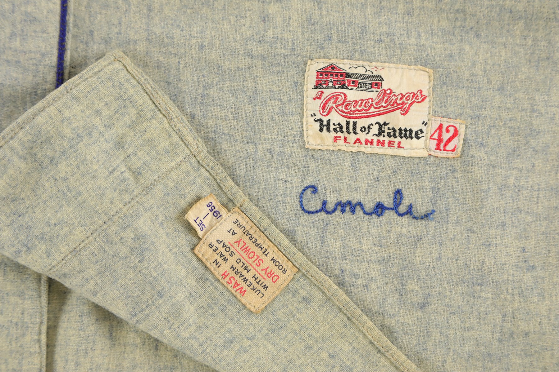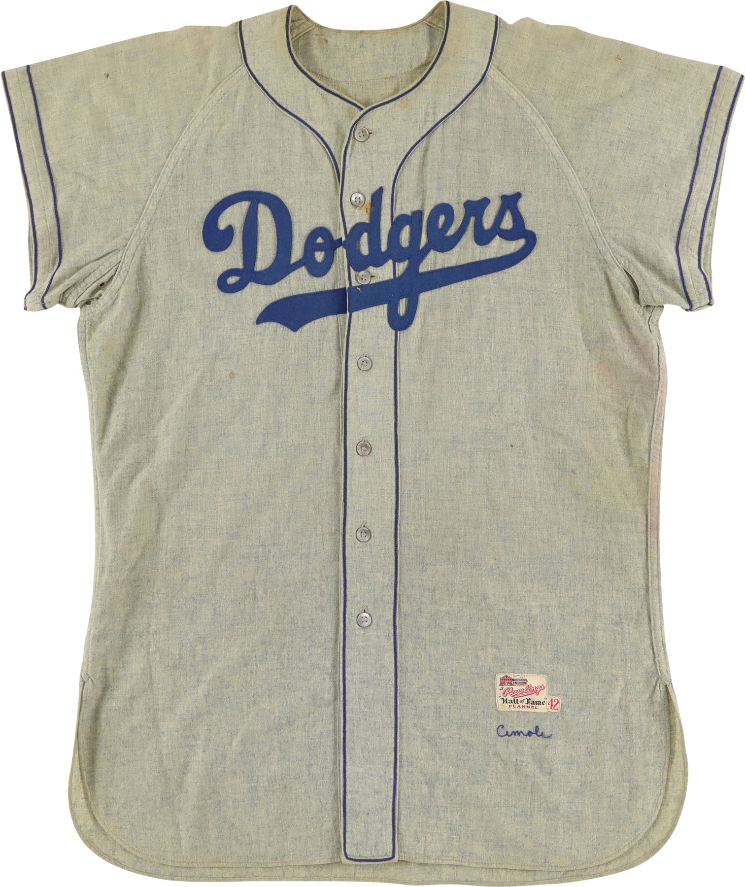 Brooklyn Dodgers road jersey worn by outfielder Gino Cimoli in 1956. The gray flannel jersey is lettered "Dodgers" across the front and features the number "9" on the reverse. All letters and numerals are applied in blue felt. Located on the left front tail are a "Rawlings Hall of Fame Flannel" label and an adjacent "42" size tag. The name "Cimoli" is chain-stitched in blue, directly below the manufacturer's label. Located on the interior left front tail are a wash tag and a flag tag reading "Set 1 1956." The jersey is original as issued and displays heavy wear, including light scattered staining (mainly on the front) and a few small holes. 1956 marked Gino Cimoli's first season in the Majors. Appearing in 73 games, Cimoli batted .111 with no home runs and just 4 RBI. The following season he became a starter in the outfield, batting .293 with 10 home runs and 57 RBI. He retired in 1965 with 44 home runs, 321 RBI, and a .265 lifetime average.