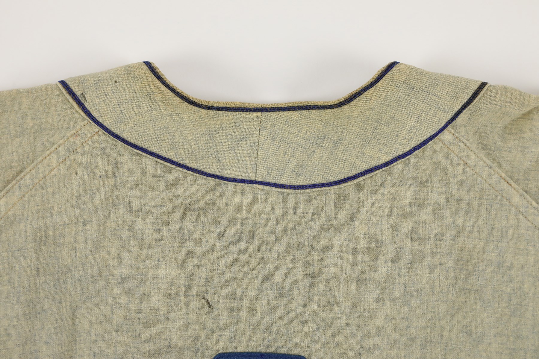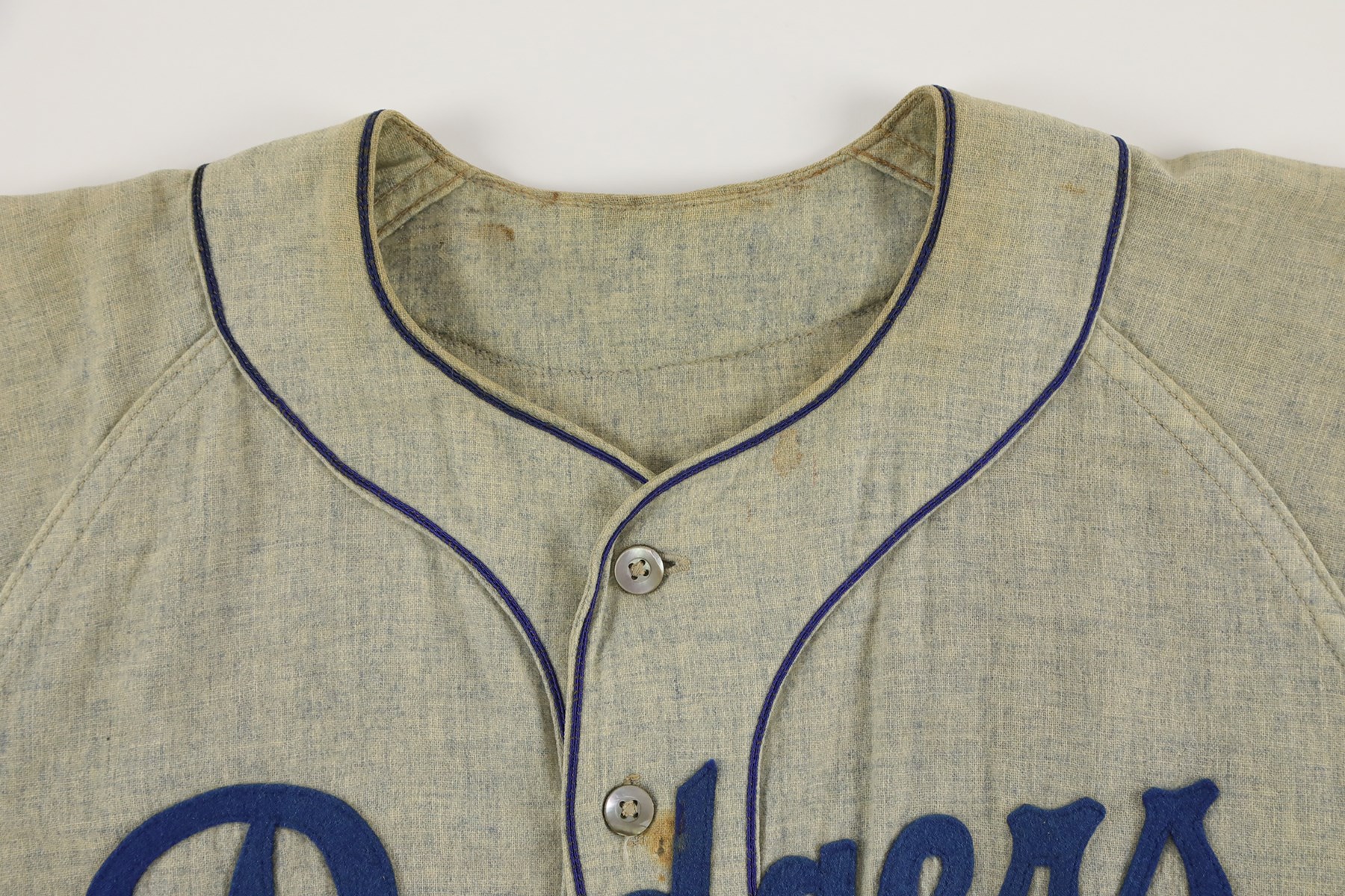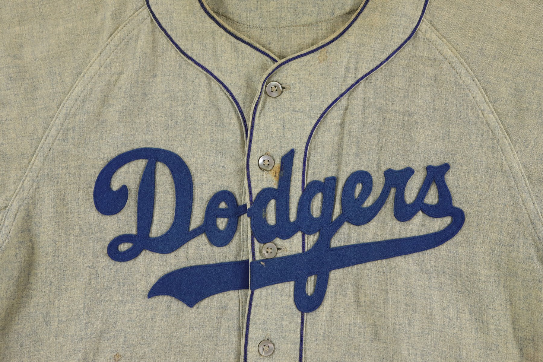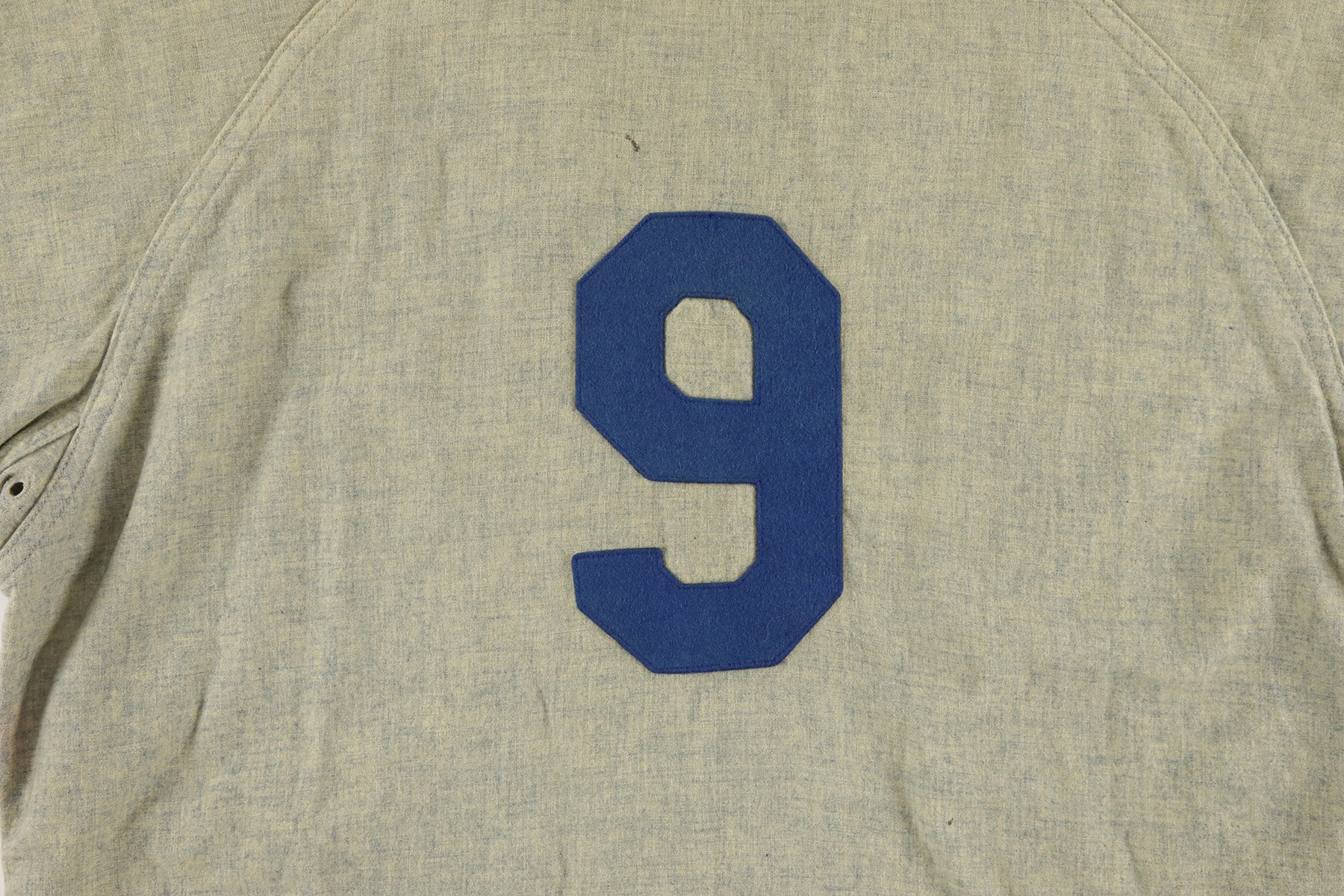 Brooklyn Dodgers road jersey worn by outfielder Gino Cimoli in 1956. The gray flannel jersey is lettered "Dodgers" across the front and features the number "9" on the reverse. All letters and numerals are applied in blue felt. Located on the left front tail are a "Rawlings Hall of Fame Flannel" label and an adjacent "42" size tag. The name "Cimoli" is chain-stitched in blue, directly below the manufacturer's label. Located on the interior left front tail are a wash tag and a flag tag reading "Set 1 1956." The jersey is original as issued and displays heavy wear, including light scattered staining (mainly on the front) and a few small holes. 1956 marked Gino Cimoli's first season in the Majors. Appearing in 73 games, Cimoli batted .111 with no home runs and just 4 RBI. The following season he became a starter in the outfield, batting .293 with 10 home runs and 57 RBI. He retired in 1965 with 44 home runs, 321 RBI, and a .265 lifetime average.