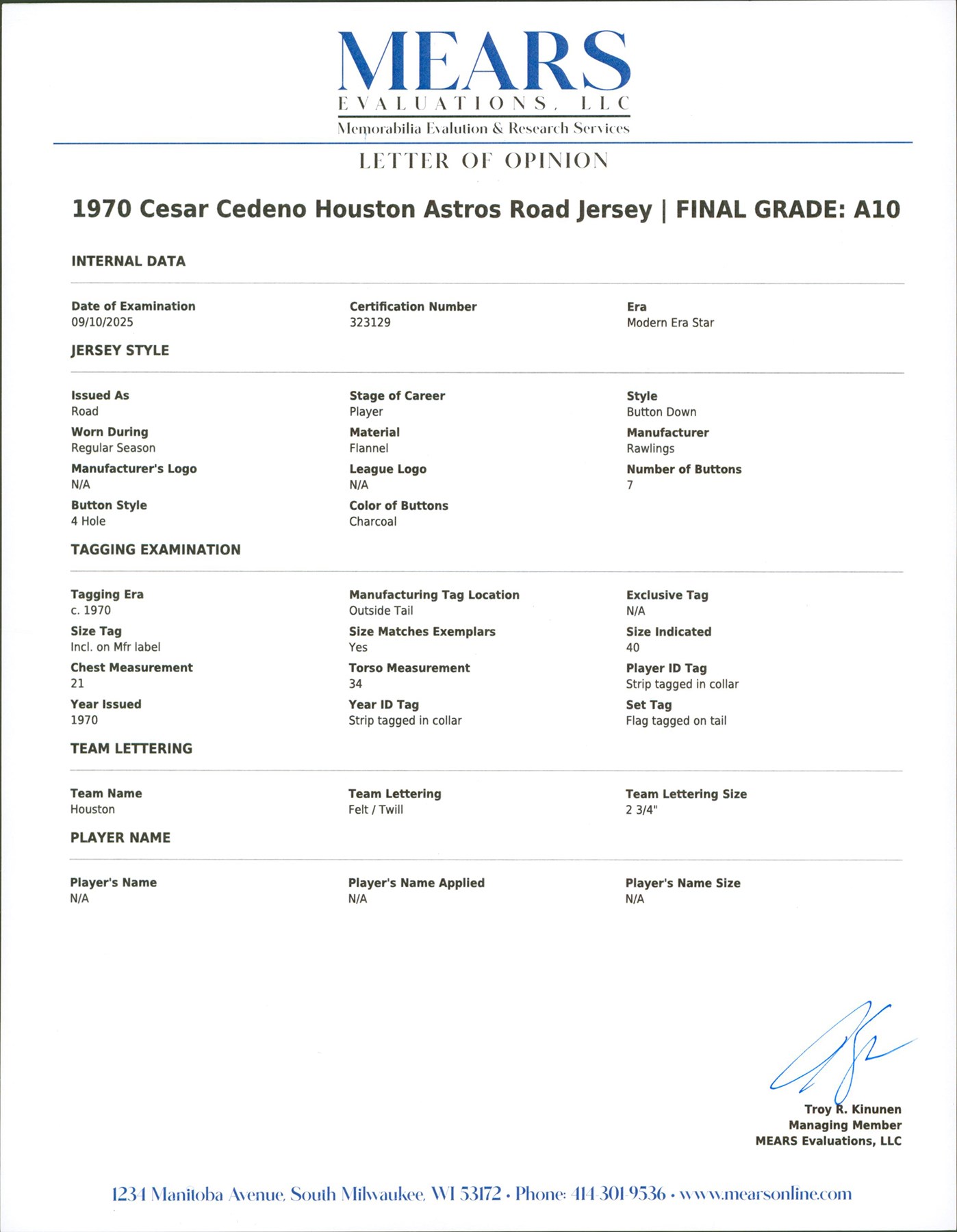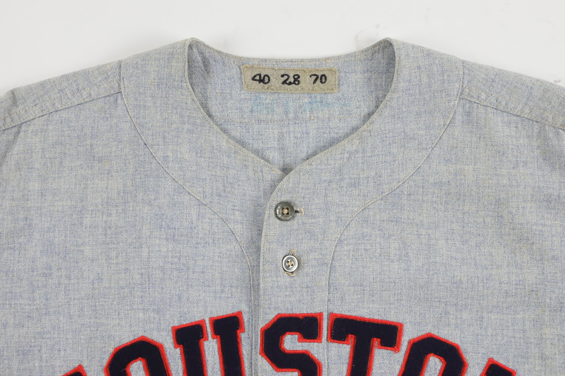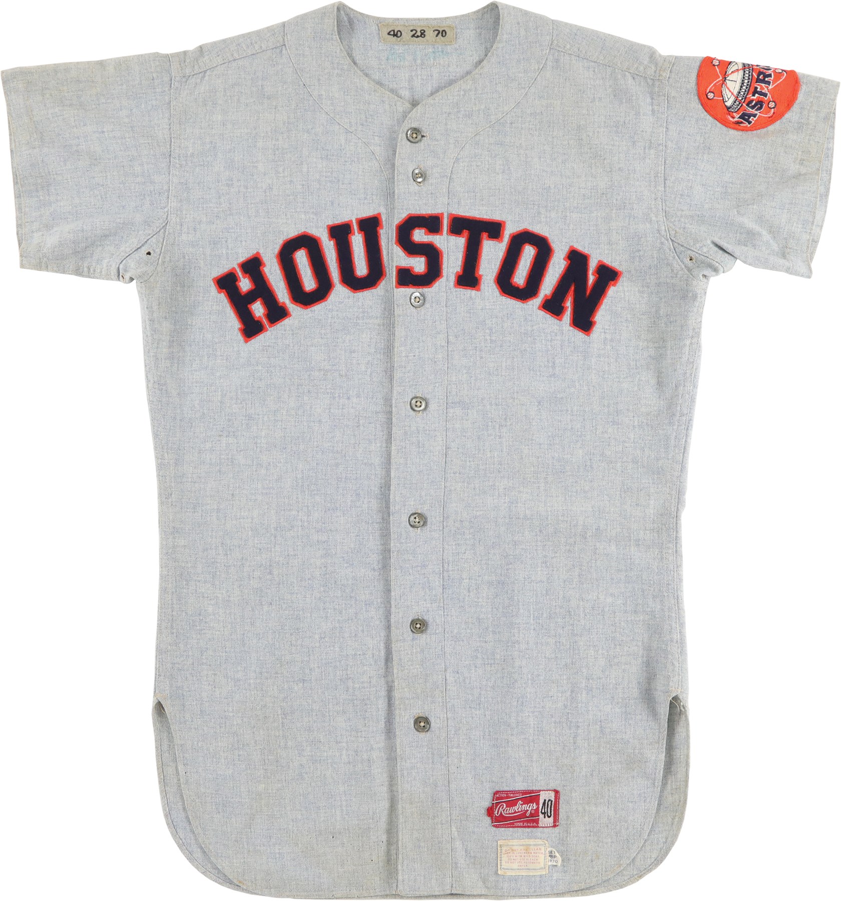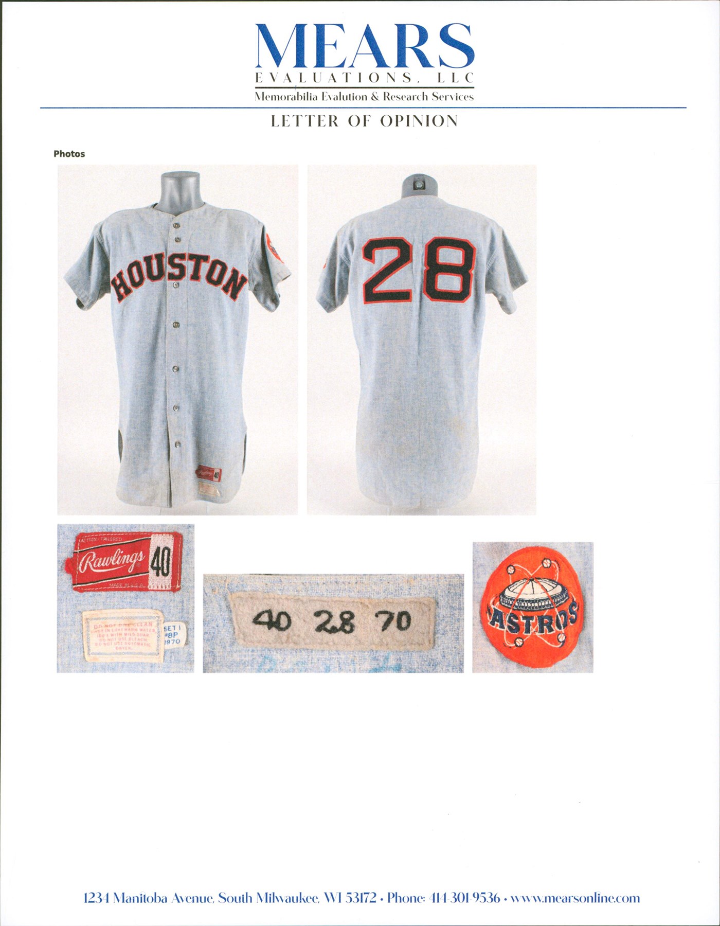 1970 Cesar Cedeno Houston Astros game worn rookie season jersey. A patch is at the inside neck area of the charcoal-colored button down jersey that reads, "40 28 70". A Rawlings size 40 patch is sewn to the front left tail of the jersey, just above a laundry patch. Attached to the laundry patch is a tag that has the following text: "SET 1 #8P, 1970". "HOUSTON" is sewn across the chest of the jersey, and an Astros patch is sewn to the left shoulder. Cedeno's number 28 is sewn to the back of the jersey. 1970 was Cedeno's rookie year, and he can be seen wearing this style jersey on his 1971 Topps baseball card. Includes a full LOA from MEARS.