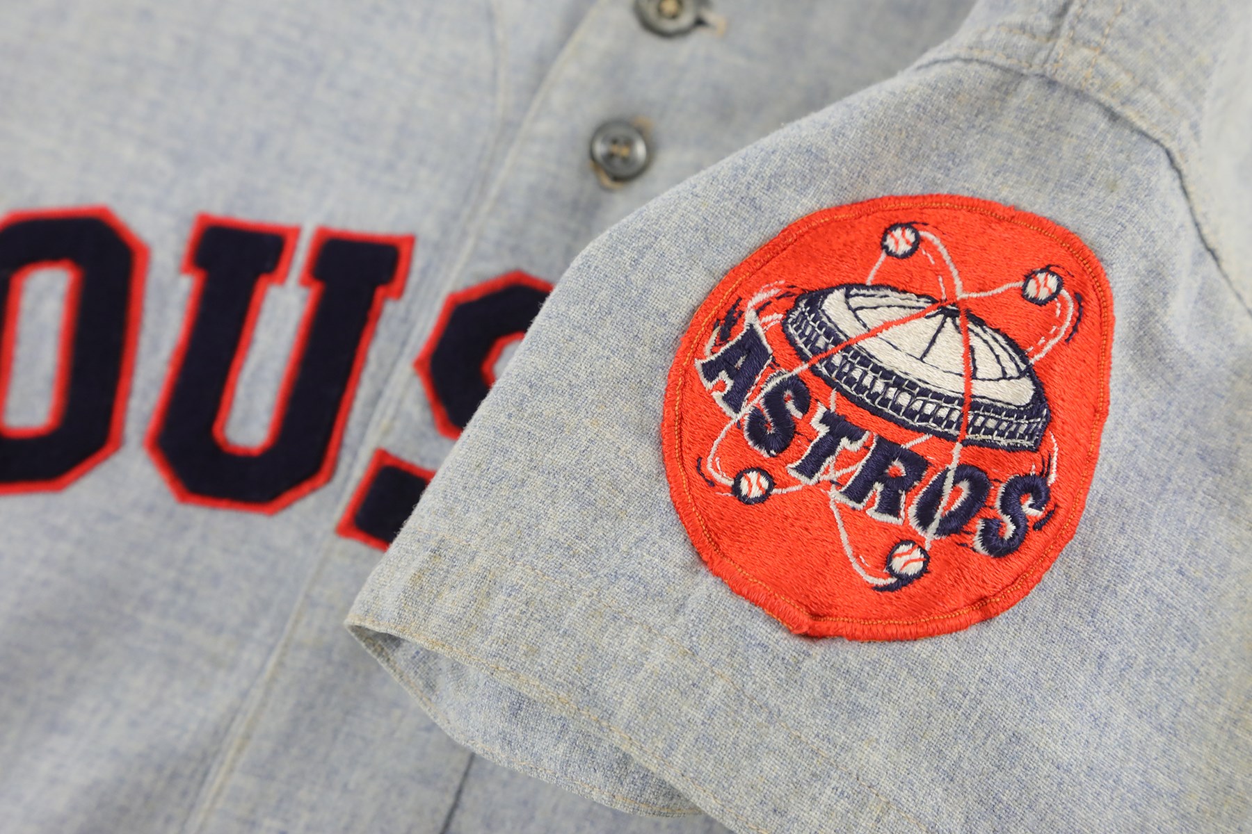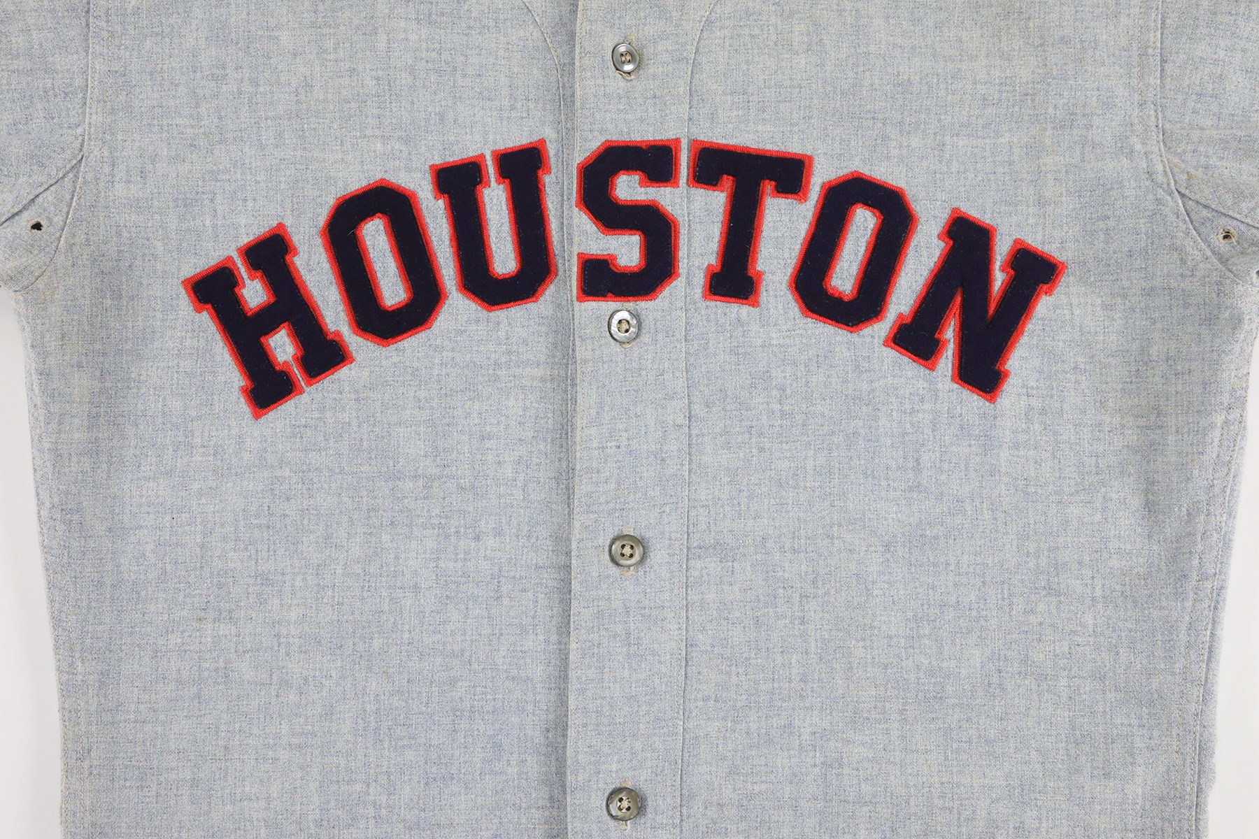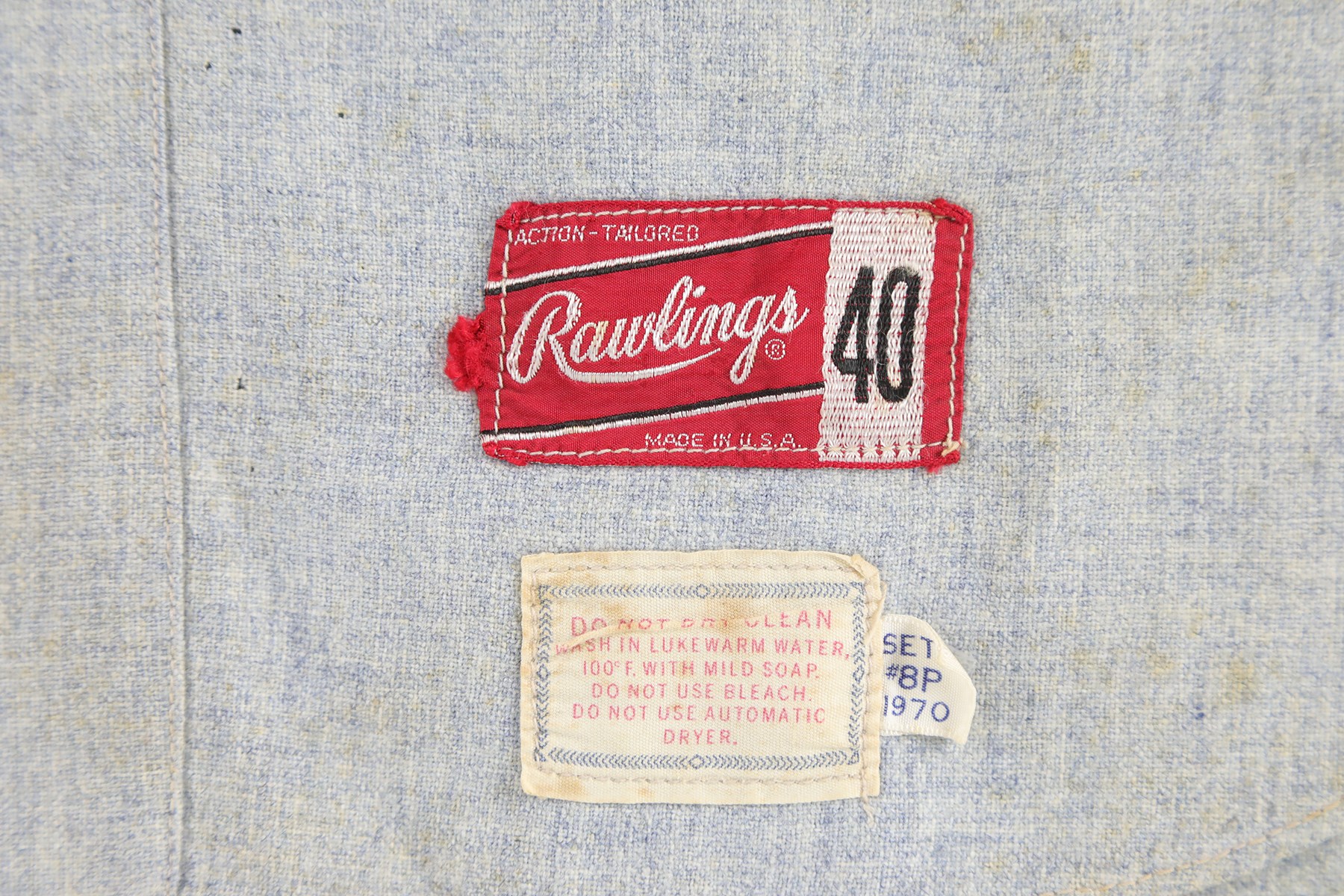 1970 Cesar Cedeno Houston Astros game worn rookie season jersey. A patch is at the inside neck area of the charcoal-colored button down jersey that reads, "40 28 70". A Rawlings size 40 patch is sewn to the front left tail of the jersey, just above a laundry patch. Attached to the laundry patch is a tag that has the following text: "SET 1 #8P, 1970". "HOUSTON" is sewn across the chest of the jersey, and an Astros patch is sewn to the left shoulder. Cedeno's number 28 is sewn to the back of the jersey. 1970 was Cedeno's rookie year, and he can be seen wearing this style jersey on his 1971 Topps baseball card. Includes a full LOA from MEARS.