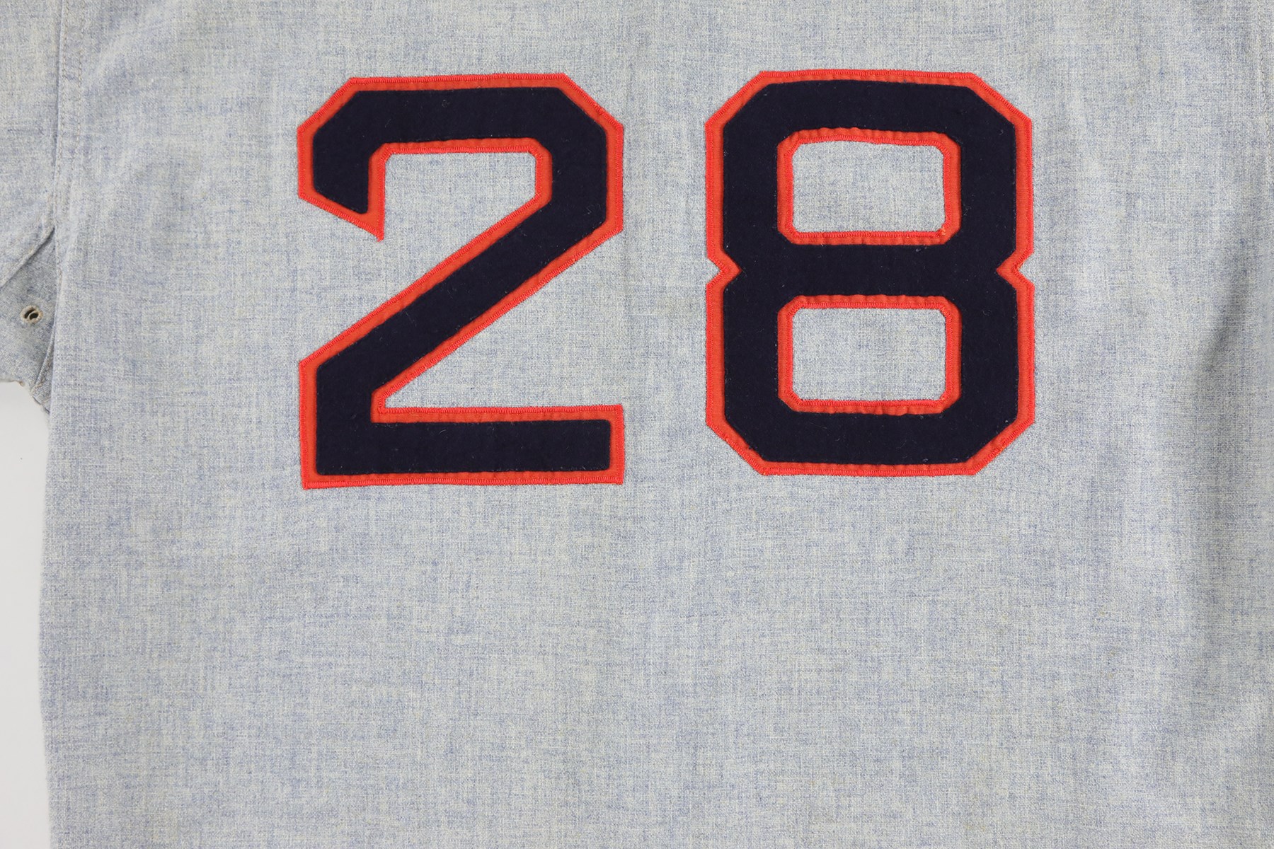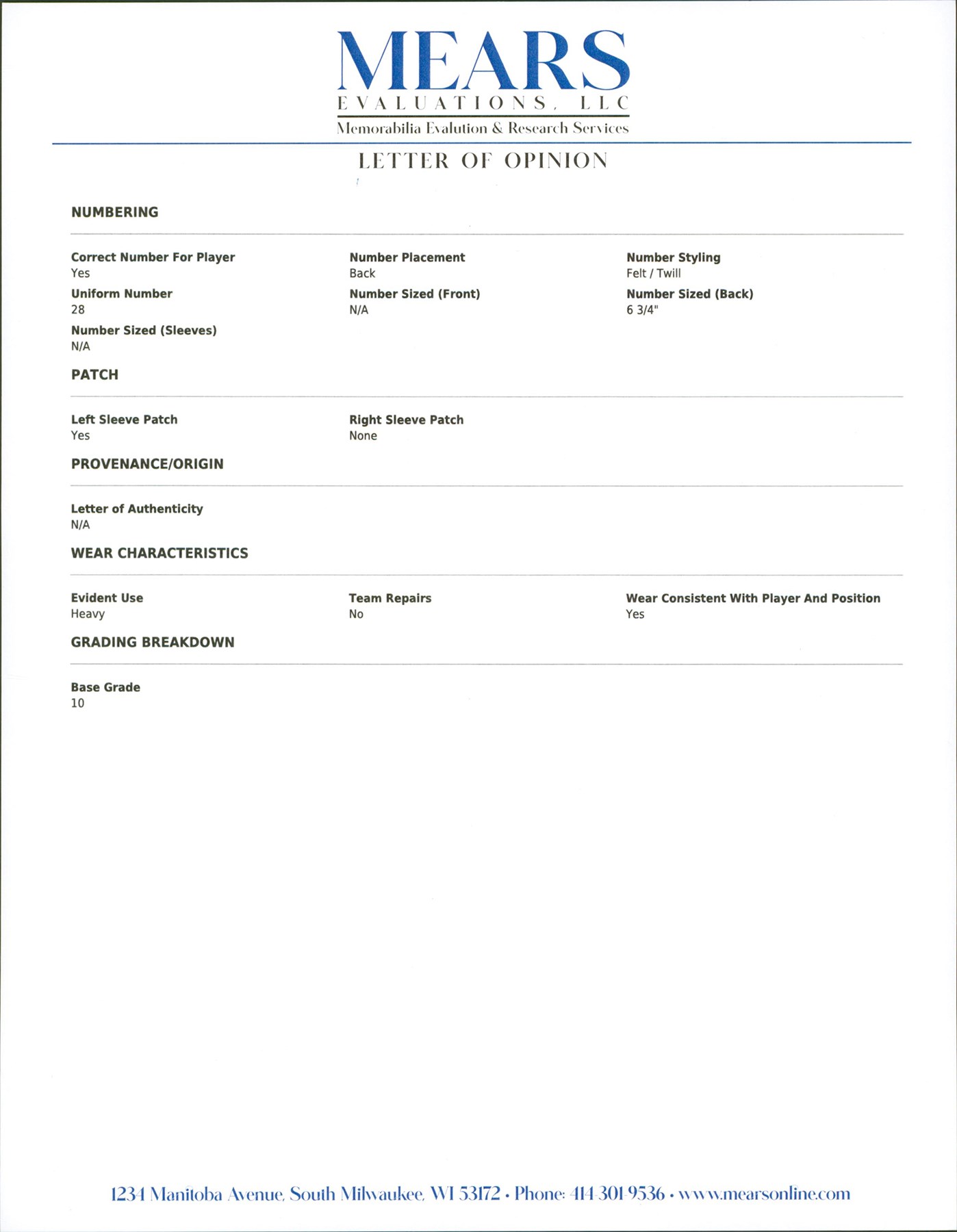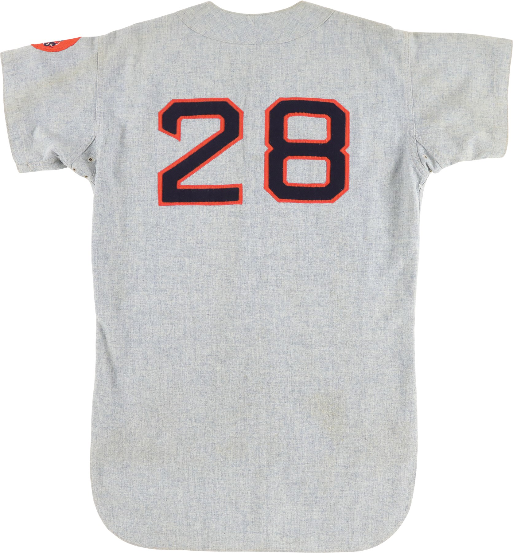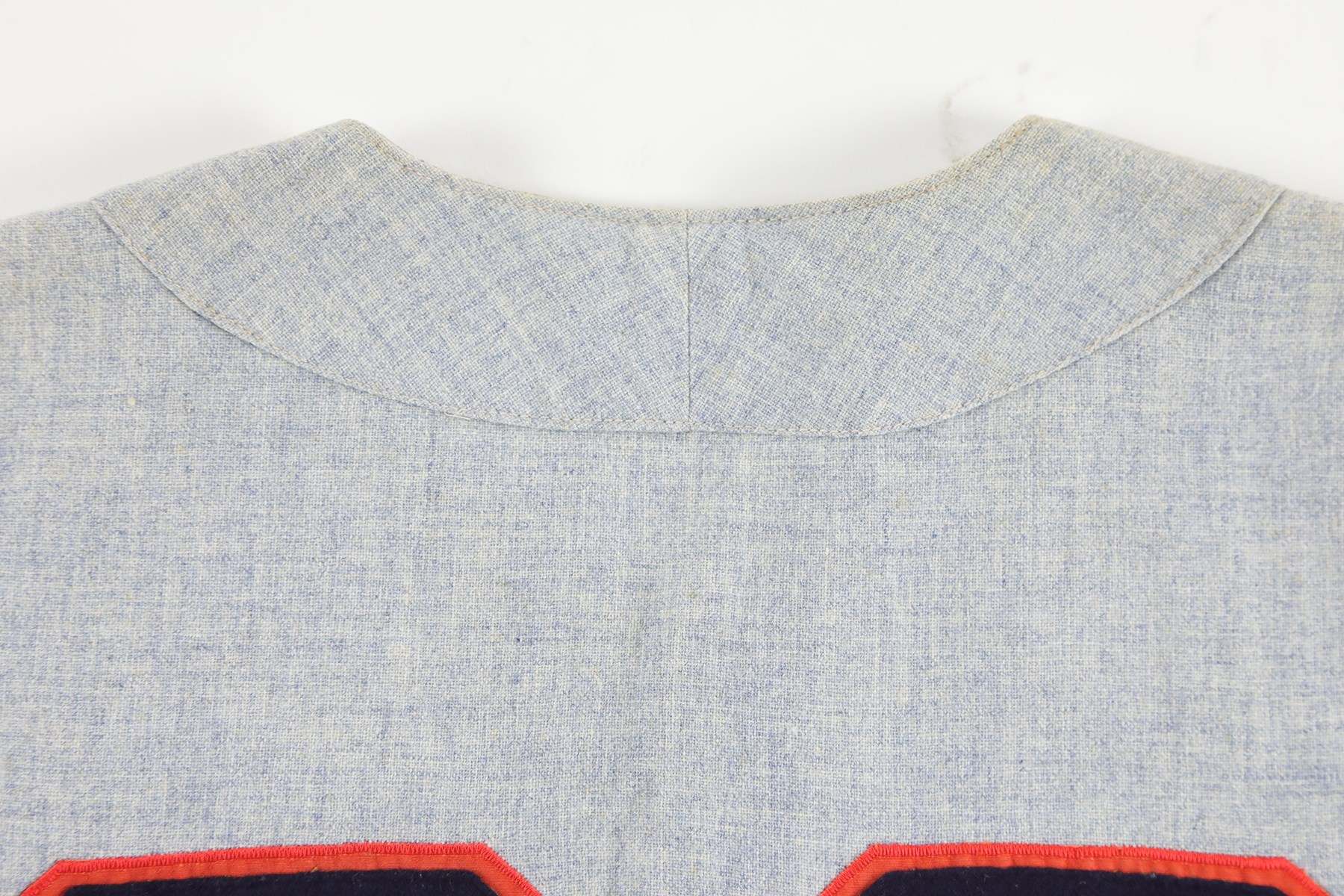 1970 Cesar Cedeno Houston Astros game worn rookie season jersey. A patch is at the inside neck area of the charcoal-colored button down jersey that reads, "40 28 70". A Rawlings size 40 patch is sewn to the front left tail of the jersey, just above a laundry patch. Attached to the laundry patch is a tag that has the following text: "SET 1 #8P, 1970". "HOUSTON" is sewn across the chest of the jersey, and an Astros patch is sewn to the left shoulder. Cedeno's number 28 is sewn to the back of the jersey. 1970 was Cedeno's rookie year, and he can be seen wearing this style jersey on his 1971 Topps baseball card. Includes a full LOA from MEARS.
