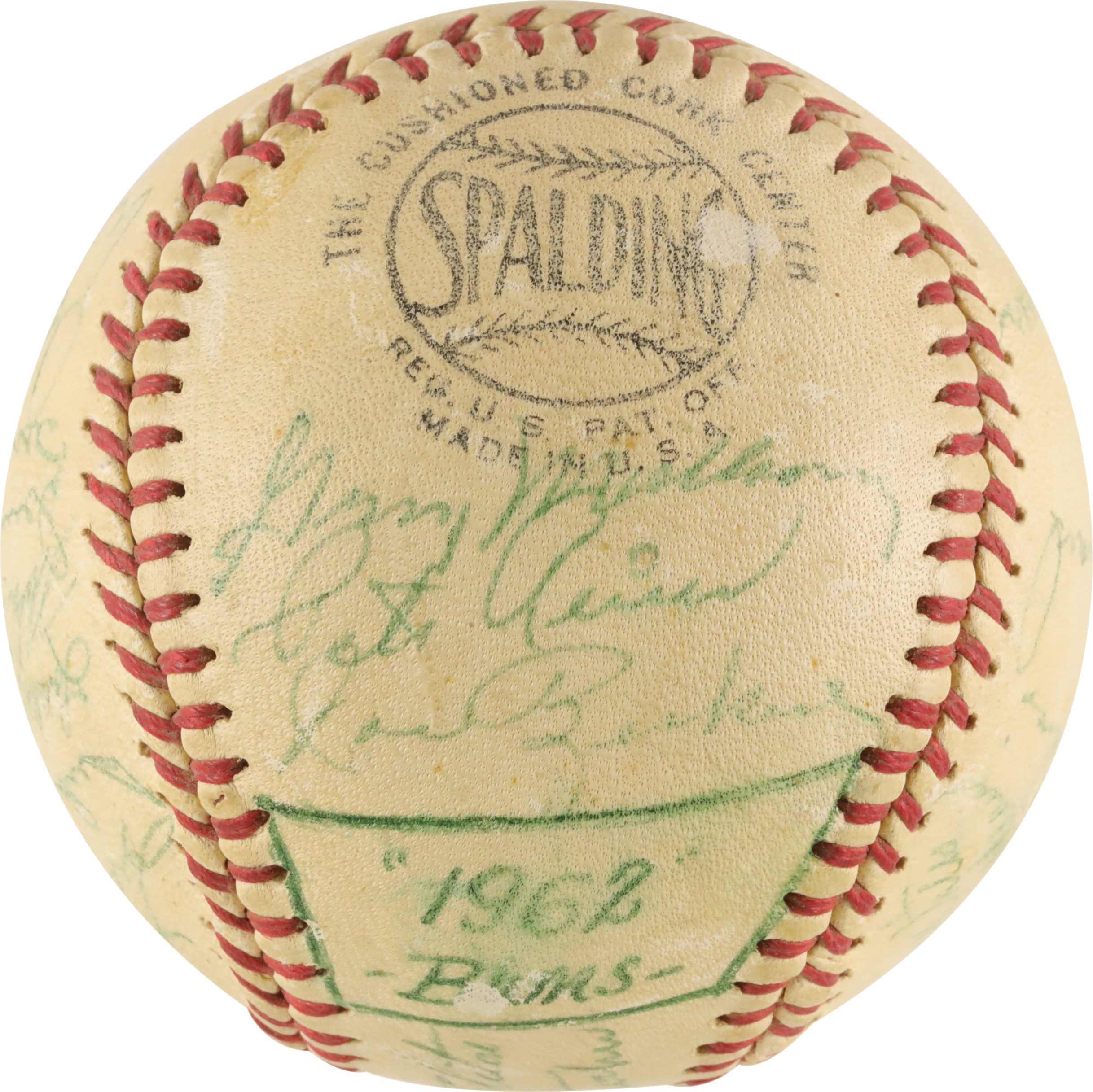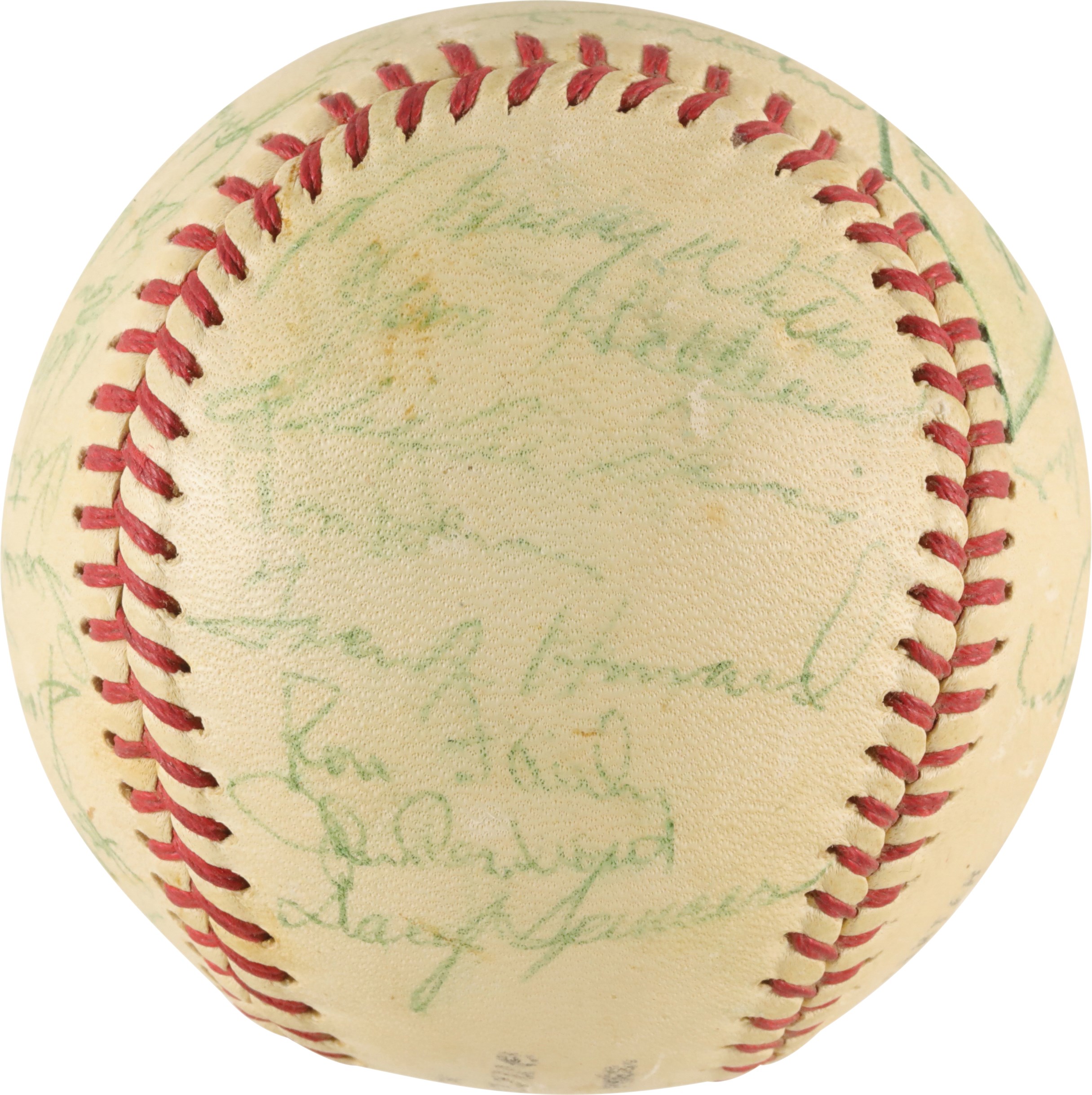 Presented is a 1962 Los Angeles Dodgers' team-signed ball with six Hall of Famers. The '62 Dodgers had a 102-63 record, for second place in the National League. Signing on the sweet spot are Hall of Fame managers Walt Alston, the 1962 Dodgers' manager, and Leo Durocher, the former manager of the Brooklyn Dodgers, New York Giants, Chicago Cubs and Houston Astros, who was a coach with the 1962 Dodgers. Other Hall of Famers: Sandy Koufax (who was the NL ERA Champ in the '62 season), Don Drysdale (who won the '62 NL Cy Young), Duke Snider and Maury Wills (who led the NL in steals in '62, with an all-time NL high of 104.  Stars: Stan Williams, Joe Moeller, Jim "Junior" Gilliam (slightly blurred), Larry Sherry, Johnny Podres, Lee Walls, Ron Fairly, and Wally Moon. Plus, Pete Reiser (coach), Andy Carey, Larry Burright, Daryl Spencer, Ed Roebuck, and MORE.