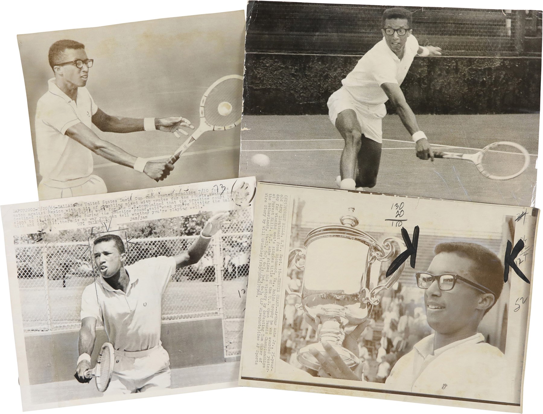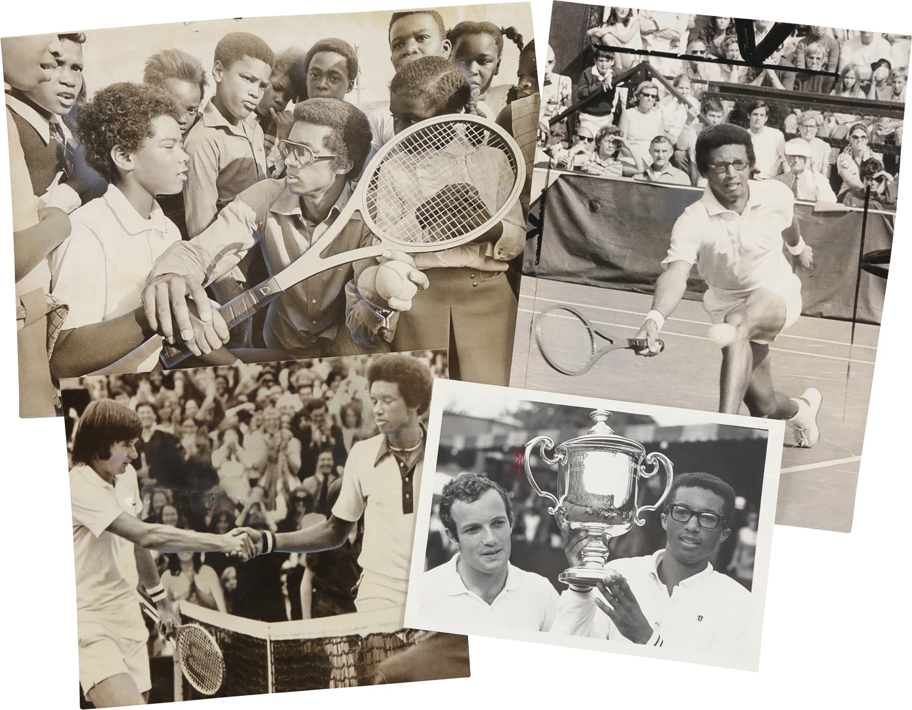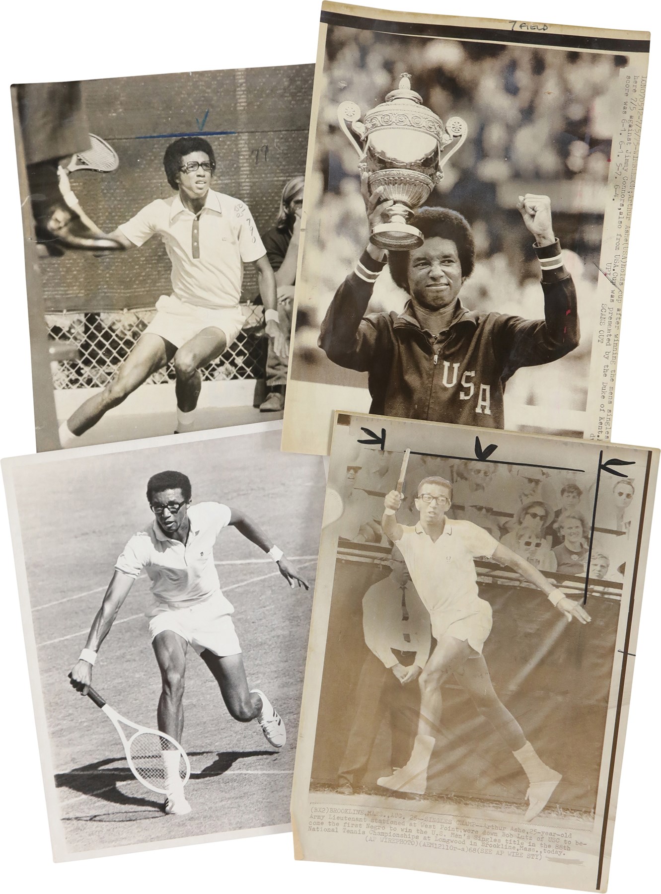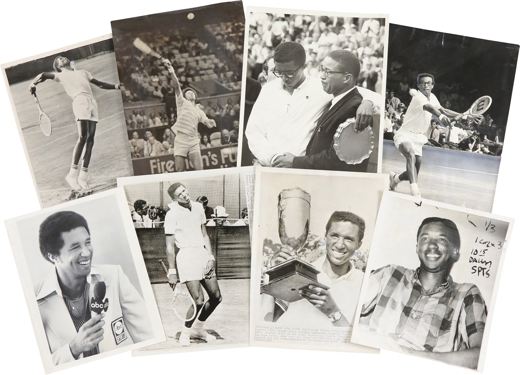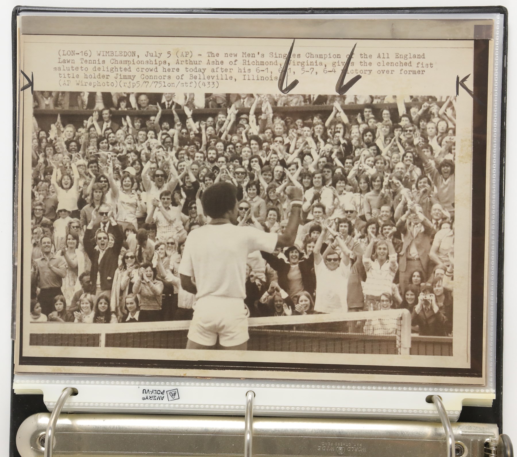 Large collection of 108 vintage news photographs capturing legendary tennis player Arthur Ashe, who was the first African American to win singles titles at Wimbledon, the Australian Open, and the U.S. Open. Nearly all the photos, which date primarily from the 1960s and 1970s, capture Ashe on the court, either at practice or during a match, and sometimes posing for the camera. Of the 108 photos in the collection, nearly 63% (68) are wire photos, with the caption either embedded in the photo or cut and affixed to the reverse (wire photos are not original photos, they were transmitted over phone lines and are similar to a fax). The photos vary in size, ranging from approximately, 3.5x4.25" to 8.5x11", with most measuring either 7x9" or 8x10". Because these were all working press photos, many display editorial crop marks and/or written notations on the front. Most display credit stamps on the reverse. Very Good condition overall. This is an outstanding and significant photograph collection chronicling the career of one of the most important and influential tennis players of the modern era. Please note: none of the photos in this collection have been submitted to PSA for evaluation, so no guarantees are made regarding specific Type designations.
