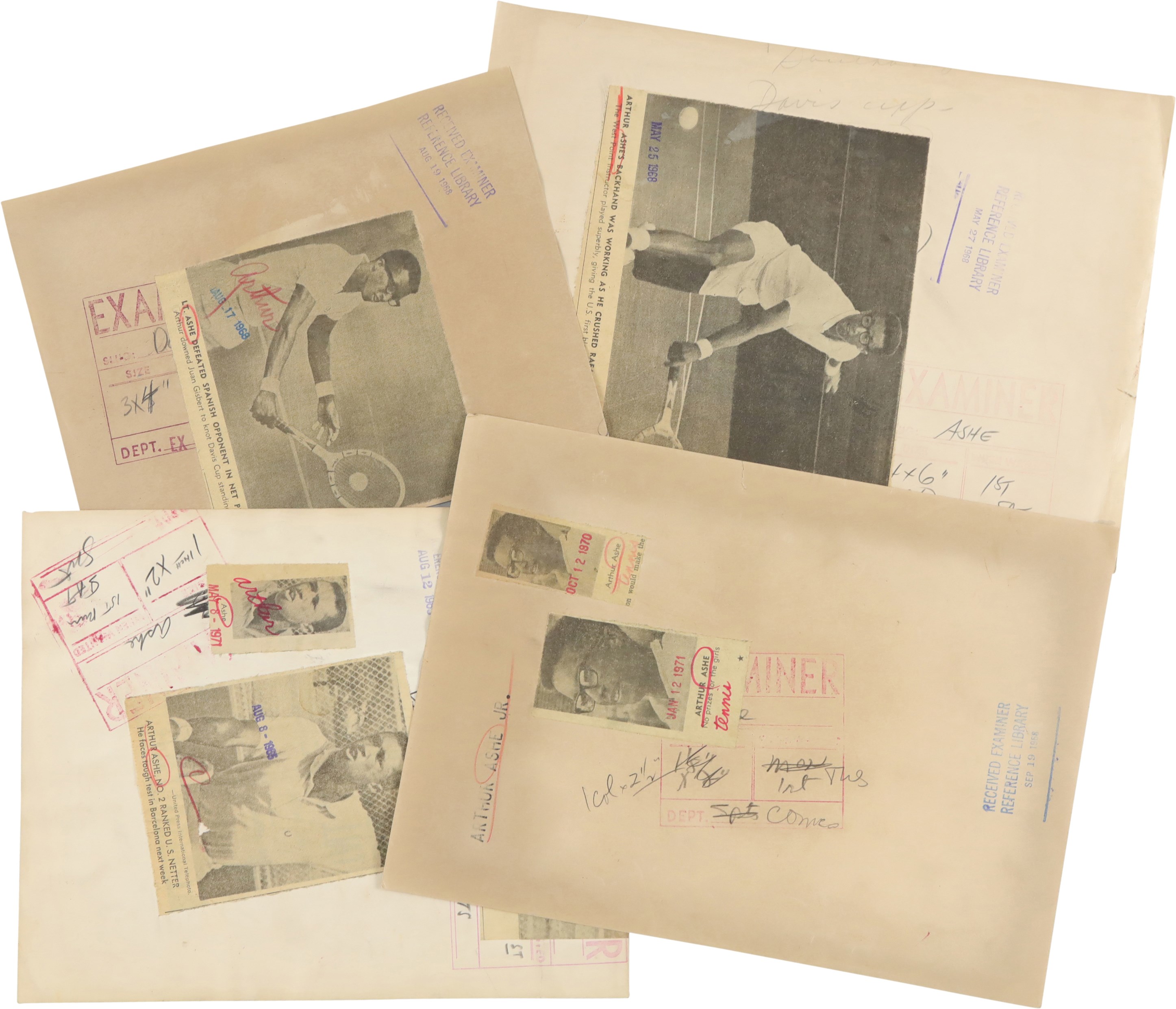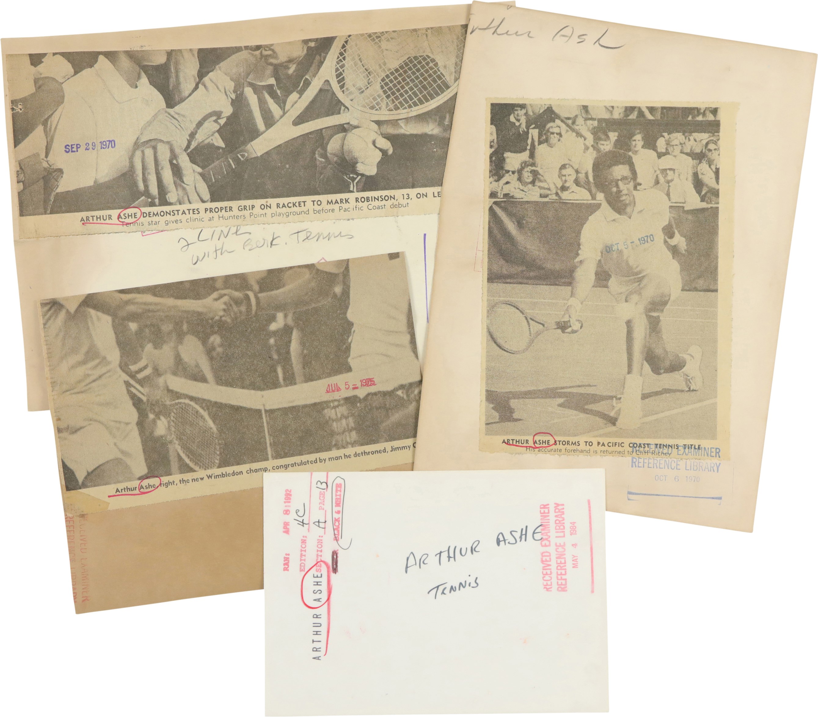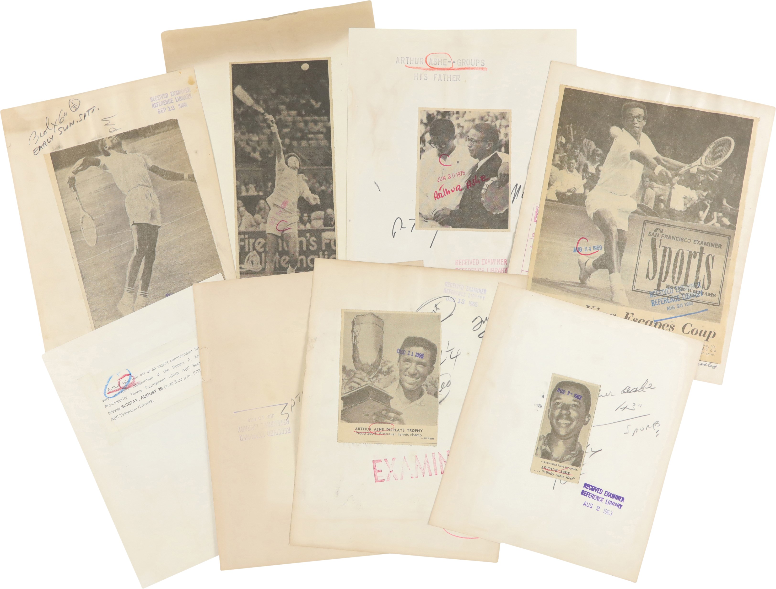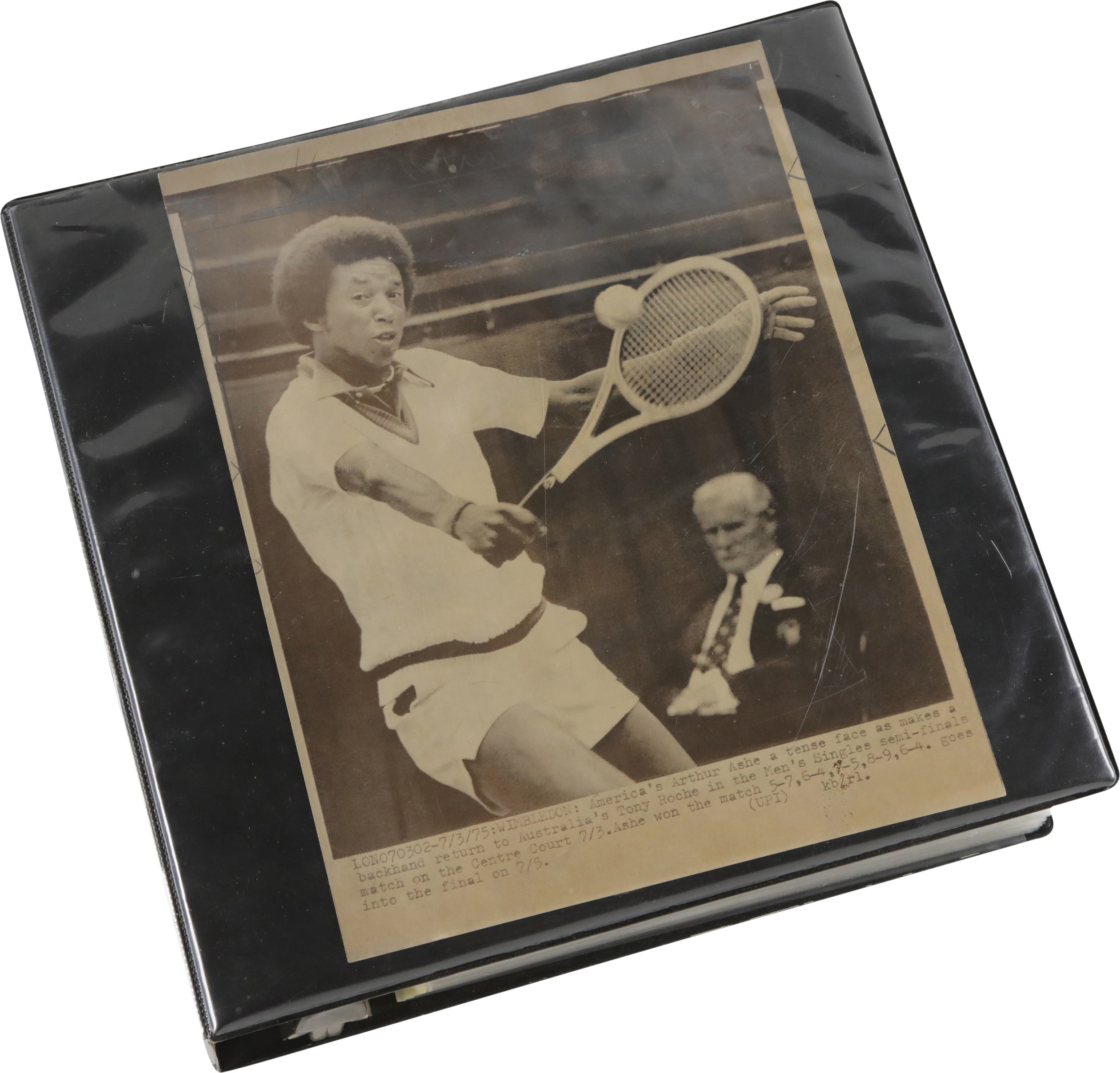 Large collection of 108 vintage news photographs capturing legendary tennis player Arthur Ashe, who was the first African American to win singles titles at Wimbledon, the Australian Open, and the U.S. Open. Nearly all the photos, which date primarily from the 1960s and 1970s, capture Ashe on the court, either at practice or during a match, and sometimes posing for the camera. Of the 108 photos in the collection, nearly 63% (68) are wire photos, with the caption either embedded in the photo or cut and affixed to the reverse (wire photos are not original photos, they were transmitted over phone lines and are similar to a fax). The photos vary in size, ranging from approximately, 3.5x4.25" to 8.5x11", with most measuring either 7x9" or 8x10". Because these were all working press photos, many display editorial crop marks and/or written notations on the front. Most display credit stamps on the reverse. Very Good condition overall. This is an outstanding and significant photograph collection chronicling the career of one of the most important and influential tennis players of the modern era. Please note: none of the photos in this collection have been submitted to PSA for evaluation, so no guarantees are made regarding specific Type designations.