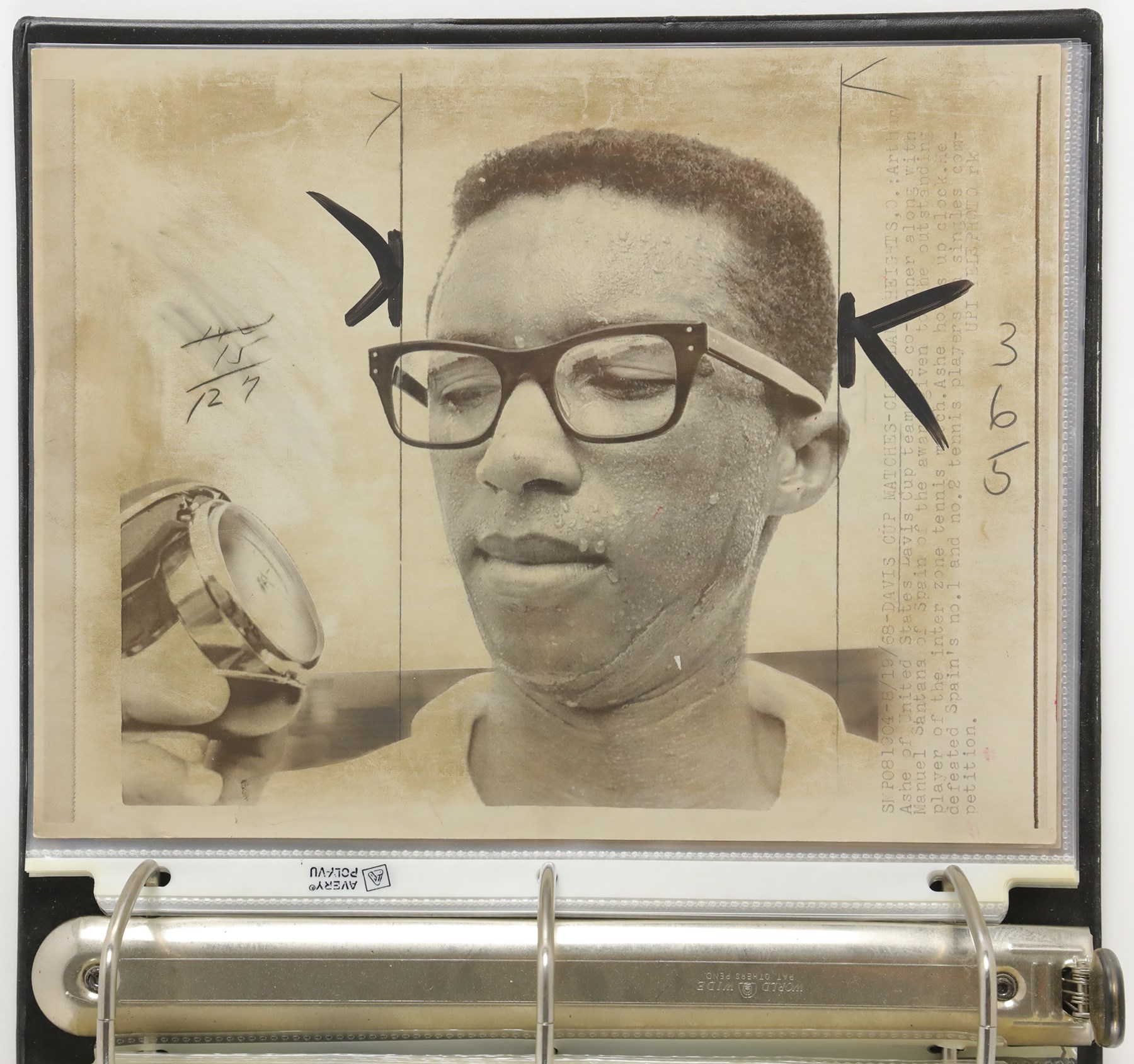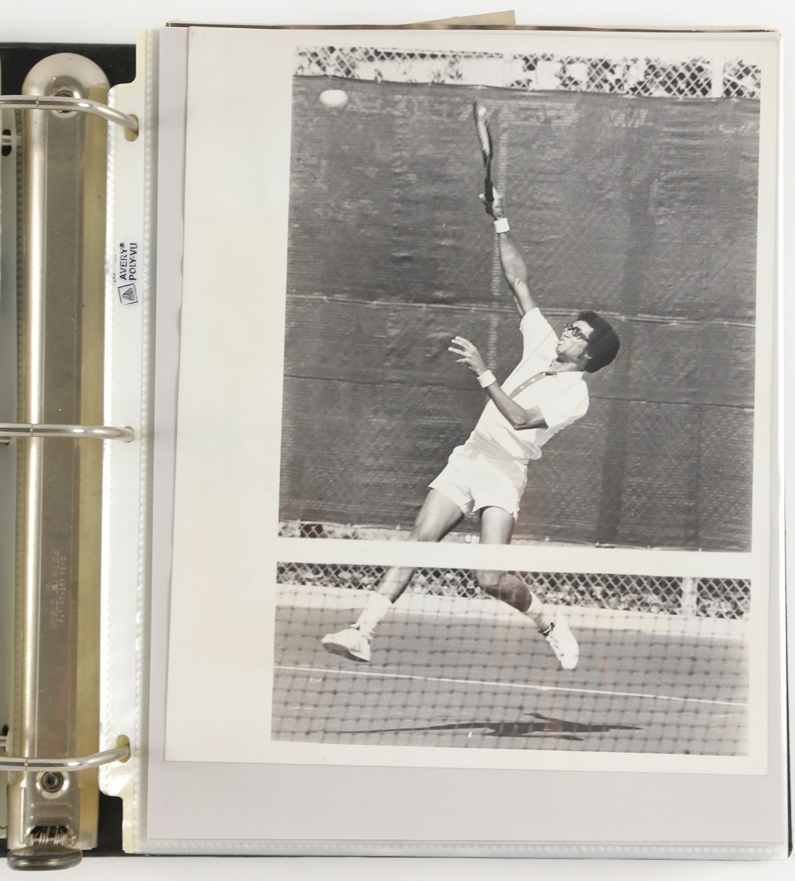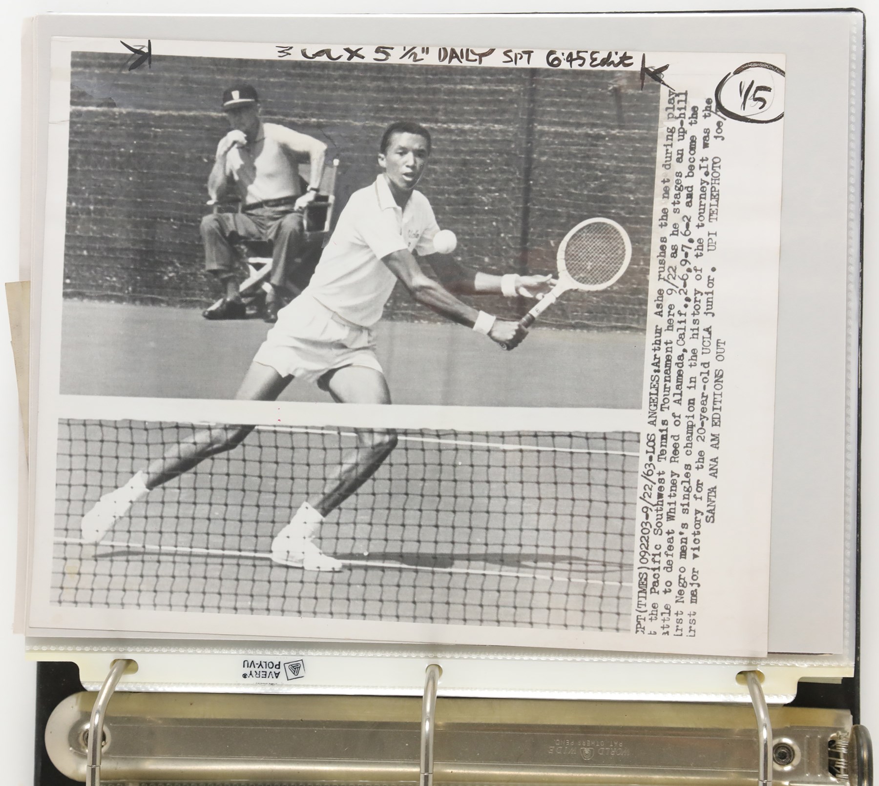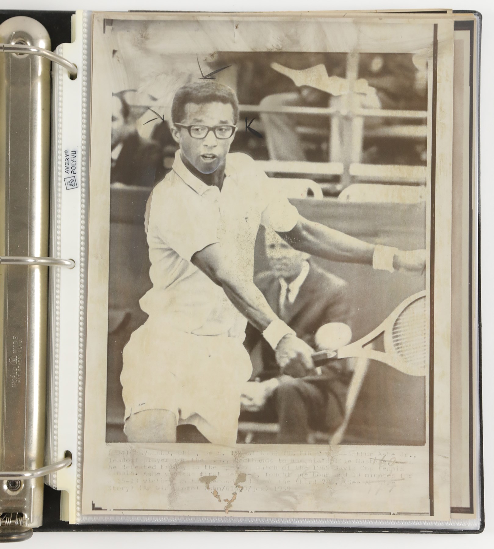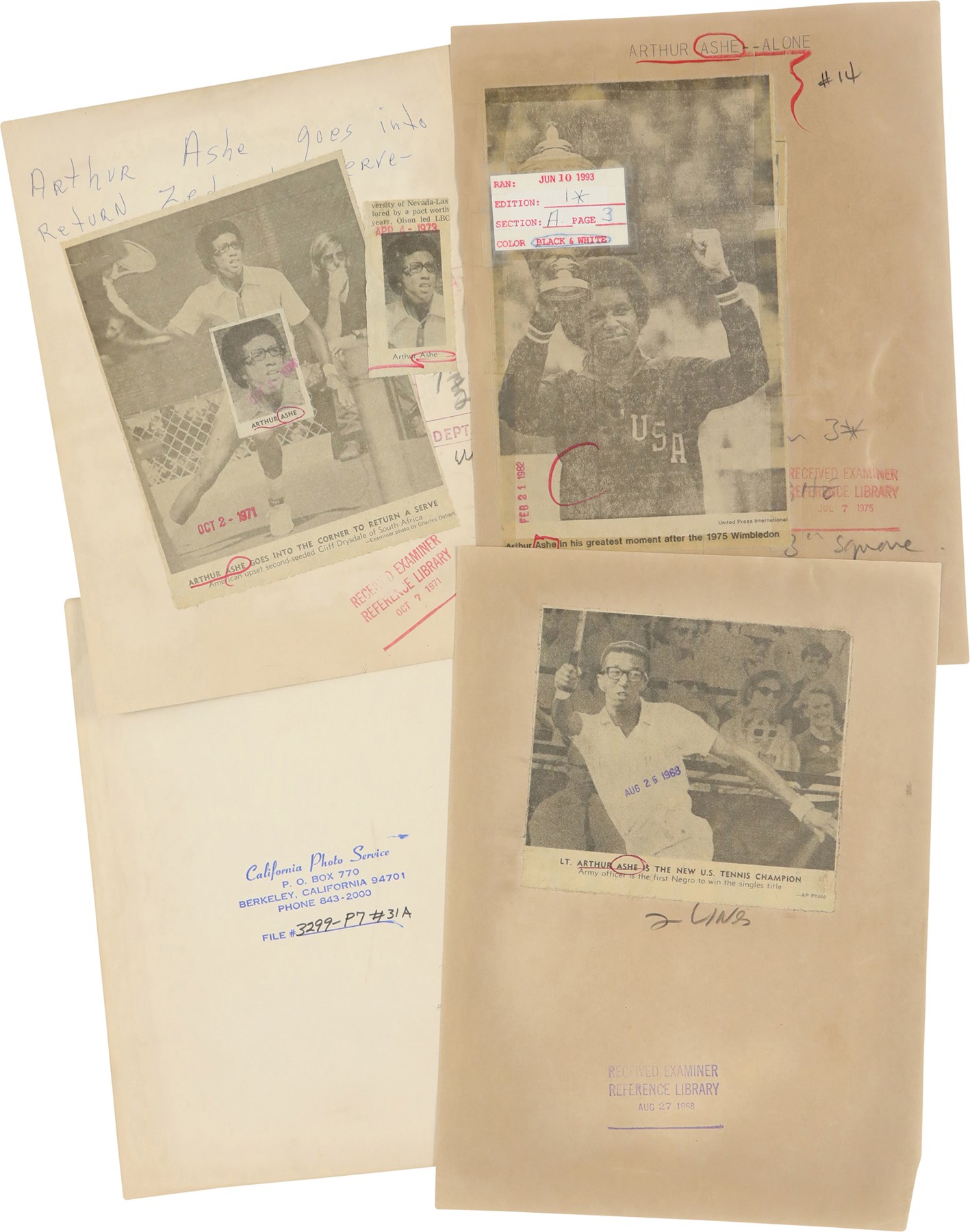Large collection of 108 vintage news photographs capturing legendary tennis player Arthur Ashe, who was the first African American to win singles titles at Wimbledon, the Australian Open, and the U.S. Open. Nearly all the photos, which date primarily from the 1960s and 1970s, capture Ashe on the court, either at practice or during a match, and sometimes posing for the camera. Of the 108 photos in the collection, nearly 63% (68) are wire photos, with the caption either embedded in the photo or cut and affixed to the reverse (wire photos are not original photos, they were transmitted over phone lines and are similar to a fax). The photos vary in size, ranging from approximately, 3.5x4.25" to 8.5x11", with most measuring either 7x9" or 8x10". Because these were all working press photos, many display editorial crop marks and/or written notations on the front. Most display credit stamps on the reverse. Very Good condition overall. This is an outstanding and significant photograph collection chronicling the career of one of the most important and influential tennis players of the modern era. Please note: none of the photos in this collection have been submitted to PSA for evaluation, so no guarantees are made regarding specific Type designations.