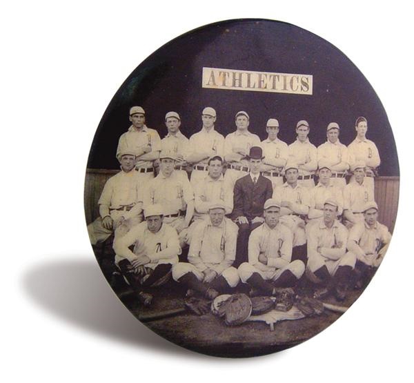 This jewel boasts a fabulous team photo of Philadelphia's long-departed American League team. The golden days of Connie Mack. Mack at center surrounded by 19 members of that storied Athletics team including Bender, Waddell & Plank. "Athletics" across the top. Back is tarnished, front is Excellent. 1.75" in diameter. Rare and amazing.