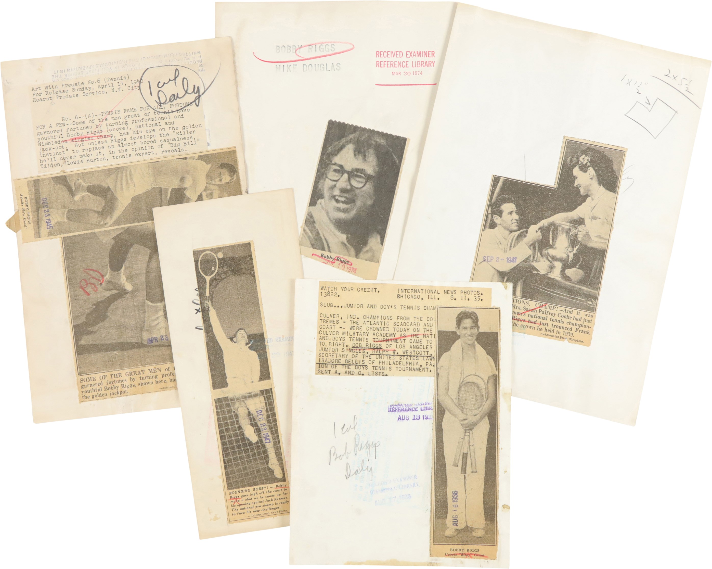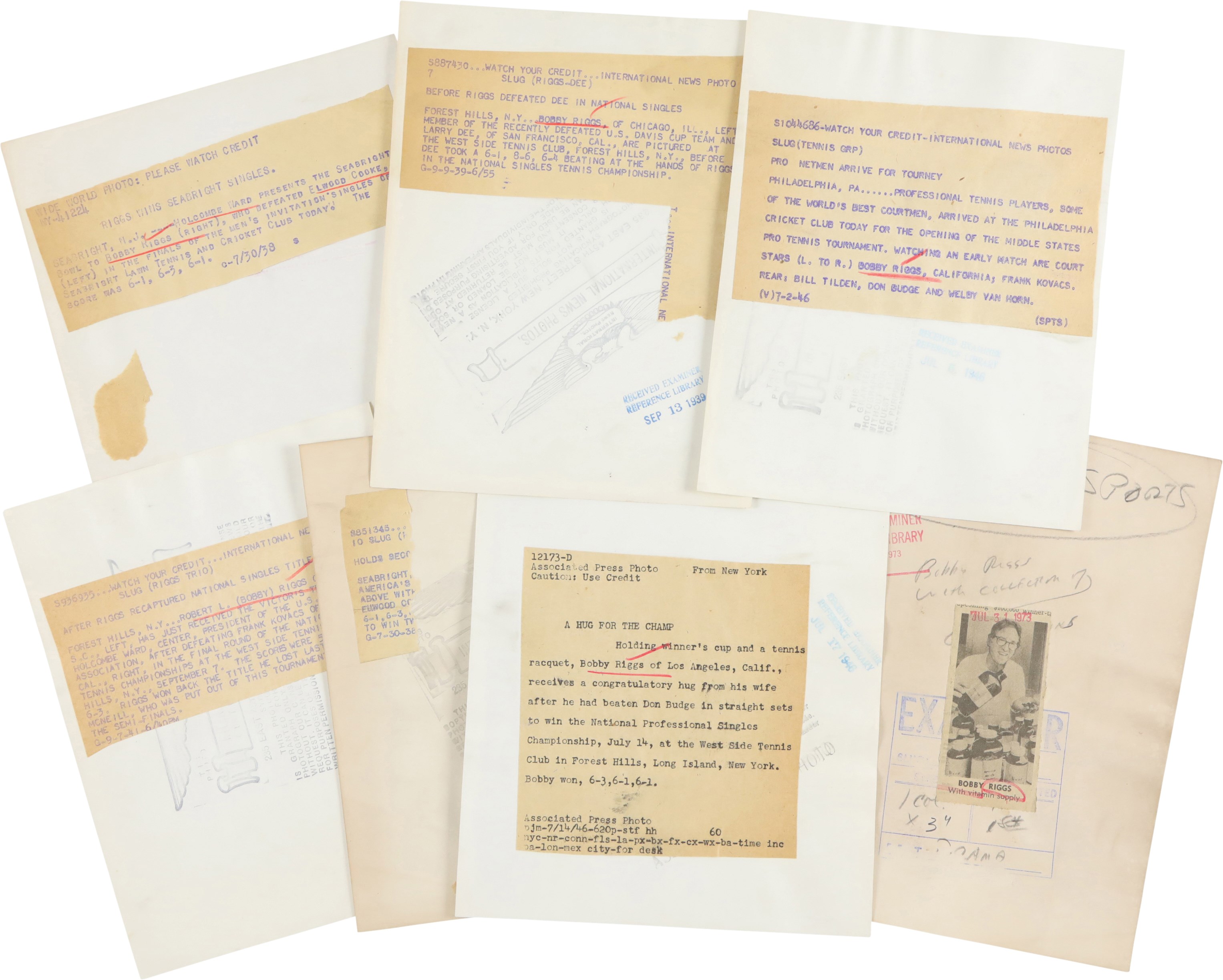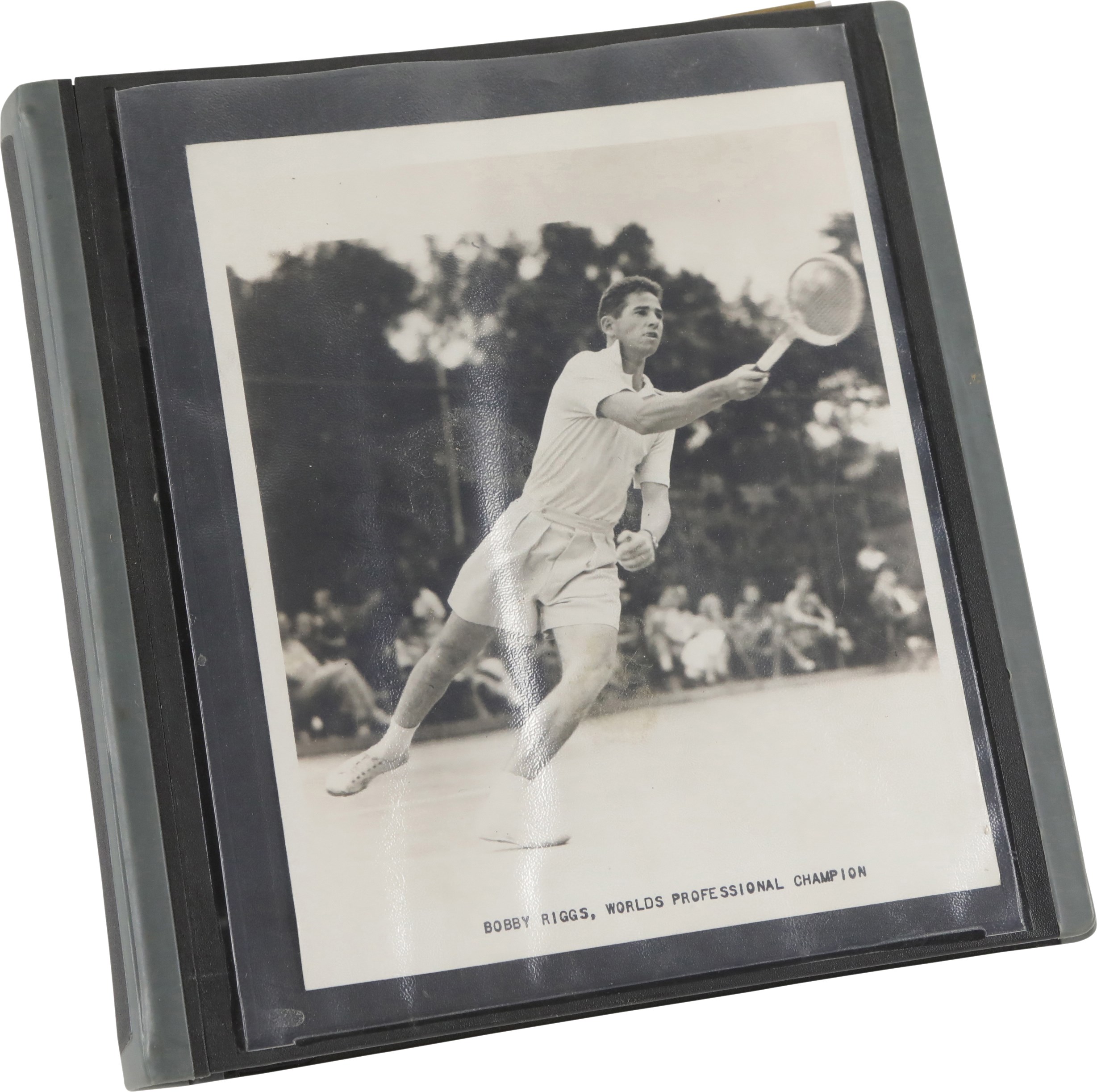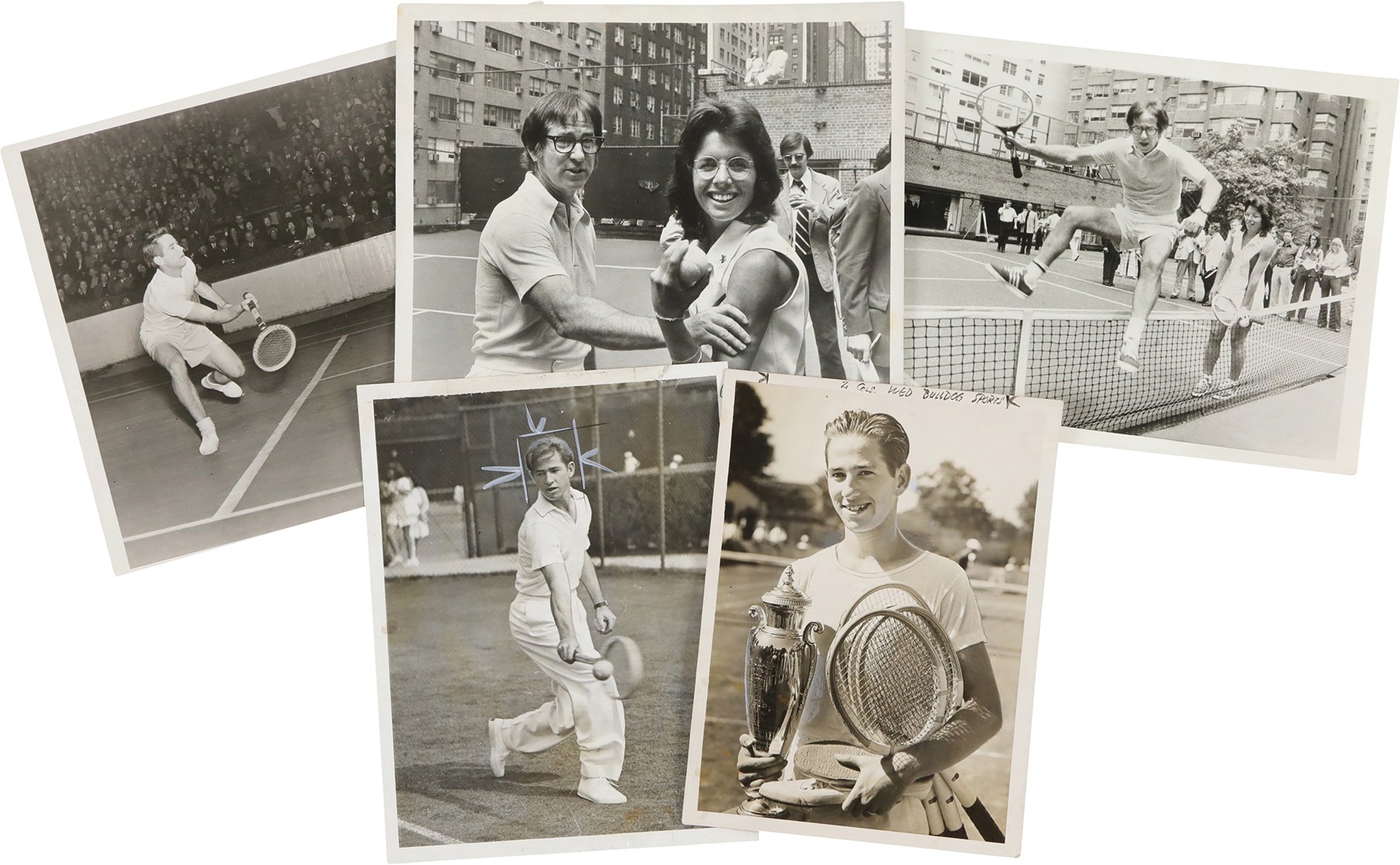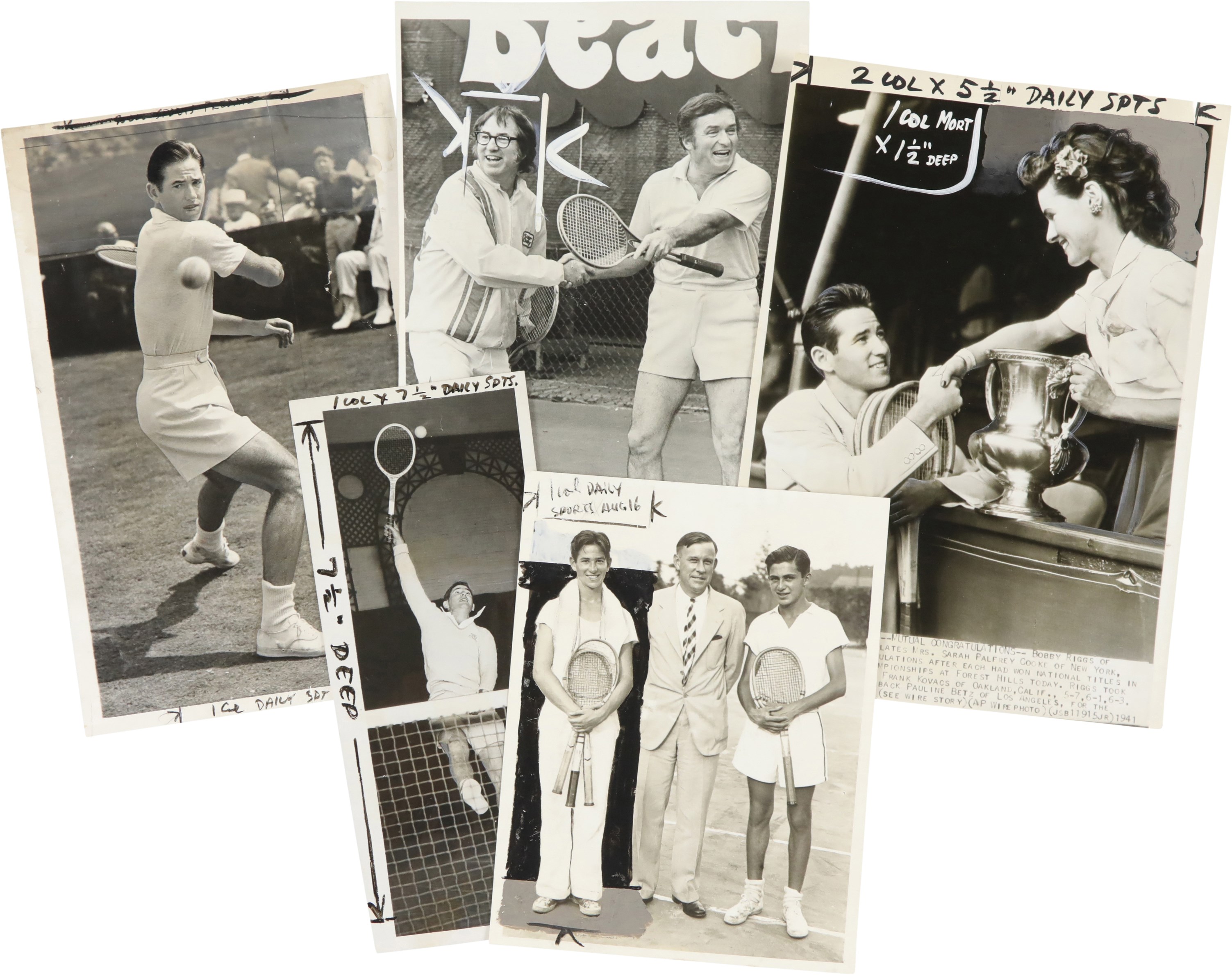 Collection of 46 vintage news photographs, dating from the late 1930s to the 1970s, capturing legendary tennis player Bobby Riggs. Although Riggs was the world number one men's tennis player in 1946 and 1947, he is best remembered today for his famous "Battle of the Sexes" match against Billie Jean King in 1973. This collection features two photos of Riggs and King posing on the court together prior to their historic match, but the majority date to Riggs' amateur and professional career in the 1930s and 1940s. Of the 46 photos in the collection, nearly 33% (15) are wire photos, with the caption embedded in the photo (wire photos are not original photos, they were transmitted over phone lines and are similar to a fax). The photos vary in size, ranging from approximately, 4.5x7" to 8x11", with most measuring either 7x9" or 8x10". Because these were all working press photos, many display editorial crop marks and/or written notations on the front. Many display credit stamps and/or the original paper news caption on the reverse. Very Good to Excellent condition overall. Please note: none of the photos in this collection have been submitted to PSA for evaluation, so no guarantees are made regarding specific Type designations.