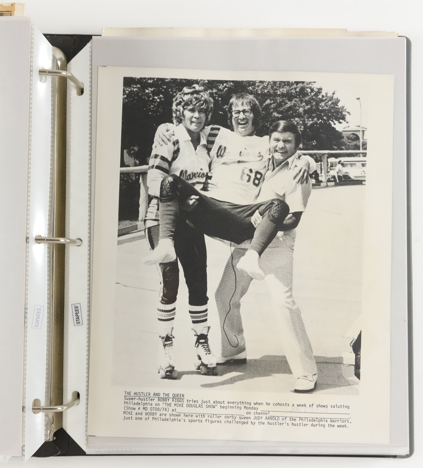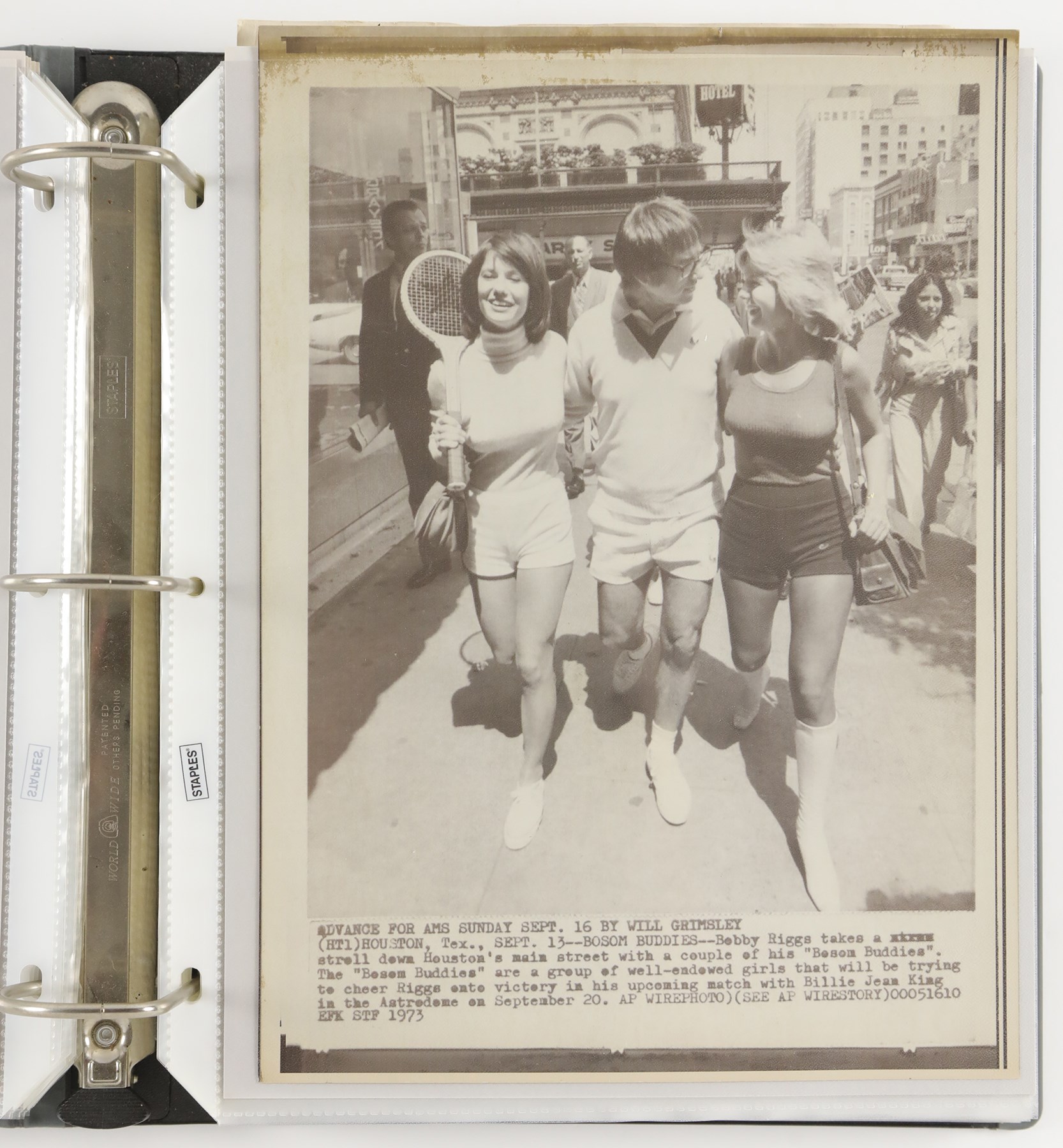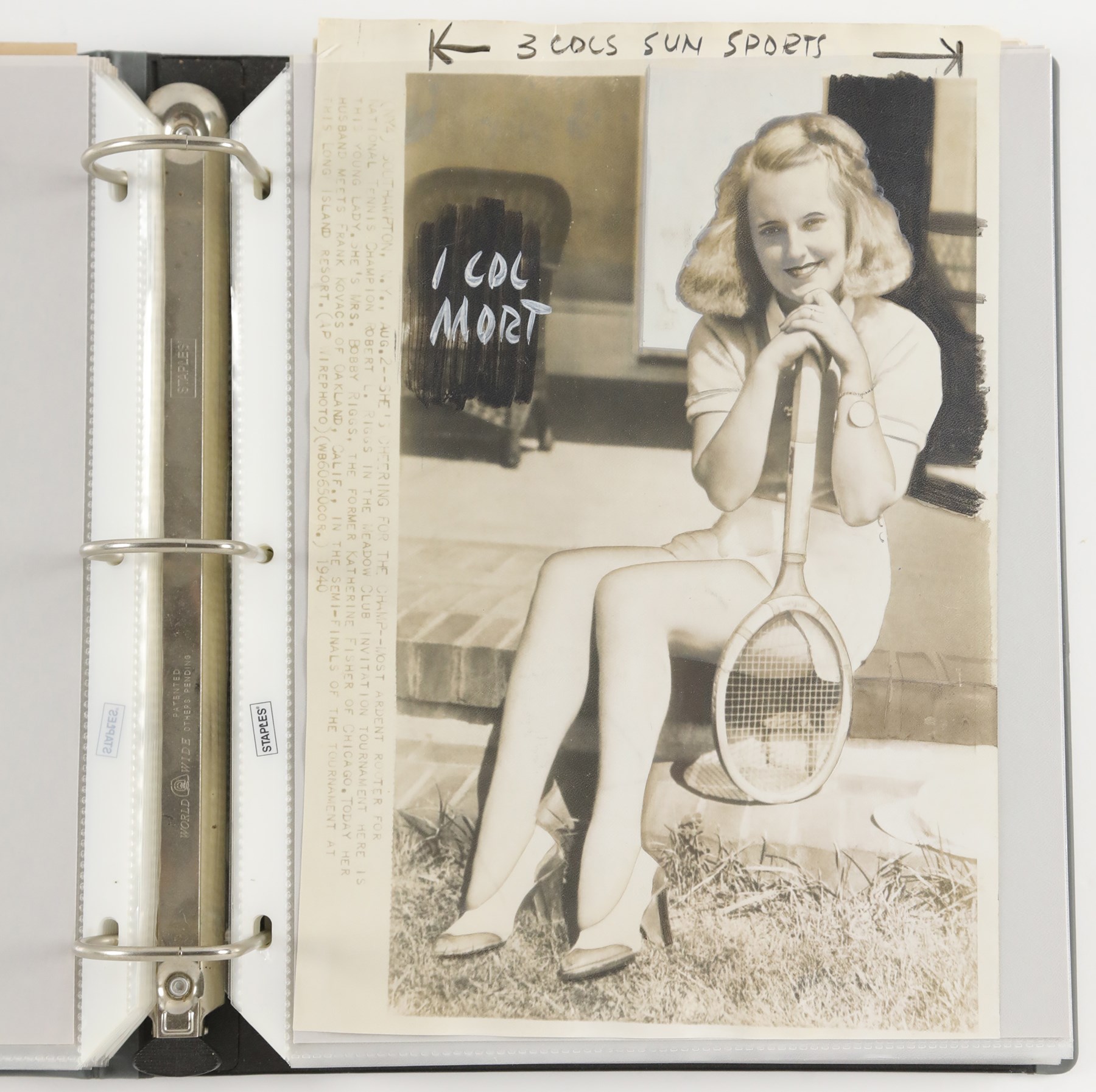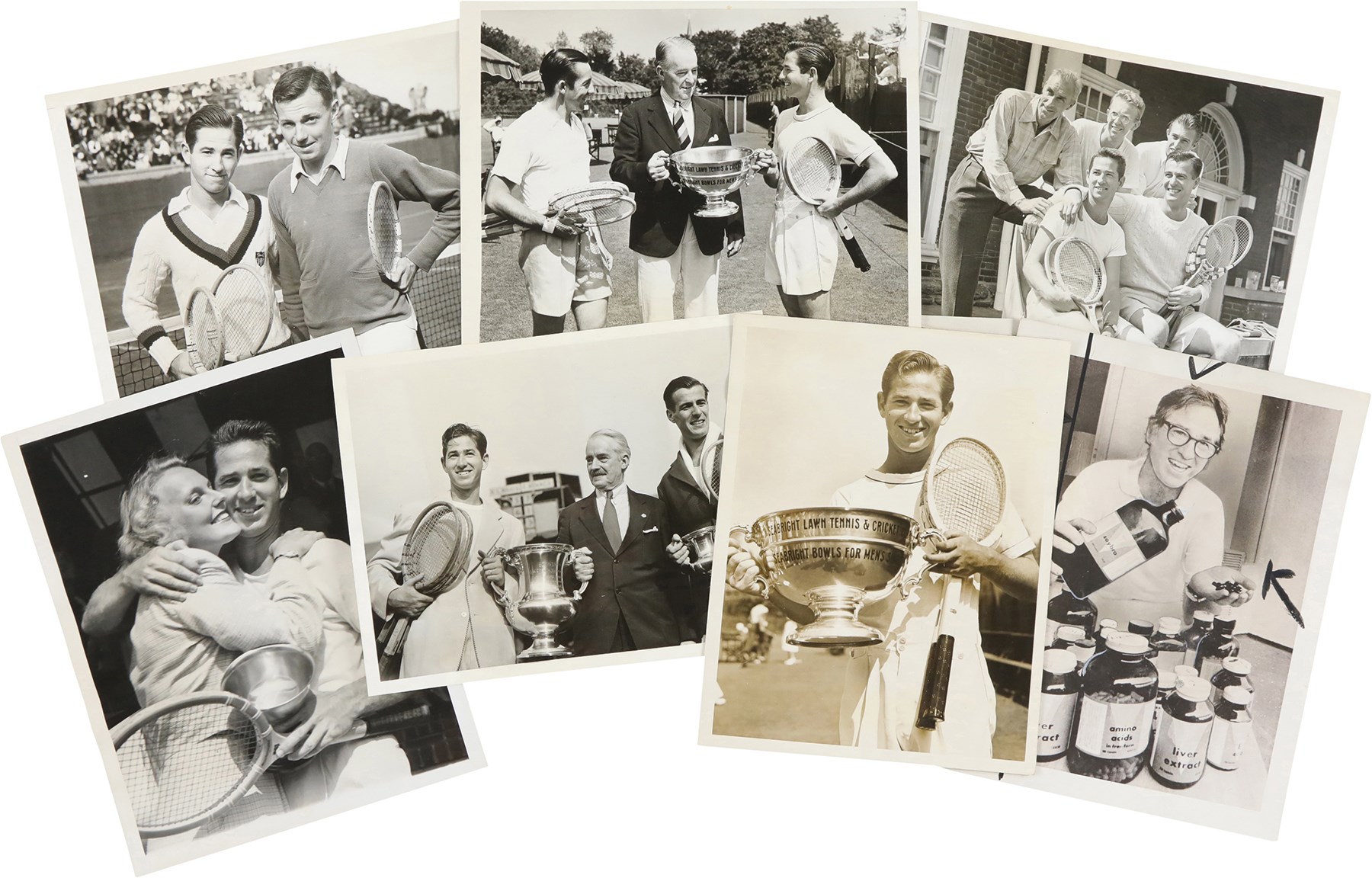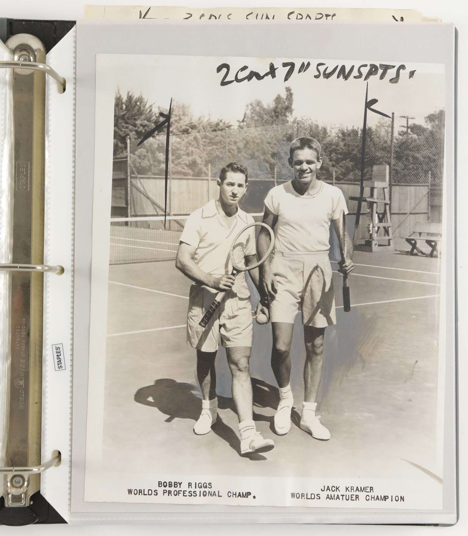 Collection of 46 vintage news photographs, dating from the late 1930s to the 1970s, capturing legendary tennis player Bobby Riggs. Although Riggs was the world number one men's tennis player in 1946 and 1947, he is best remembered today for his famous "Battle of the Sexes" match against Billie Jean King in 1973. This collection features two photos of Riggs and King posing on the court together prior to their historic match, but the majority date to Riggs' amateur and professional career in the 1930s and 1940s. Of the 46 photos in the collection, nearly 33% (15) are wire photos, with the caption embedded in the photo (wire photos are not original photos, they were transmitted over phone lines and are similar to a fax). The photos vary in size, ranging from approximately, 4.5x7" to 8x11", with most measuring either 7x9" or 8x10". Because these were all working press photos, many display editorial crop marks and/or written notations on the front. Many display credit stamps and/or the original paper news caption on the reverse. Very Good to Excellent condition overall. Please note: none of the photos in this collection have been submitted to PSA for evaluation, so no guarantees are made regarding specific Type designations.