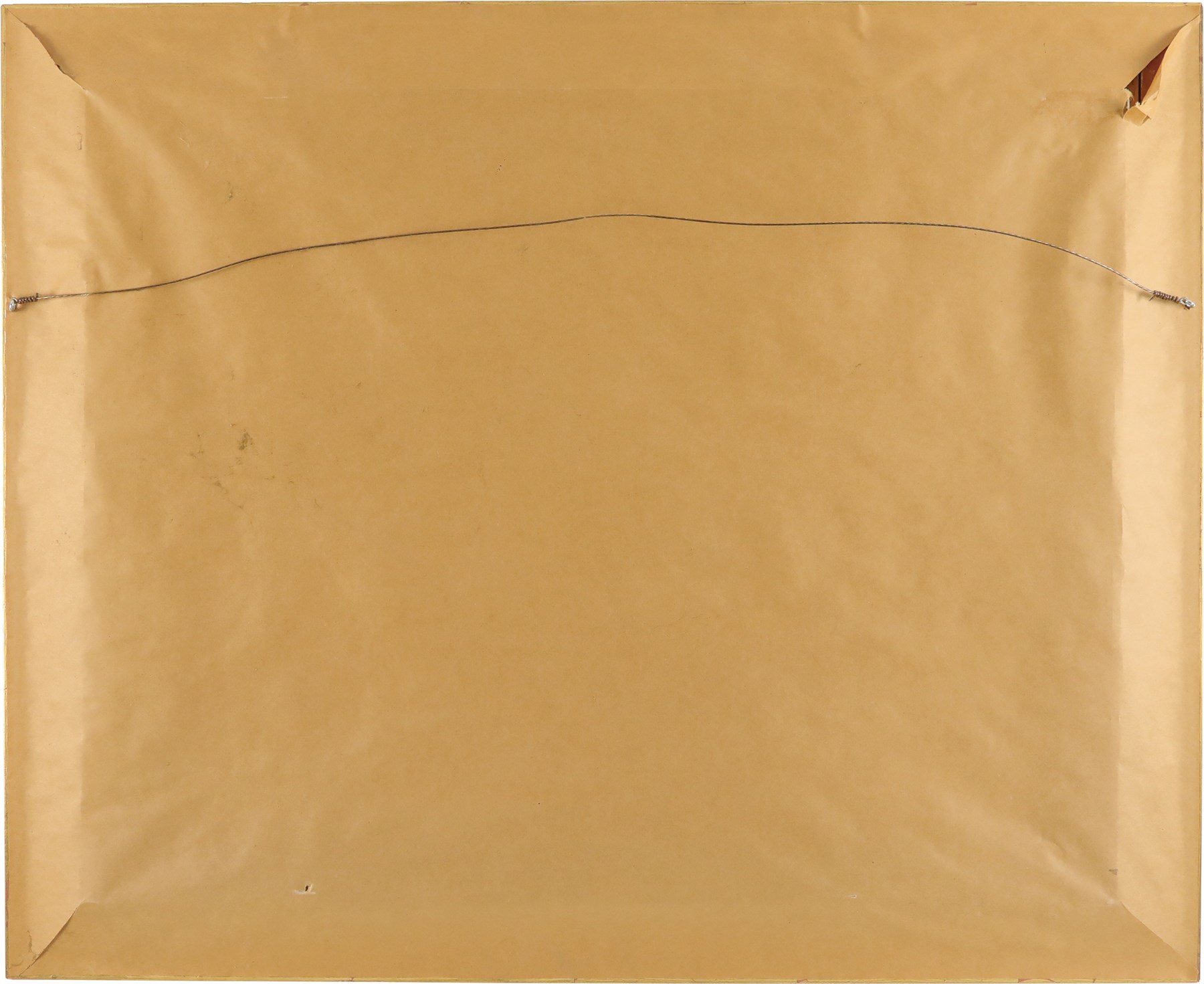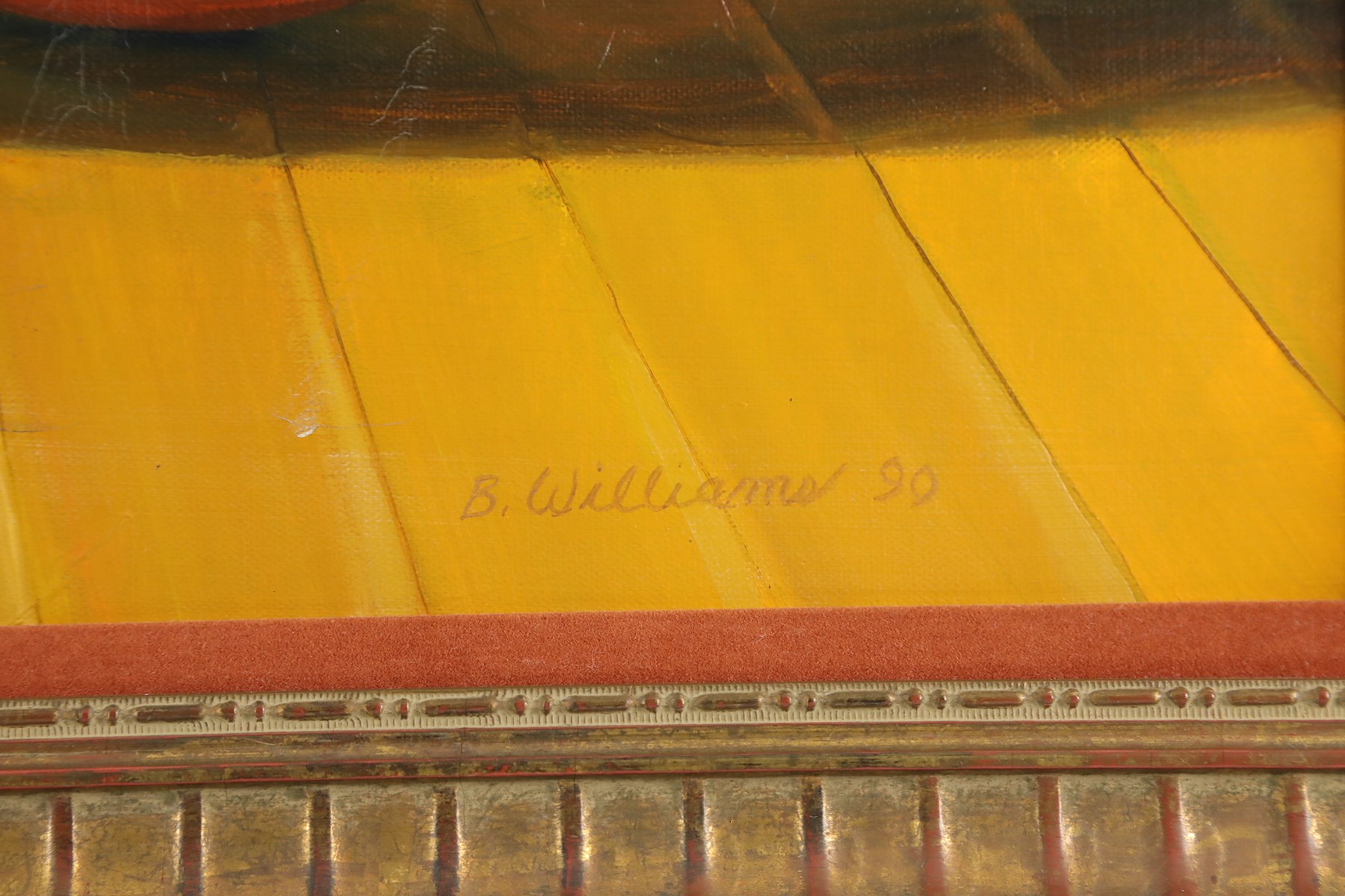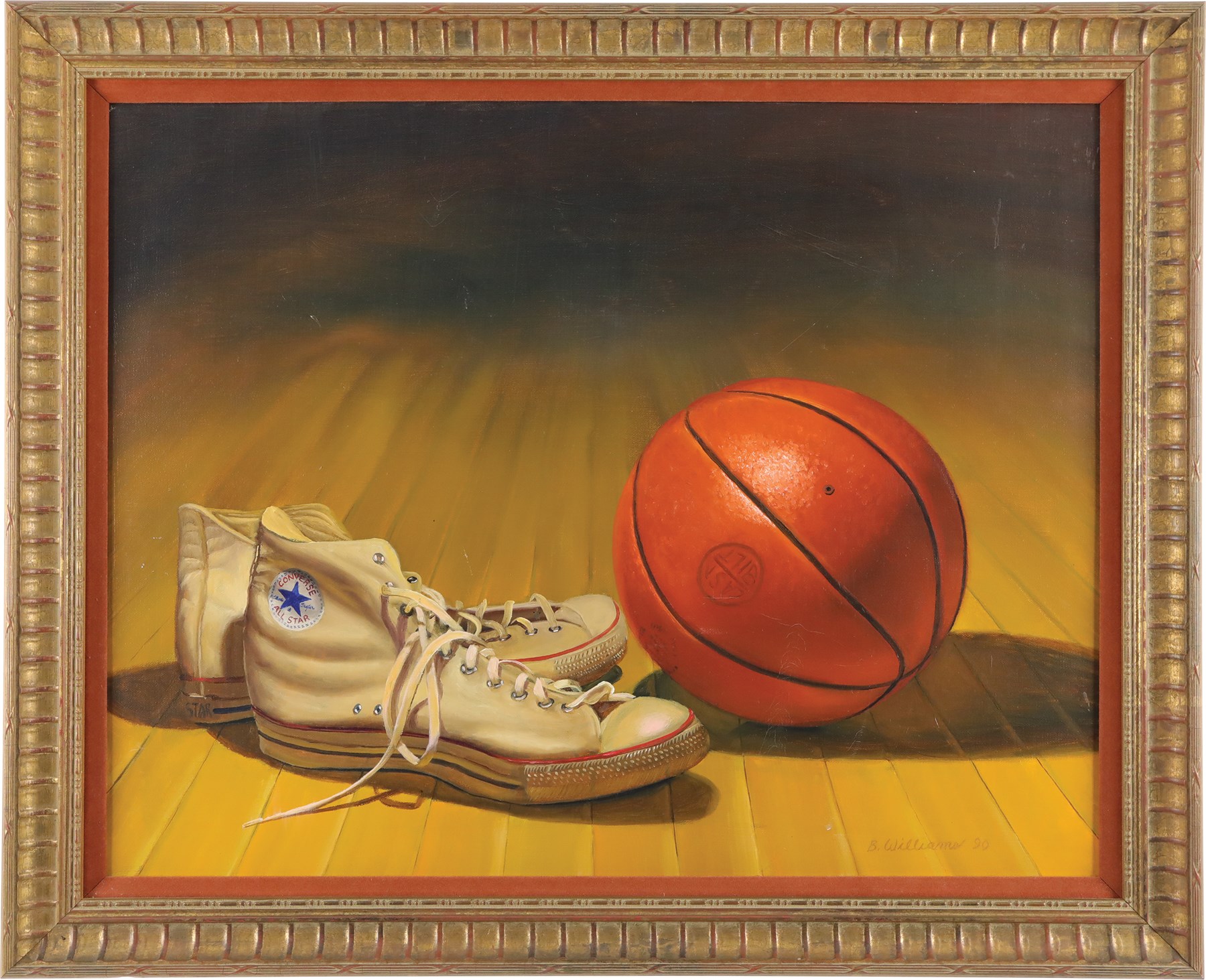 Original oil on canvas basketball painting by noted sports artist Bill Williams. Signed and dated ("B. Williams 90") in the lower right corner. Williams' artworks are instantly recognizable because his preferred form of artwork, the still life, features sports equipment instead of the more traditional subjects of fruit, flowers, or kitchen utensils. The offered painting depicts a classic hardwood pairing: a pair of Converse high-top canvas sneakers and a vintage basketball. Both are depicted in Williams' realistic style, making for an evocative image. In his own words: "My still life paintings are created to allow viewers to feel an emotion or memory that has been important to them. The creation of these works allows me to express ideas that can be best relayed through images. All of this is done with the idea of creating a beautiful piece of artwork and at the same time represent the history of sports, teams and athletes." The artwork (28x22") remains in Excellent to Mint condition. Framed to total dimensions of 33x27". Please Note: The size and/or weight of this lot will necessitate an increased shipping charge.