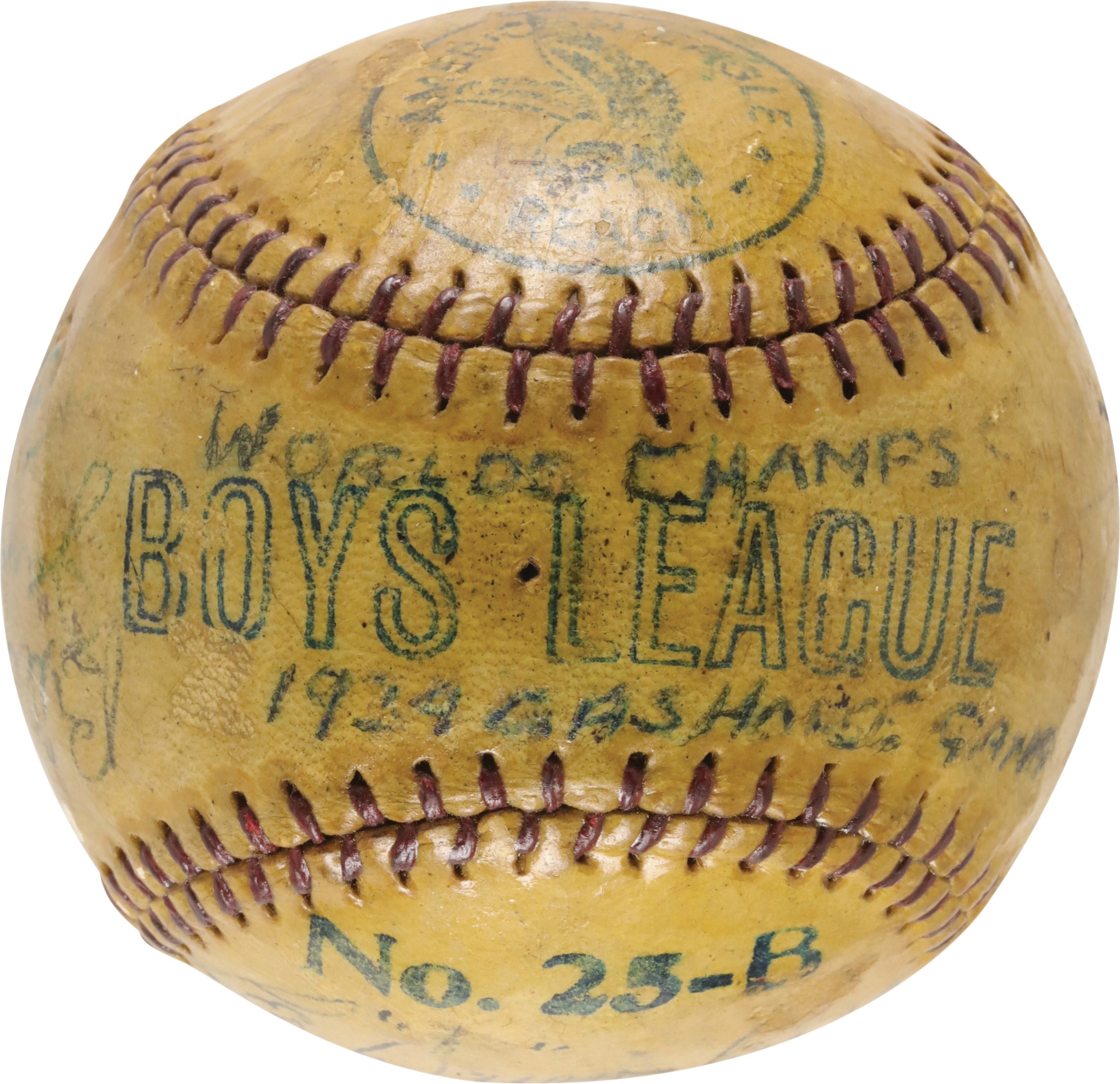 The '34 Cardinals played in Sportsman Park III and had a season record of 95-58. The squad had four NL All-Stars: manager and second baseman Frankie Frisch, who batted .305 that year; outfielder Joe "Ducky" Medwick. He hated the "Ducky" nickname and preferred being called "Muscles". He hit .319 that season; third baseman Pepper Martin, who finished the season at .289; right-hander Dizzy Dean, who went 30-7 in '34, the last National Leaguer to win at least 30 games. The offered baseball is a "Boys League" ball, as machine stamped on the baseball's sweet spot. Printed in blue ink by an unknown hand on the sweet spot is Worlds [sic] Champs and 1934 Gashouse Gang". Hall of Famer Joe Medwick signed on the sweet spot. Other hall of Famers: Dizzy Dean, Frankie Frisch and Leo Durocher. Stars: Pepper Martin, Rip Collins, Dazzy Vance, Paul Dean. Plus, Tex Carleton, Bill Walker, Francis Healy, Jack Rothrock and MORE.