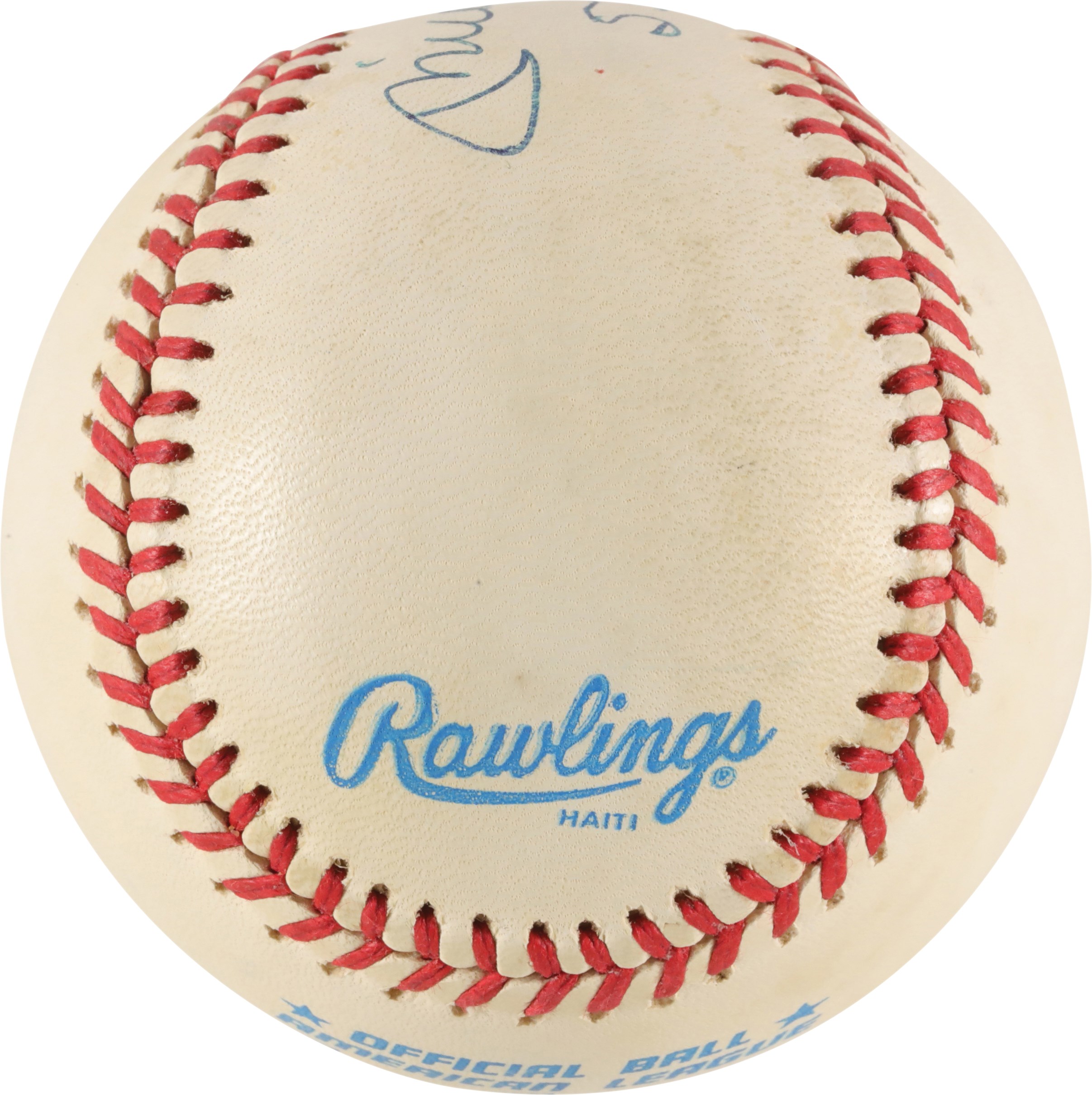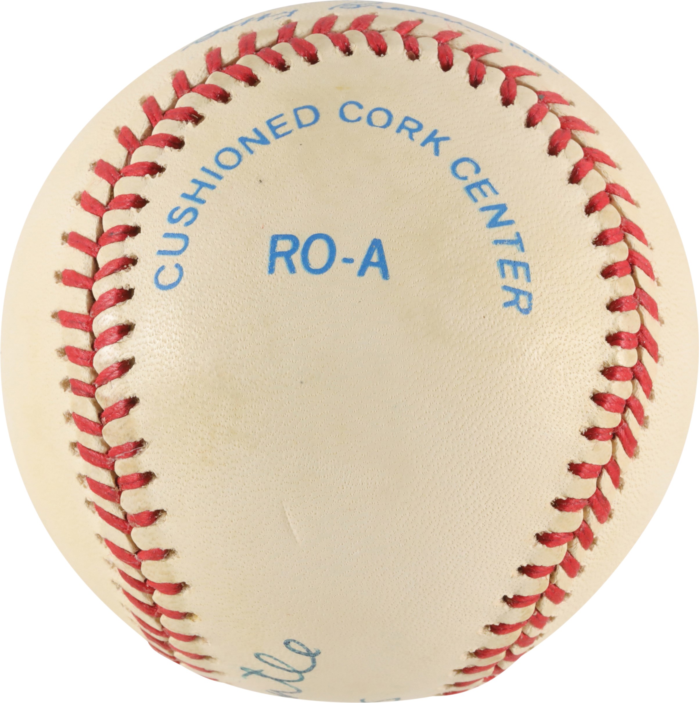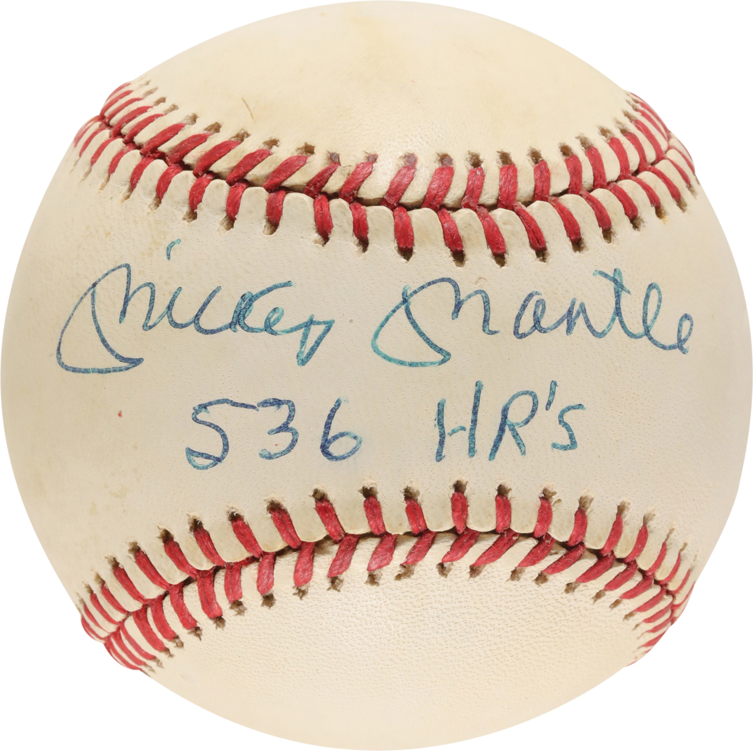 The offered baseball is an Official American league Ball (Brown). Using a fine tip blue marker, Mantle crafted his famous, beautifully flowing signature on the sweet spot, and below his signature, but still on the sweet spot, Mantle, again using a fine tip marker, added a neatly written, "536 HR'S". T offering comes with a PSA LOA for the Mantle signature and inscription.