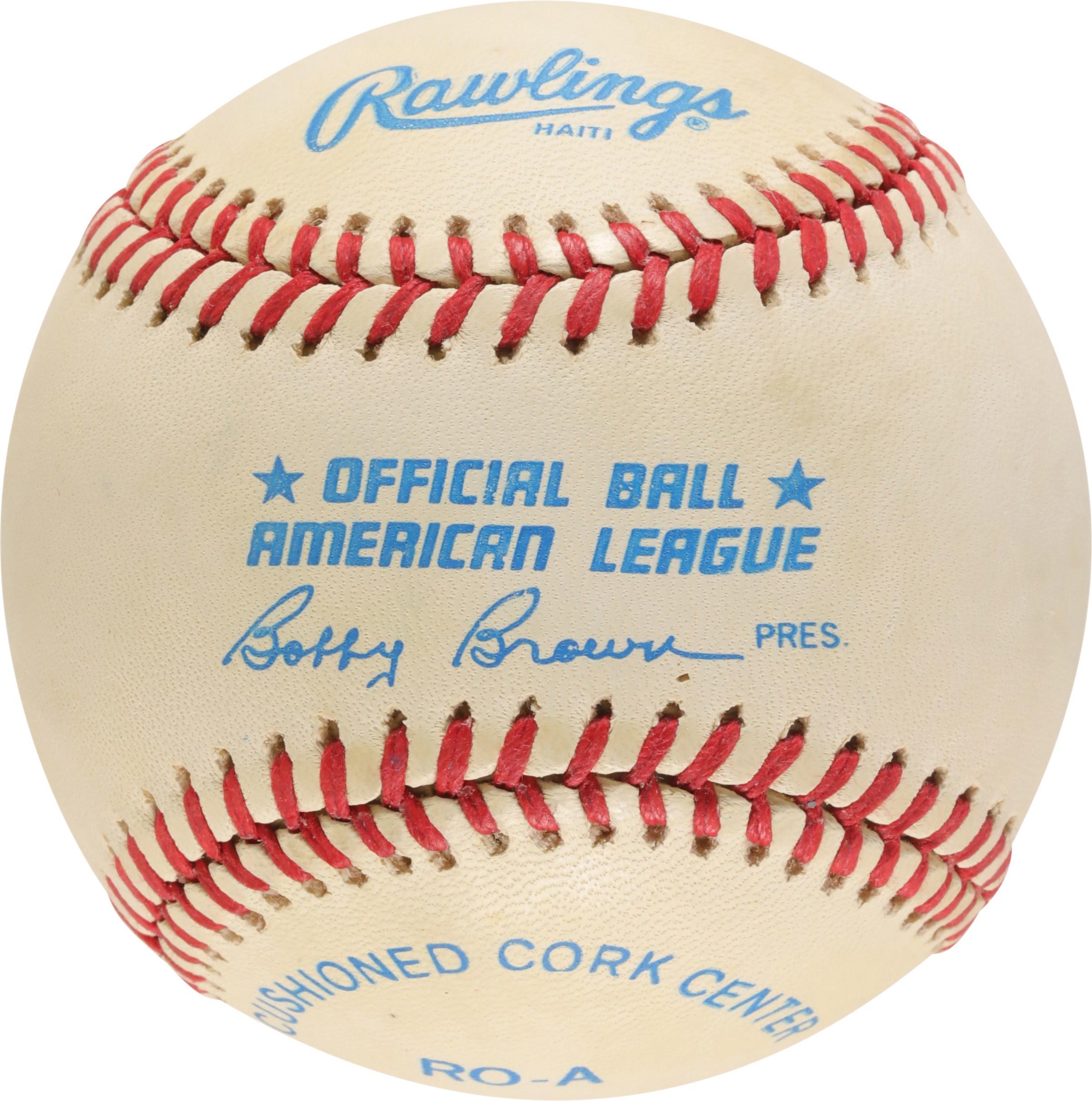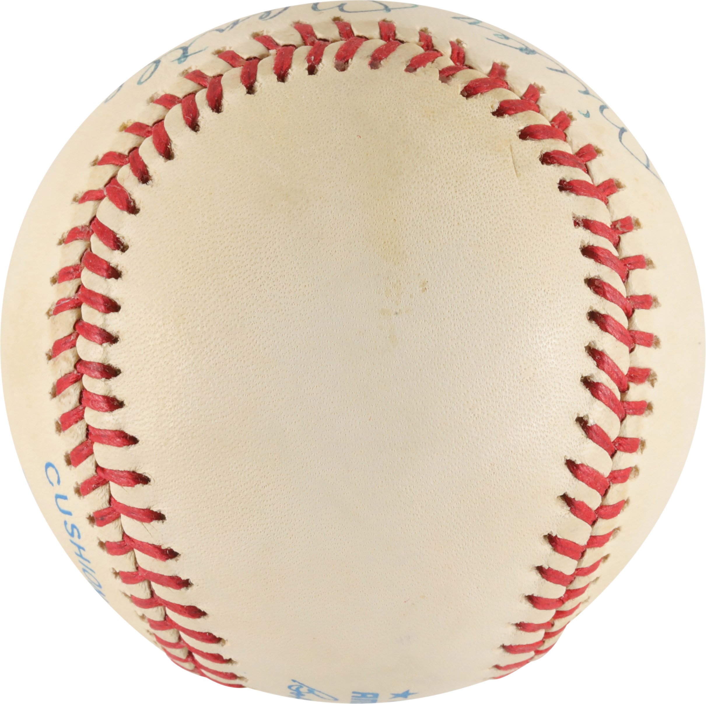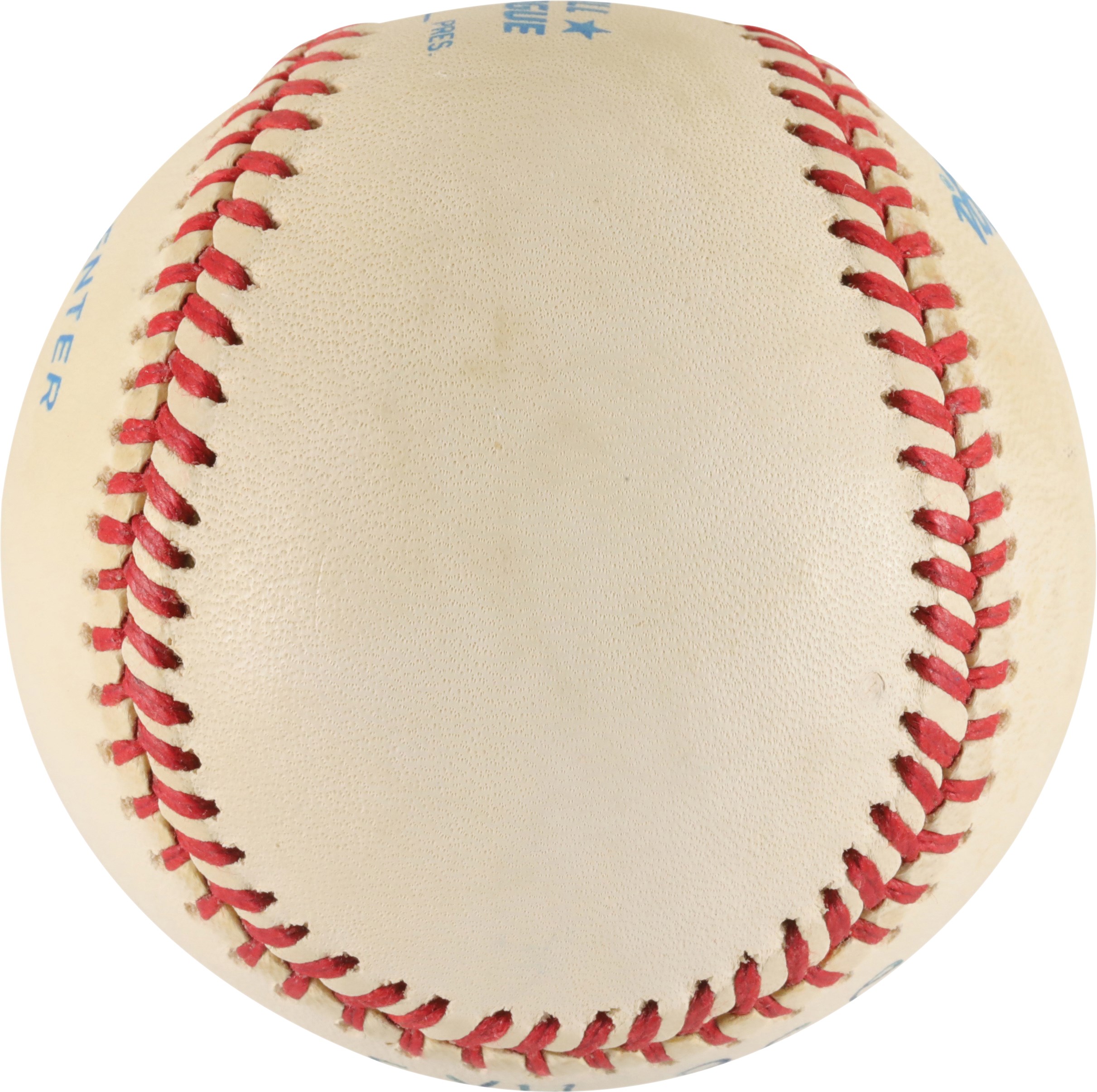 The offered baseball is an Official American league Ball (Brown). Using a fine tip blue marker, Mantle crafted his famous, beautifully flowing signature on the sweet spot, and below his signature, but still on the sweet spot, Mantle, again using a fine tip marker, added a neatly written, "536 HR'S". T offering comes with a PSA LOA for the Mantle signature and inscription.