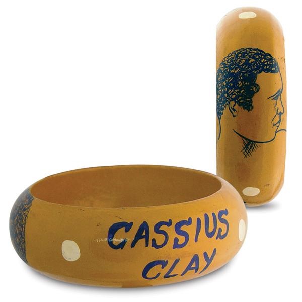 African art wooden bracelet depicts image of Cassius Clay and is of stunning quality. Features the face of Ali with boxing gloves on the opposite side. Painted words, “Mohd. Ali” and “Cassius Clay”. A rare commercial piece it measures 2.5” in diameter. Only one we have seen, this was likely done right after the Liston fight when he changed his name and celebrates his African heritage. EX-MT.