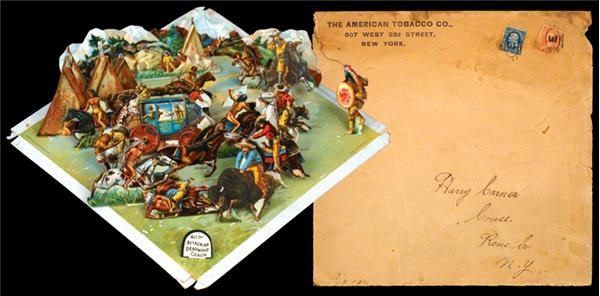 Just a wonderful piece of true Americana. Issued as a premium Honest Long Cut Cigarettes it features a 9x9” color litho game board of “Buffalo Bill’s Wild West Show” with stunning advertising on the verso. There are slots to place this complete set of 38 fully lithographed die-cut “scraps” depicting the stars of the Wild West circus. Everything is here from elaborate stagecoach scenes and wild Indians to Bill himself riding a buffalo. Also, comes with the show’s “Program” to tell you which cards to use in which “acts.” This all comes in its original envelope from The American Tobacco Company. Scraps are EX-MT, board & envelope good, program EX-MT.