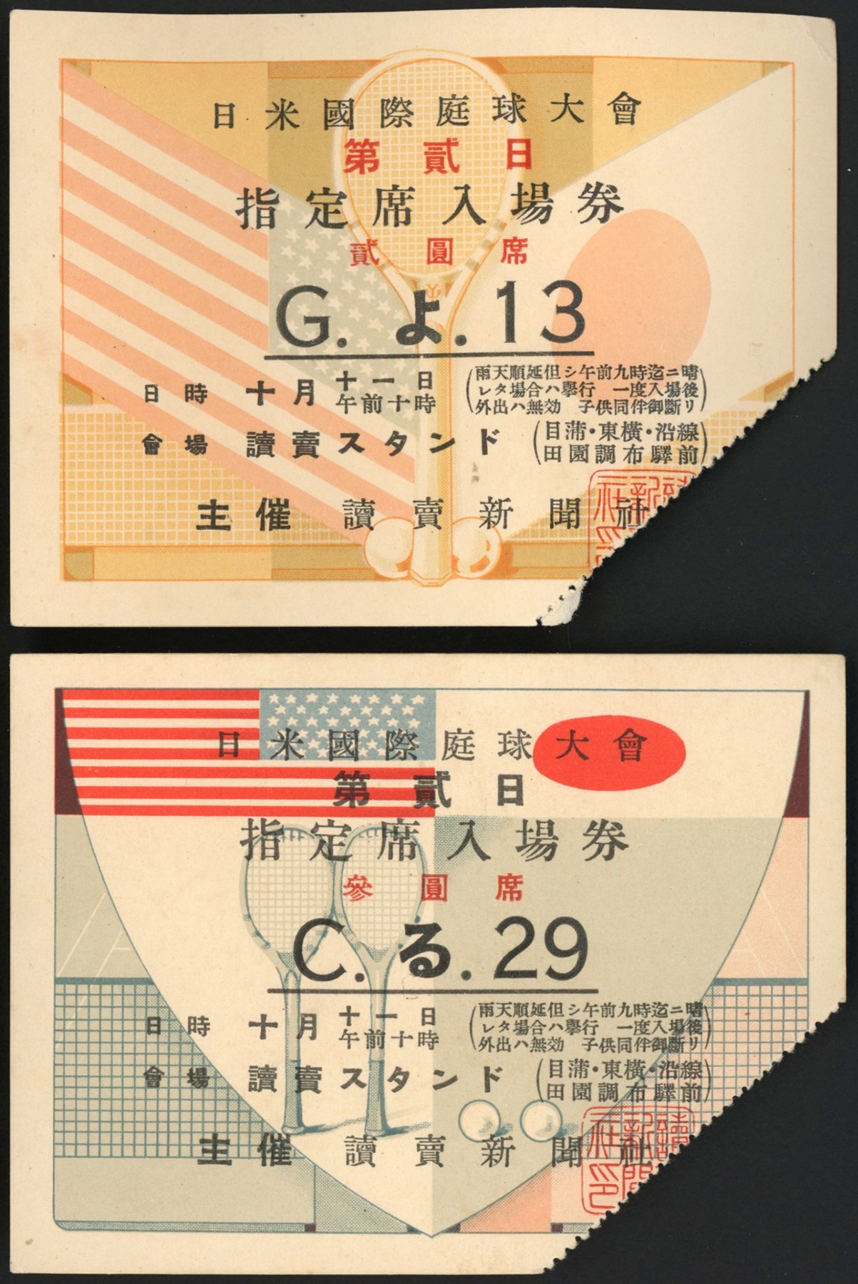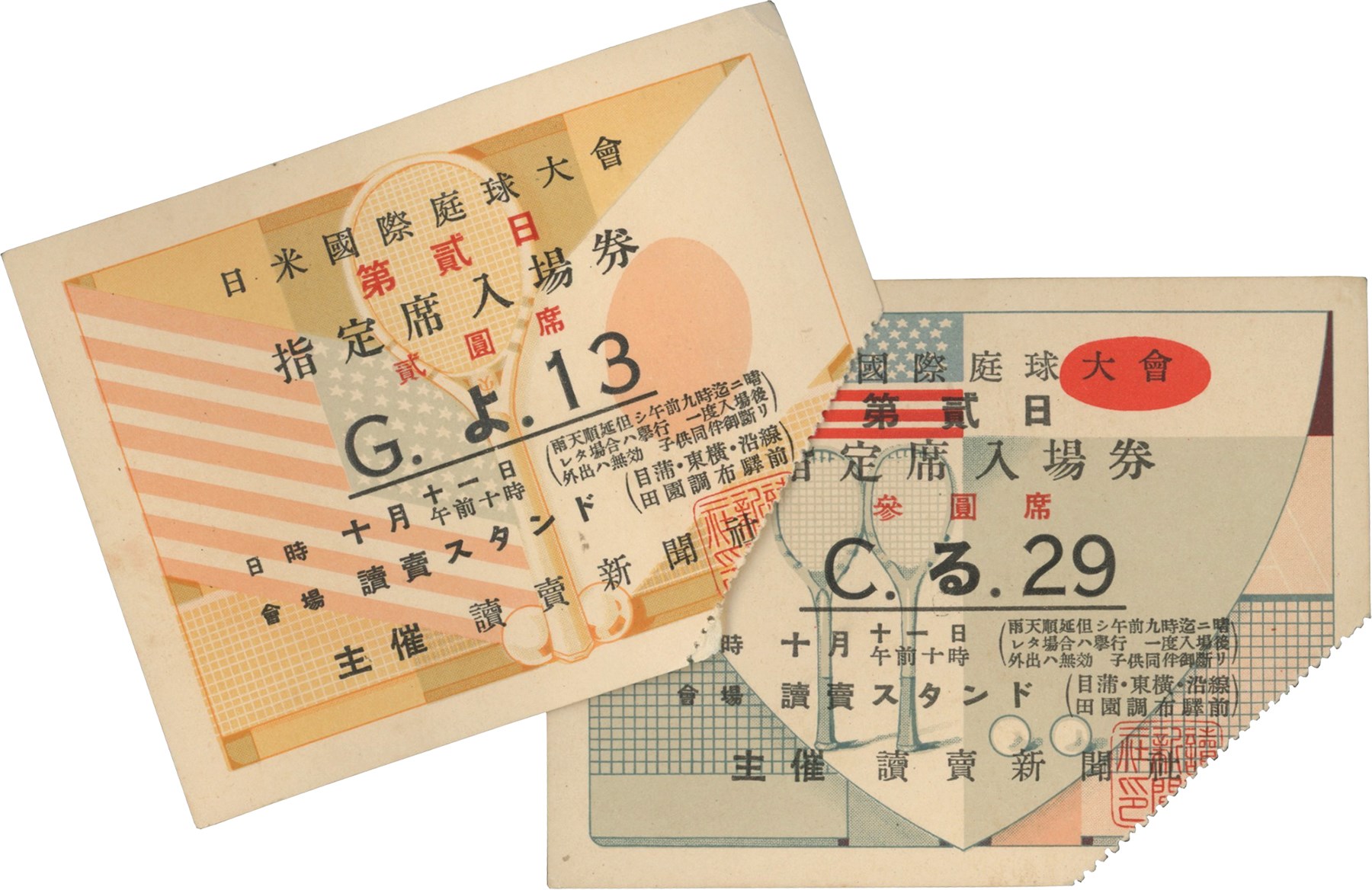 William Tatem Tilden II was nicknamed "Big Bill," and the 6'2" tennis star is one of the top players in tennis history. Presented are two ticket stubs to Tilden's Tour of Japan match against Ellsworth Vines on Oct. 11, 1936, at Denen Yomiuri Stadium in Tokyo. Tilden (1895-1953) grew up in Philadelphia, Pennsylvania, in a wealthy family. He attended the University of Pennsylvania. The death of his mother eventually caused Tilden to concentrate on tennis as a way to handle his grief. Tilden quickly advanced in tennis rankings, and from 1920-25, he was the World's Number 1 Amateur, which at a time before a professional tour made him the World's top ranked player. From his peak years, 1920-26, Tilden won six consecutive U.S. National Singles Championships and three Wimbledon Men's Singles Titles. Among his numerous records: 10 U.S. National Finals appearances; a 42-match win streak at Forest Hills (1920-26); a 95-match win streak in 1924-25.
