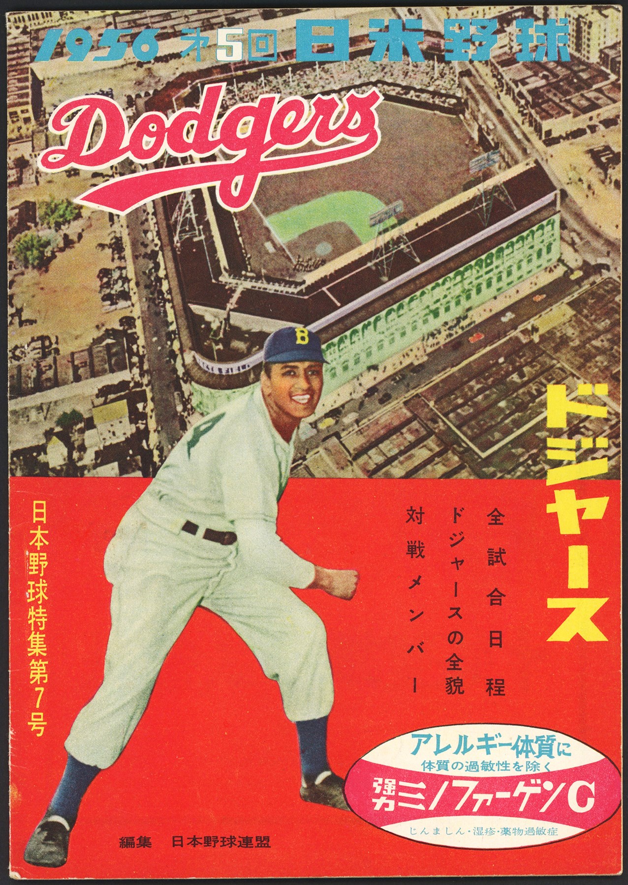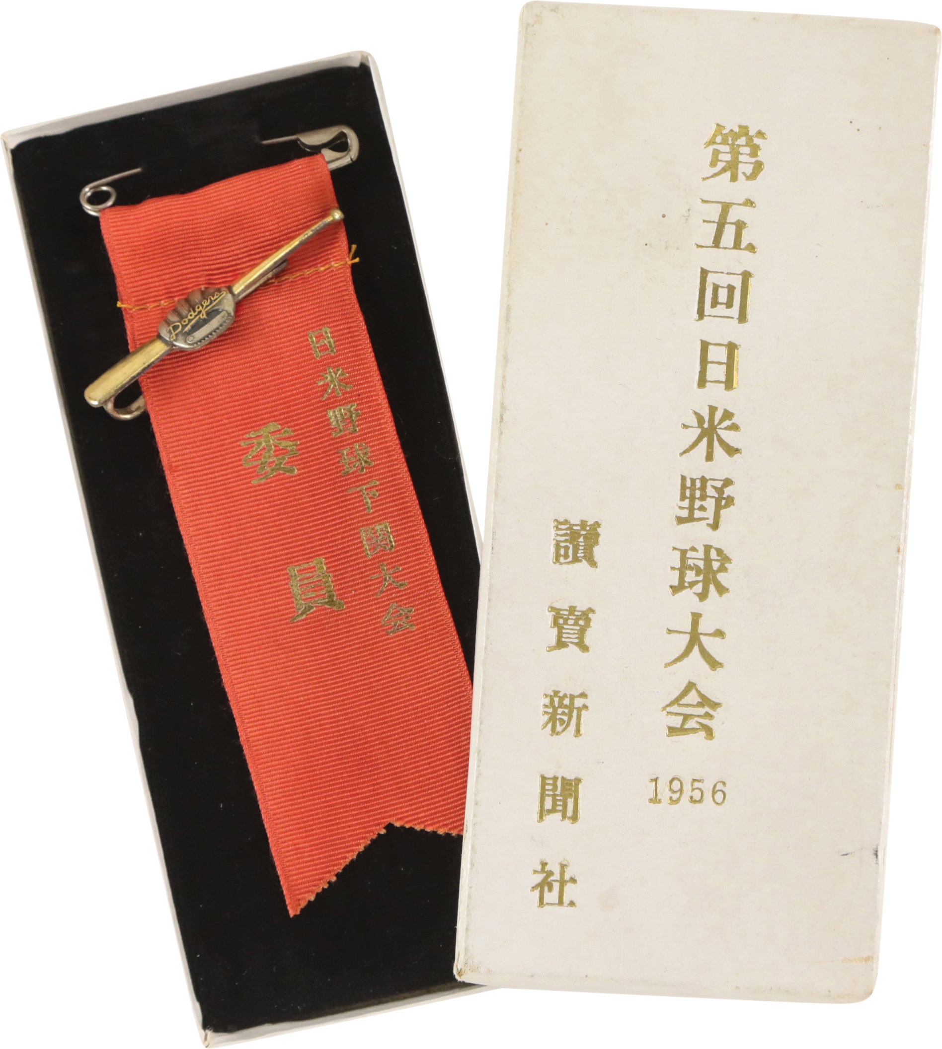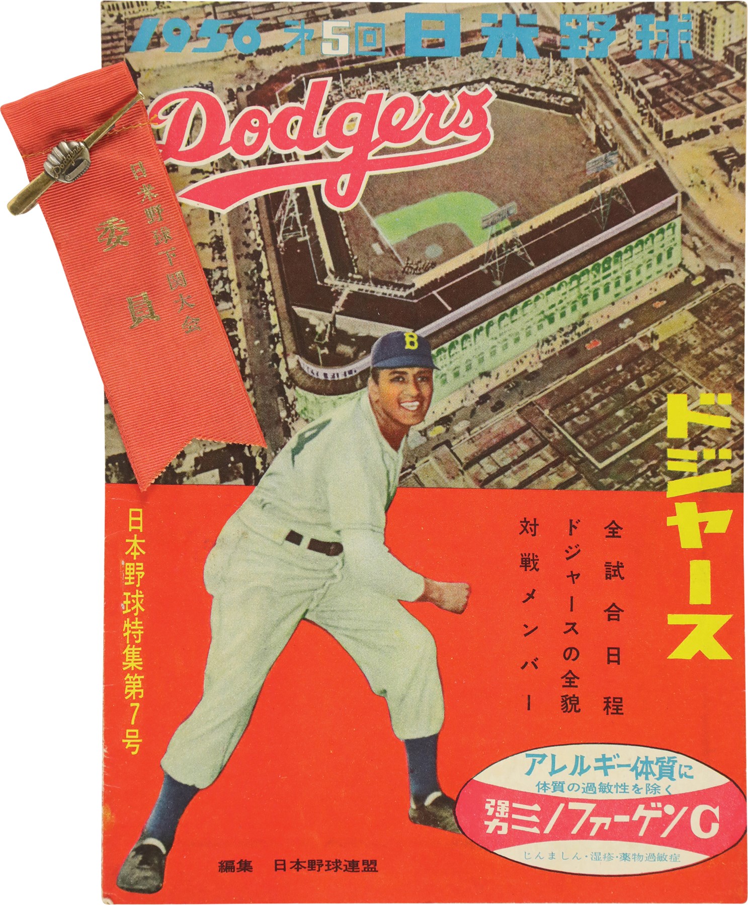 The Brooklyn Dodgers, with the team's fabled "Boys of Summer" aging, still managed to win the 1956 NL pennant, but lost the World Series in seven games to the New York Yankees. Eighteen hours after the World Series ended, the Dodgers left New York to fly to Los Angeles on the first leg of the team's scheduled 20 game Tour of Japan. Offered is a 1956 Tour of Japan Collection, with two items: A souvenir program or sports magazine focusing on the Dodgers' 1956 goodwill tour of Japan and a Japan-U.S. Baseball Tournament Committee Member Press Pin, with box.