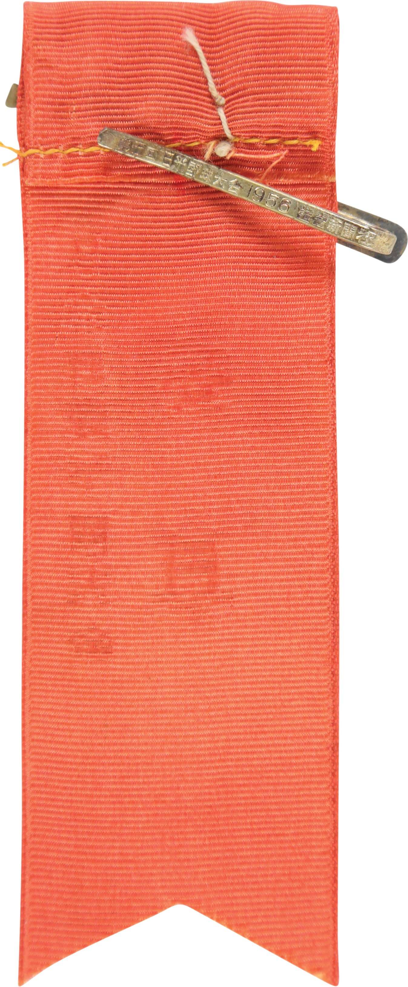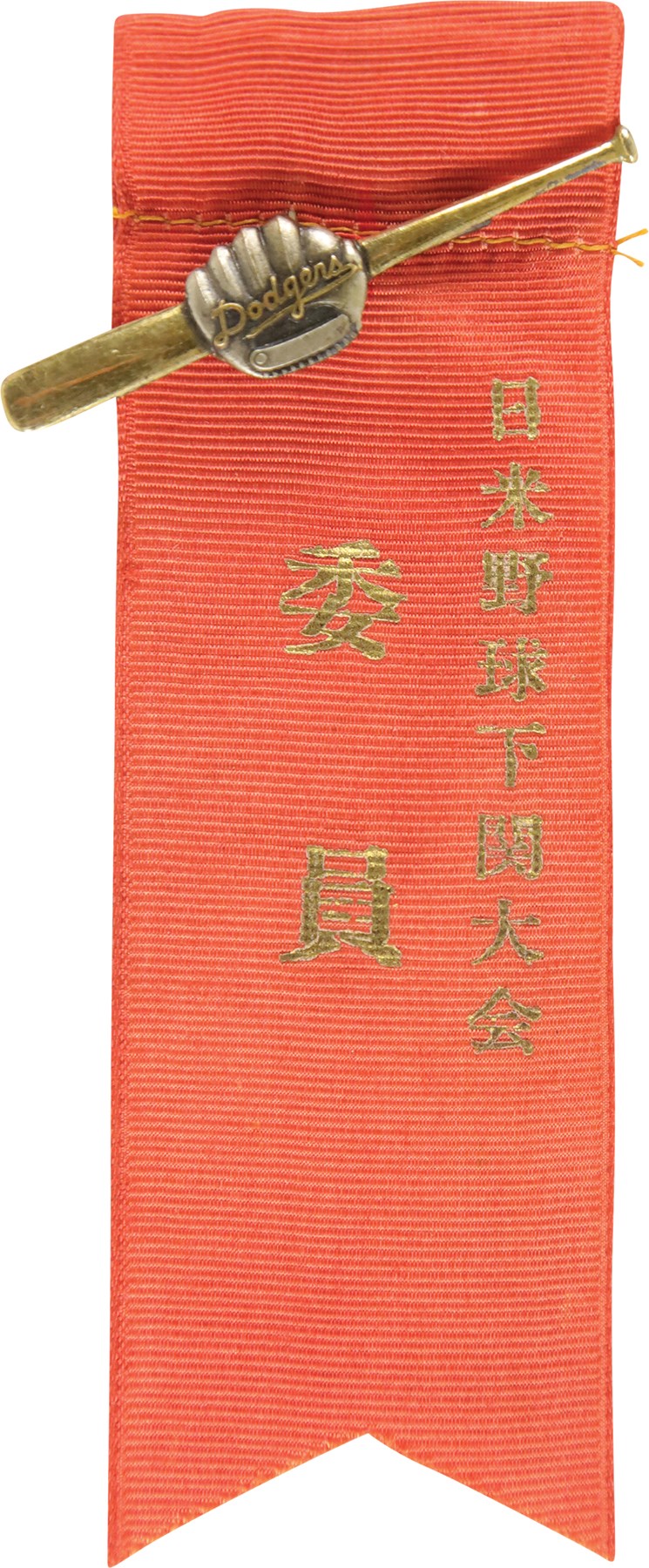 Also included is a press ribbon, approx. 4" long and 1.5" wide, in red with gold colored lettering. Because of the passage of years, the colors on the ribbon are somewhat faded. The press ribbon is in an original box, with Japanese lettering and "1956." The cardboard box measures approx. 2.5x6x0.5" and shows light wear. Affixed to the ribbon is a miniature baseball bat and glove, with lettering on the miniature glove reading, "Dodgers." The ribbon has a few small, loose threads, but is in overall nice condition. The offering makes a great remembrance of the last Brooklyn pennant winners taking a sort of victory lap in Japan, with the move to Los Angeles coming after only one more season in Brooklyn.