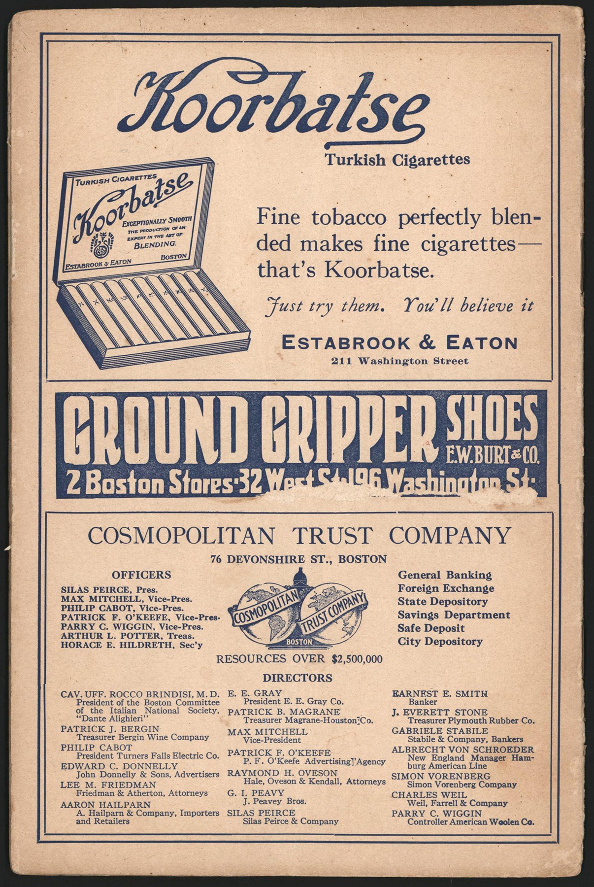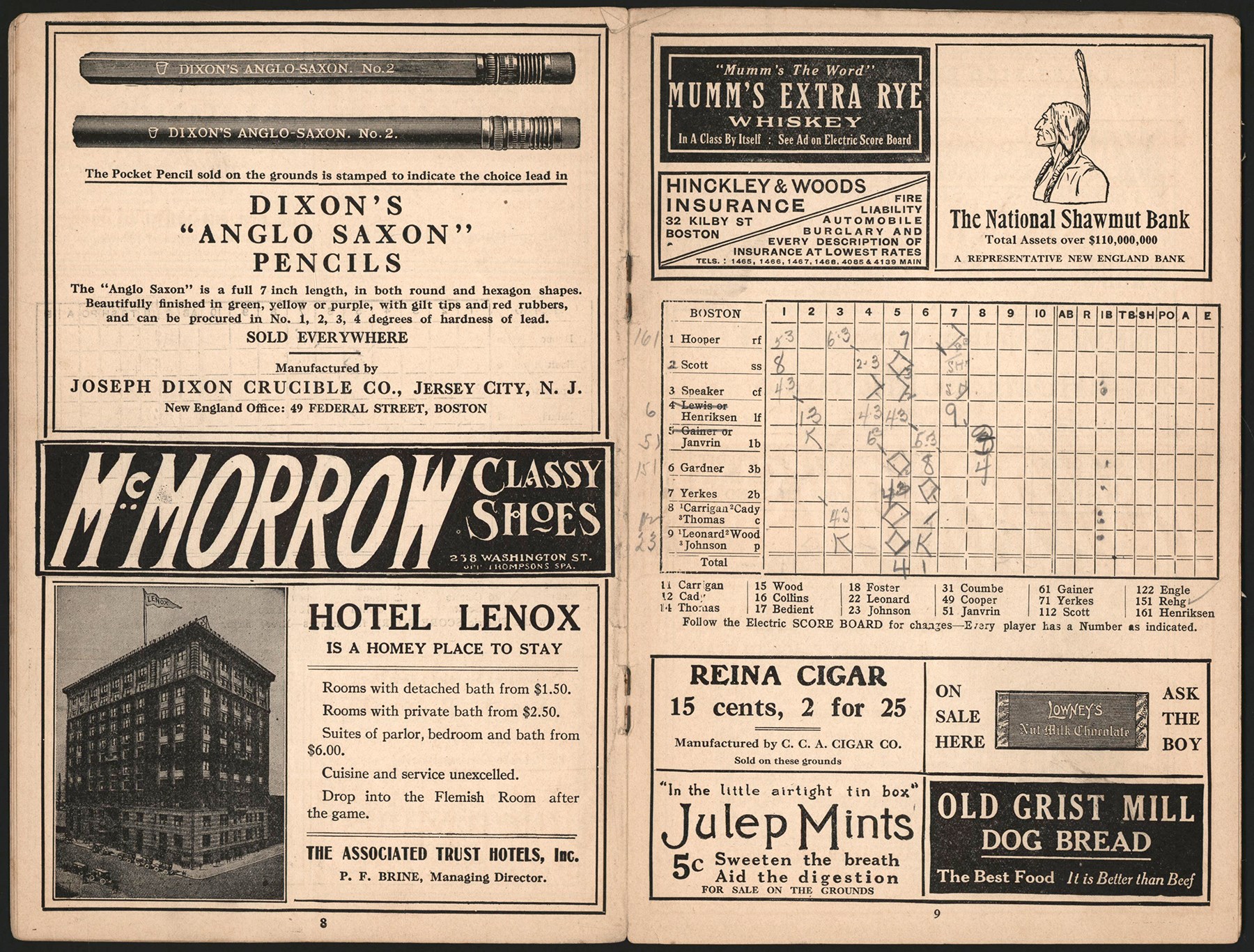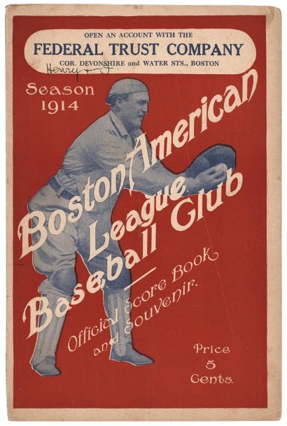 The program measures 6x9", and it appears to have a few pages missing from the second half of the program. Both scored pages from the scorecard part of the program still remain. The program exhibits some darkening and a few small stains. The cover of the program reads, "Season 1914/Boston American League Baseball Club/Price 5 Cents." The 111-year-old advertisements in the program are fascinating: A one-page ad for the United Shoe Manufacturing Company, run by A.G. Spalding, who pitched in the 1800s for Boston and in 1914 still ran the Spalding Company - a firm still famous for sports equipment today; an advertisement for straw hats; an advertisement for German Frankforts (later called frankfurters). Very good condition, with minor binding separation towards bottom, with unknown handwriting on front by attendees. Aside from the probable missing pages, the program is in very good condition.