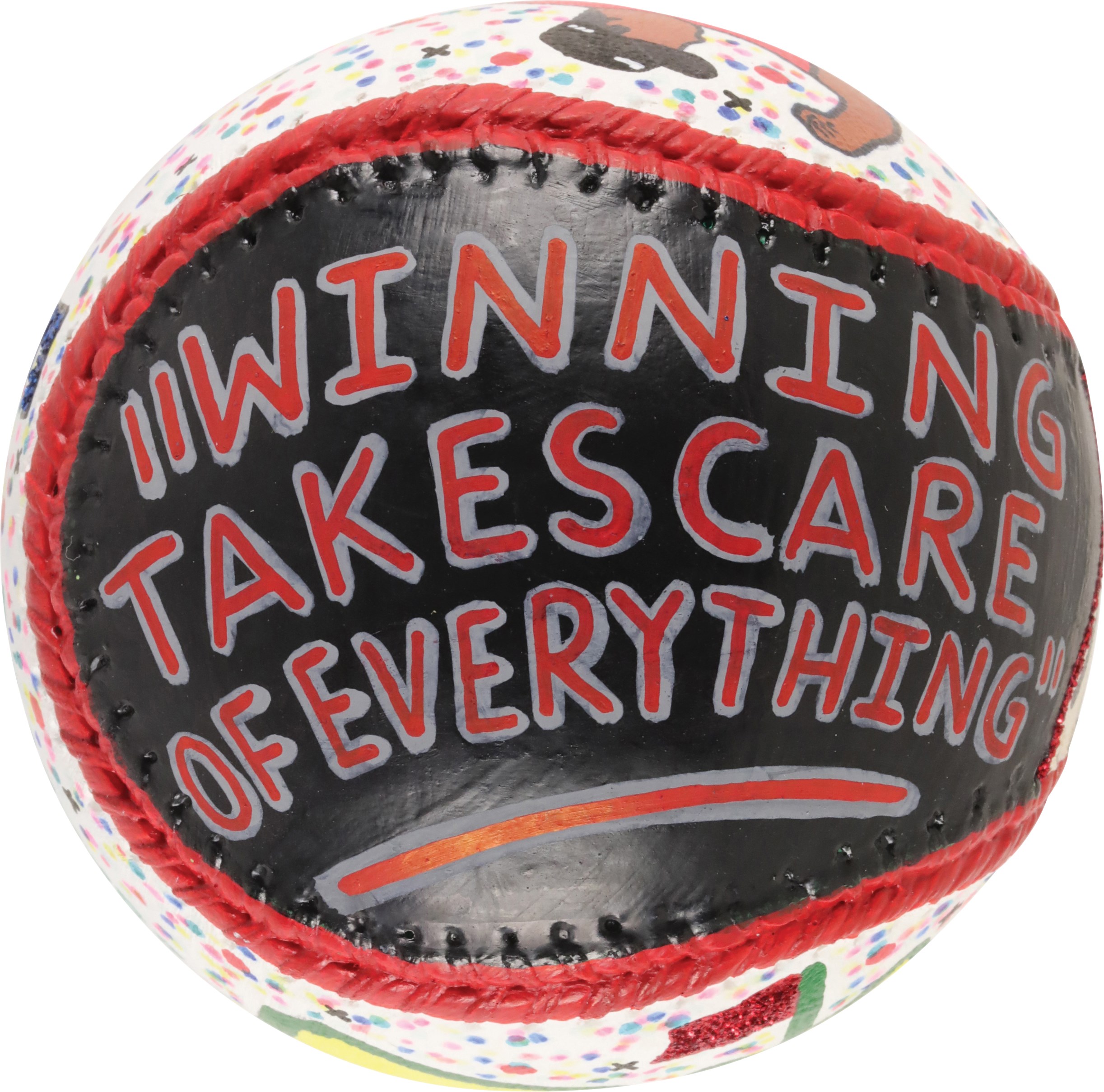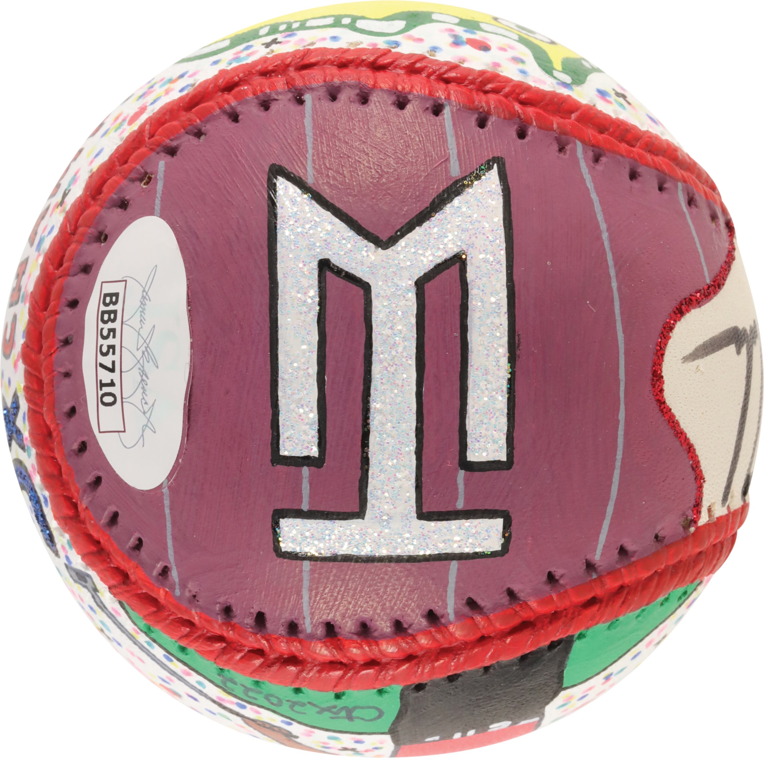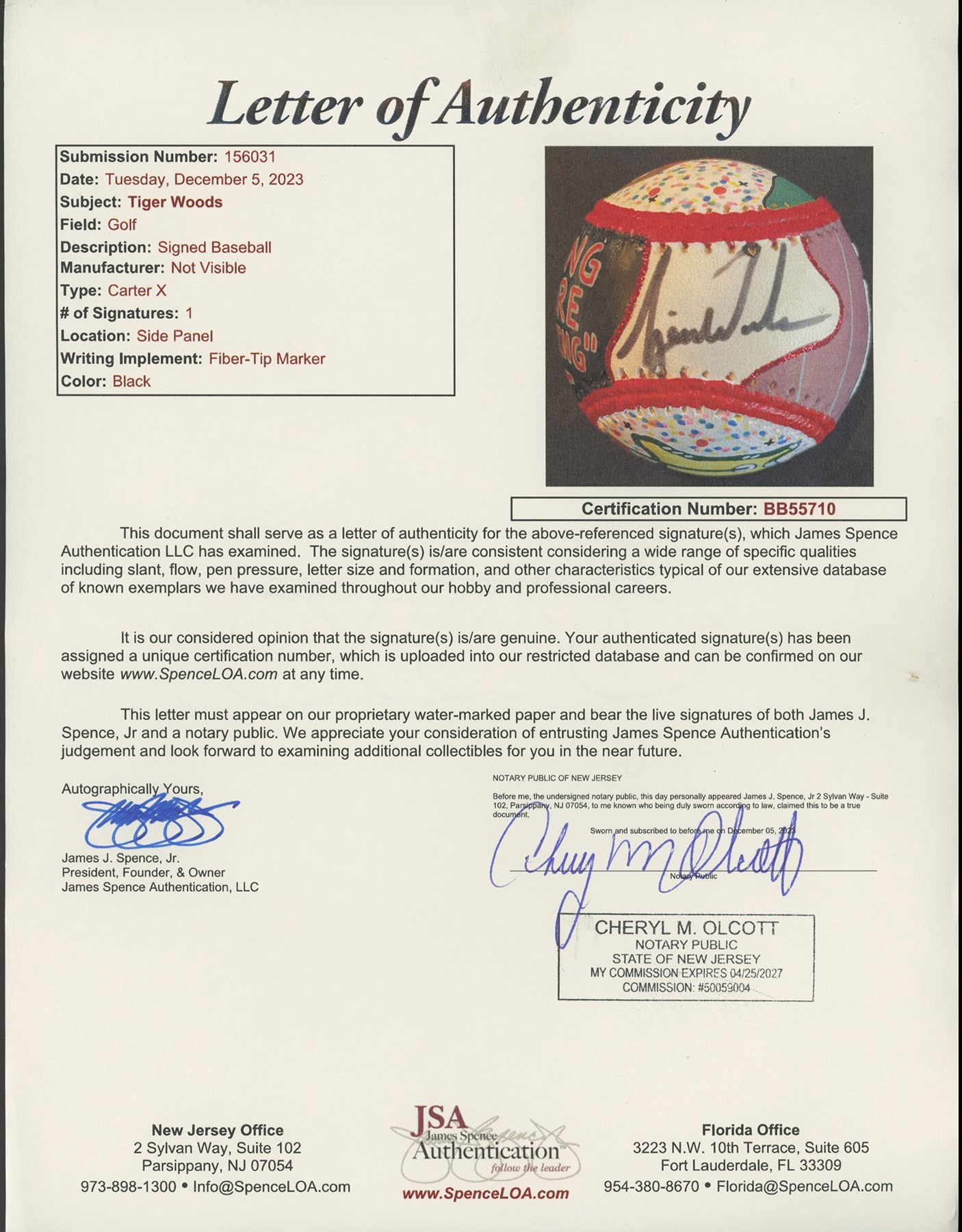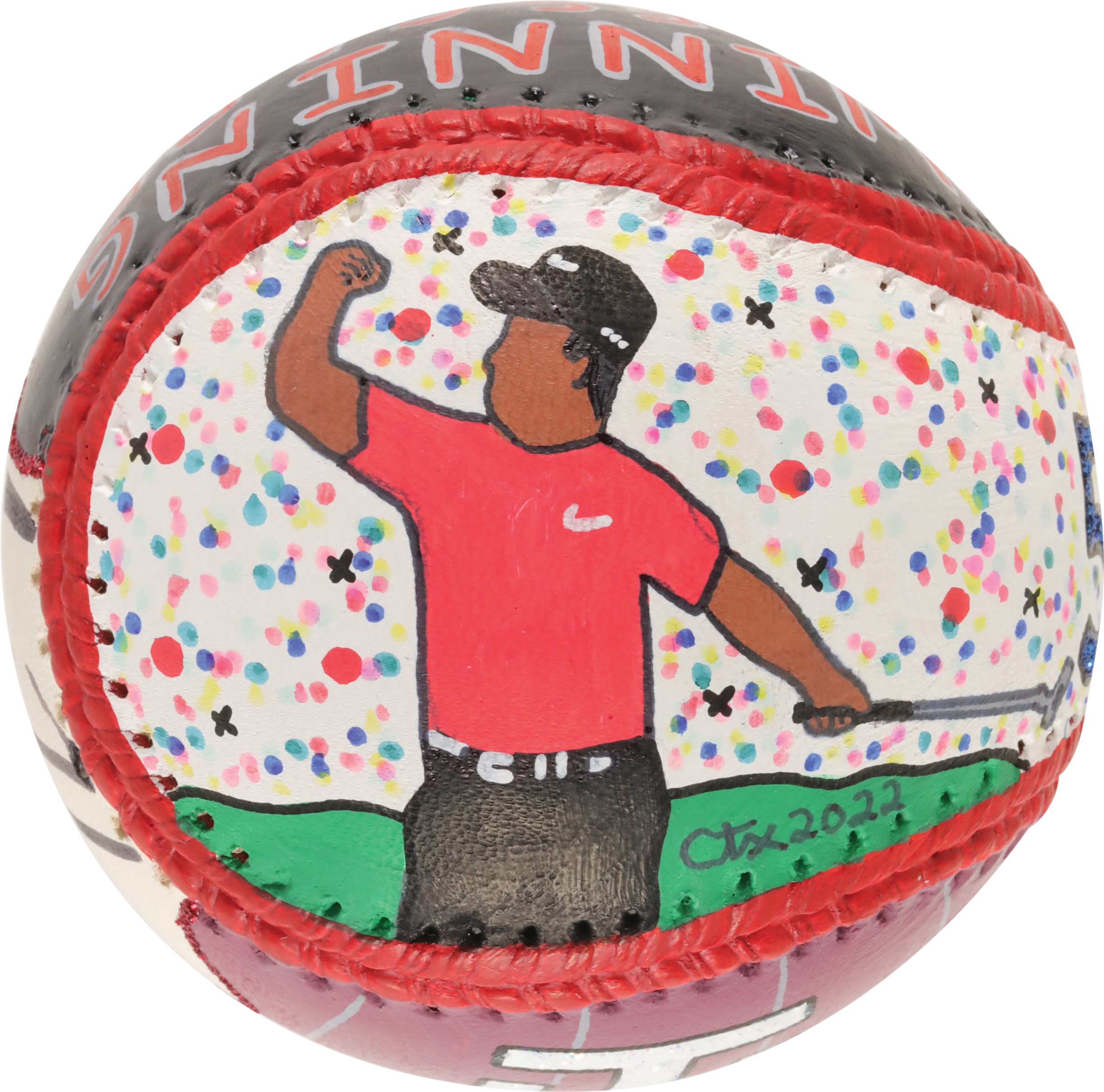 Hand painted 1/1 Tiger Woods Commemorative baseball features a rendition of his iconic chip-in on the 16th hole at the 2005 Masters along with a Masters logo, TW logo, "Winning Takes Care Of Everything," "5x Masters Champ" and a perfectly placed Tiger Woods signature on the sweet spot in black marker. Hand dated "2022" in ink, this unique keepsake is brightly colored and presents in NM condition overall. Signature rates 9/10 overall. Comes with JSA LOA for signature.