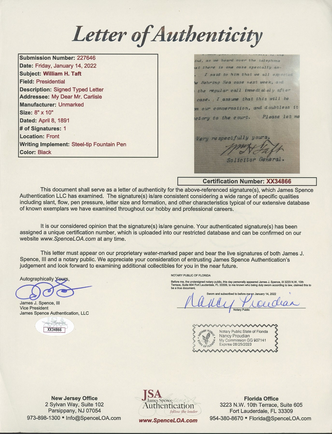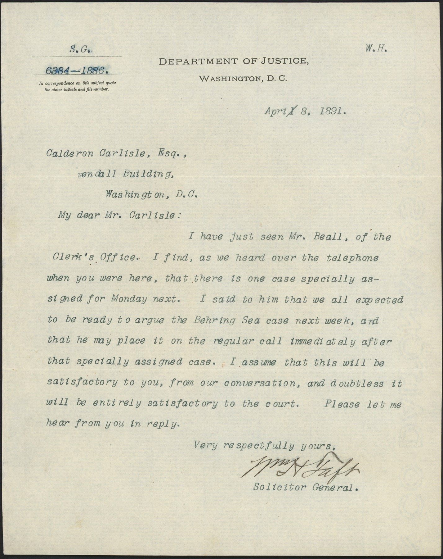 The offered letter measures approx. 8x10", written on Department of Justice stationery. The typed date on the letter is April 18, 1891, but an unknown hand, using blue ink, drew a neat line through the number 1 of the date, so the date could conceivably have been April 8, 1891. The typed name of the addressee on the letter is Calderon Carlisle, Esq. Part of the address of the above-named attorney is missing or erased from the letter. In the top left corner are the initials designating the Solicitor General: S.G. Below that is the file number "6384-1886." The numerals of the file number are somewhat smeared. In part, the typed letter reads, "My dear Mr. Carlisle: I have just seen Mr. Beall, of the Clerk's Office.... I said to him that we all expected to be ready to argue the Bering Sea case specially assigned for Monday next.... Very respectfully yours, William H. Taft (as a signature in steel-tip black fountain ink) Solicitor General." The letter has two horizontal fold lines, from when the letter was mailed.