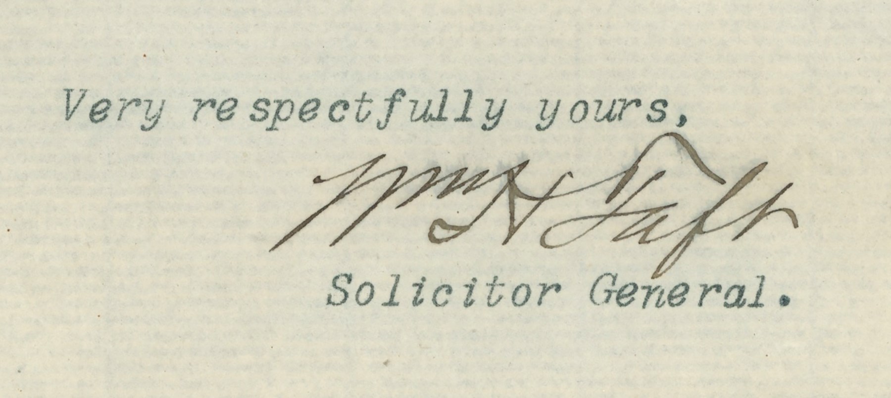 Presented is an 1891 letter signed by William H. Taft, then the Solicitor General of the United States, and later the 17th President of the United States. Taft, born in 1857, in Cincinnati, Ohio, graduated from Yale University and became an attorney. A Republican, he rose in political influence and defeated William Jennings Bryan in the 1908 Presidential Election. As President, he was heavily involved in foreign policy, especially in East Asia. His "Dollar Diplomacy" plan supported U.S. business interests. After a split in the Republican Party, he lost the 1912 election. He later was the Chief Justice of the United States Supreme Court, the only person to have served in both those capacities.