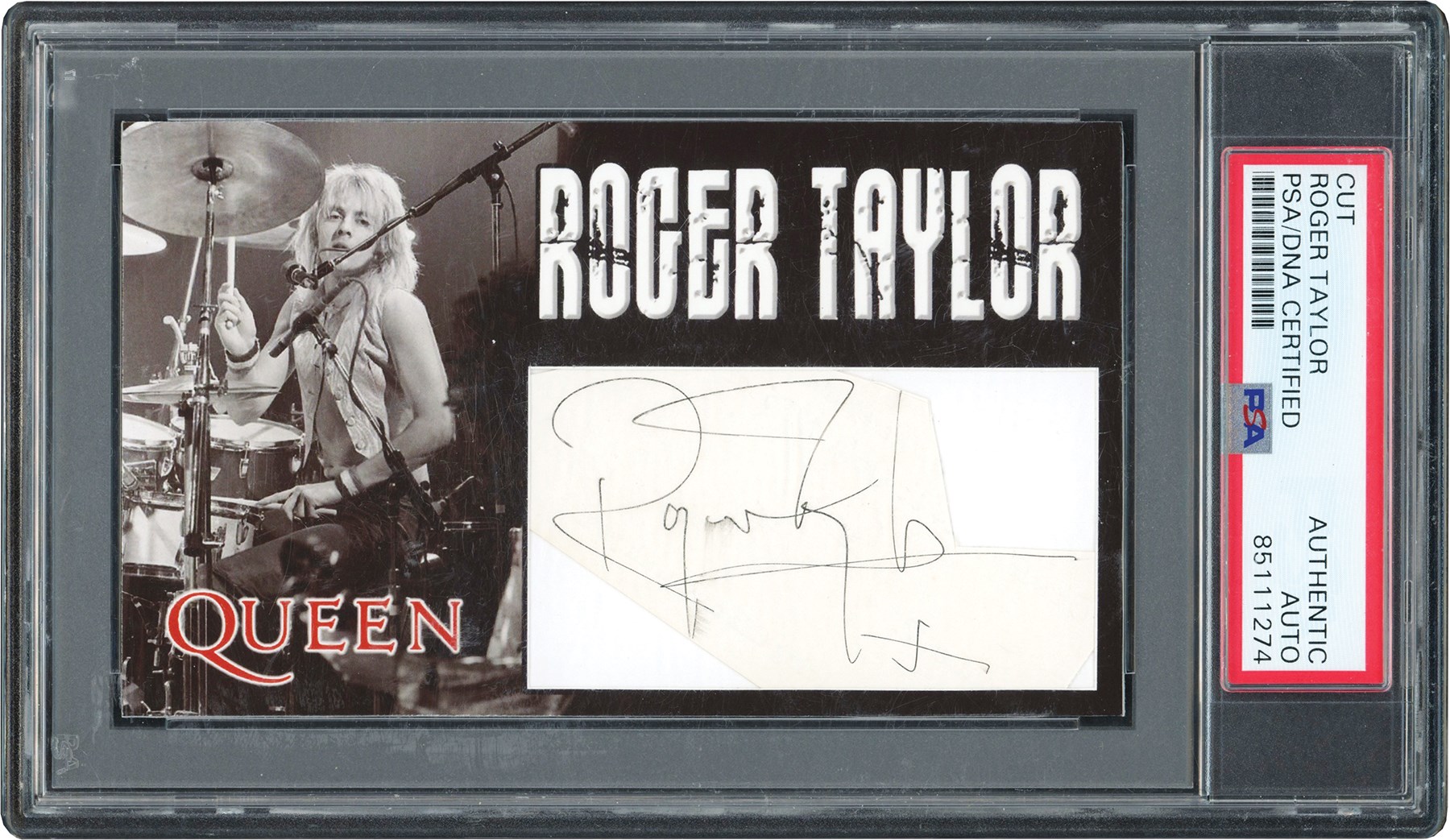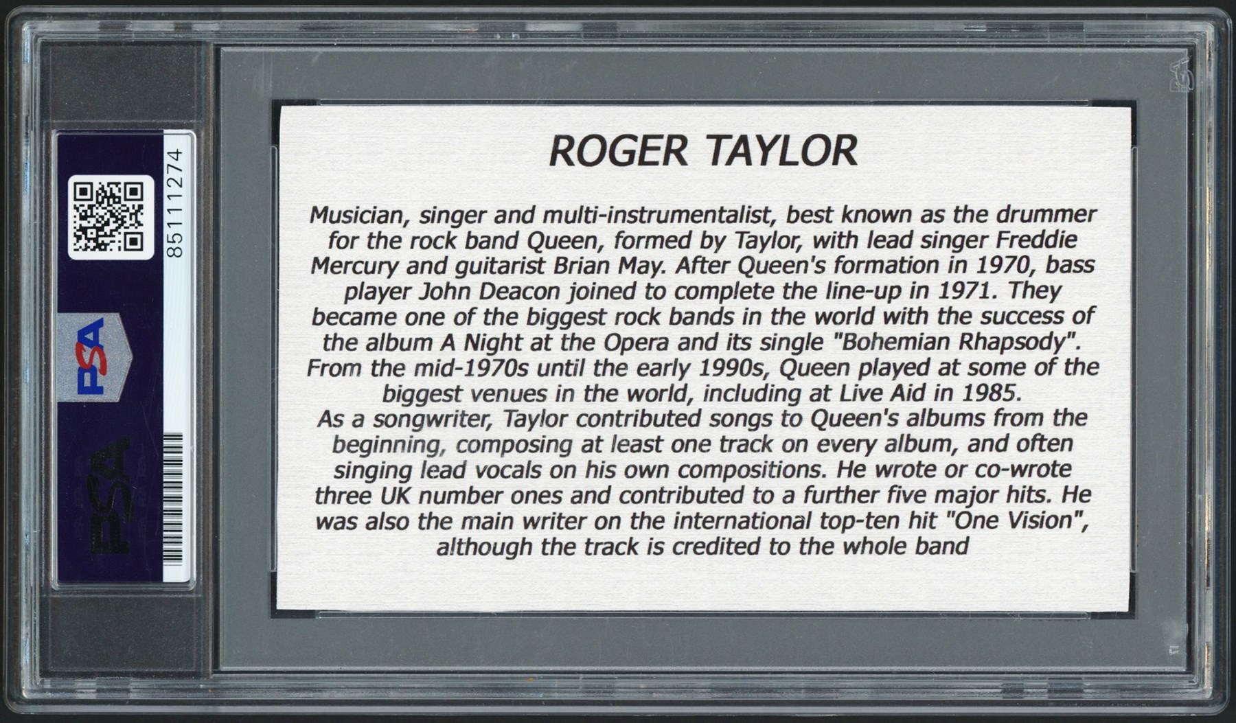 The Taylor cut signature is on an irregularly cut white piece of paper or card stock measuring approx. 1.6x2.8", that is placed in a cut-out area of the front of the card display. Taylor signed a bold signature in black ballpoint ink. There is a very slight smear of part of "Roger." The card display reads, "ROGER TAYLOR/QUEEN" on front. On back is a biography of Taylor. The card has been encapsulated and PSA/DNA Certified as "AUTHENTIC AUTO."