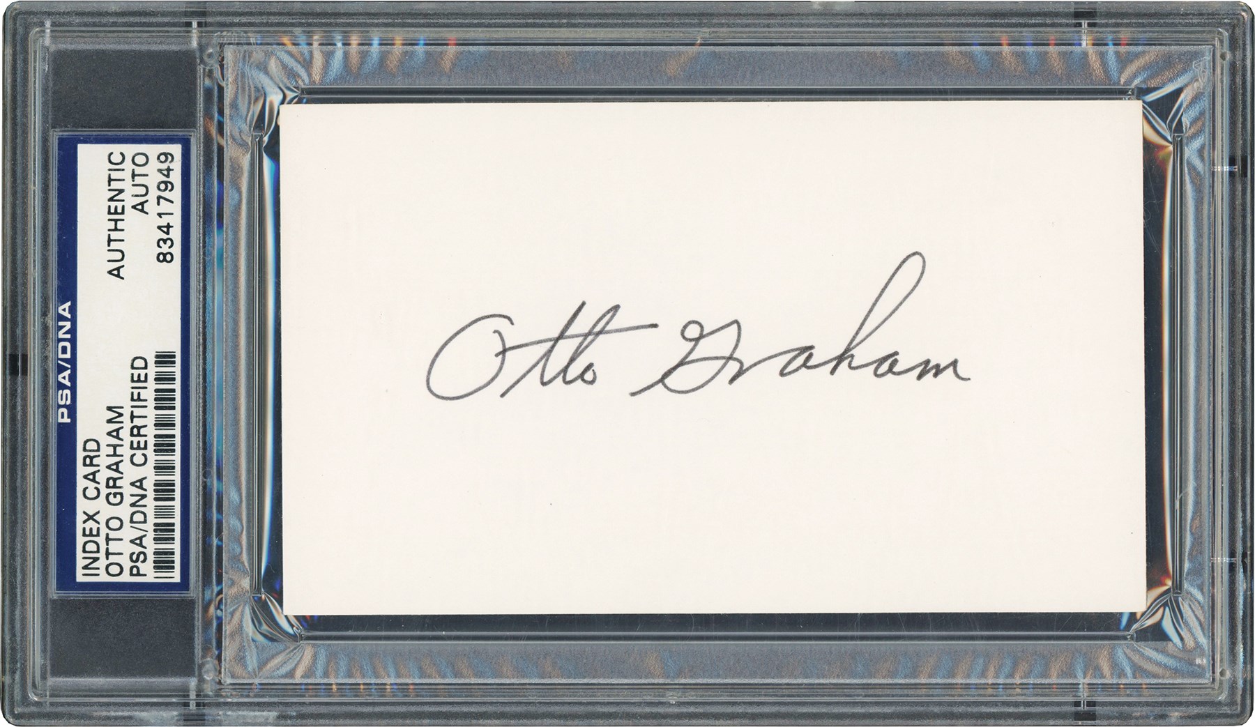 Graham used a fine tip black marker to craft a neat signature on a 3x5" blank, unlined file card. The signed card is in EXCELLENT condition. The file card has been encapsulated and PSA/DNA Certified as "AUTHENTIC AUTO" (#83417949).