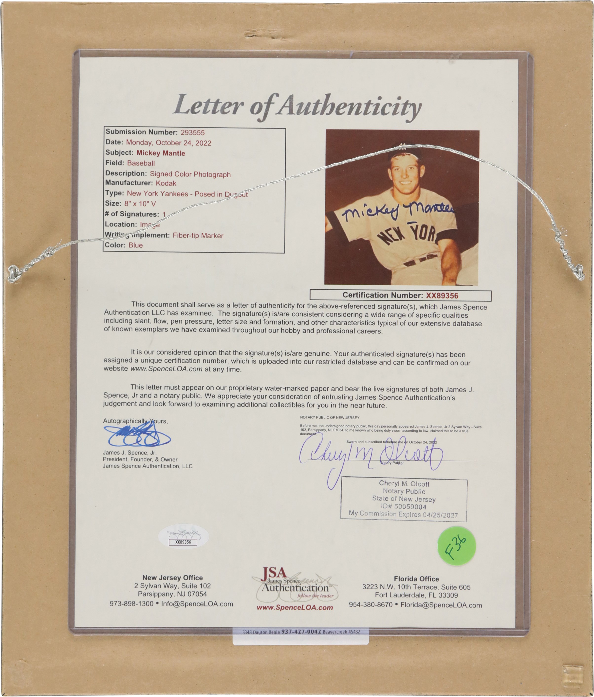 The offered photograph measures 6.5x8.5", matted and framed to 11.5x13.5". The Mantle signature is in blue, fiber-tip marker. Mantle signed this post-career at an autograph show, most likely in the '90s.  While neat, the signature does not have the graceful, beautiful flow of his later signatures. What makes this of high interest is that Mantle signed with his rookie autograph style, but most likely at least four decades after his rookie 1951 season. Offering comes with a JSA LOA for the signature. The autograph appears to be 10/10. The offering is in EXCELLENT condition.