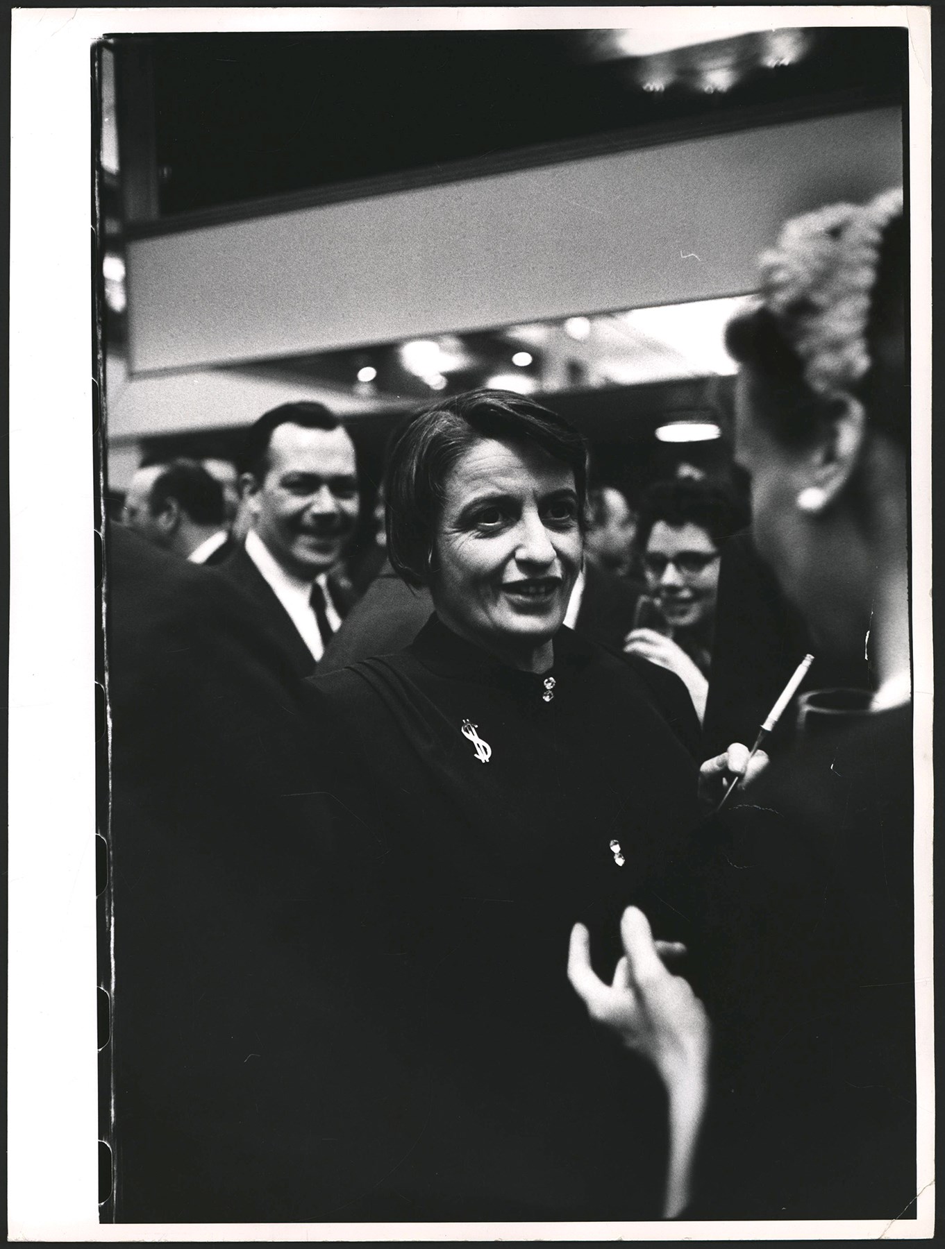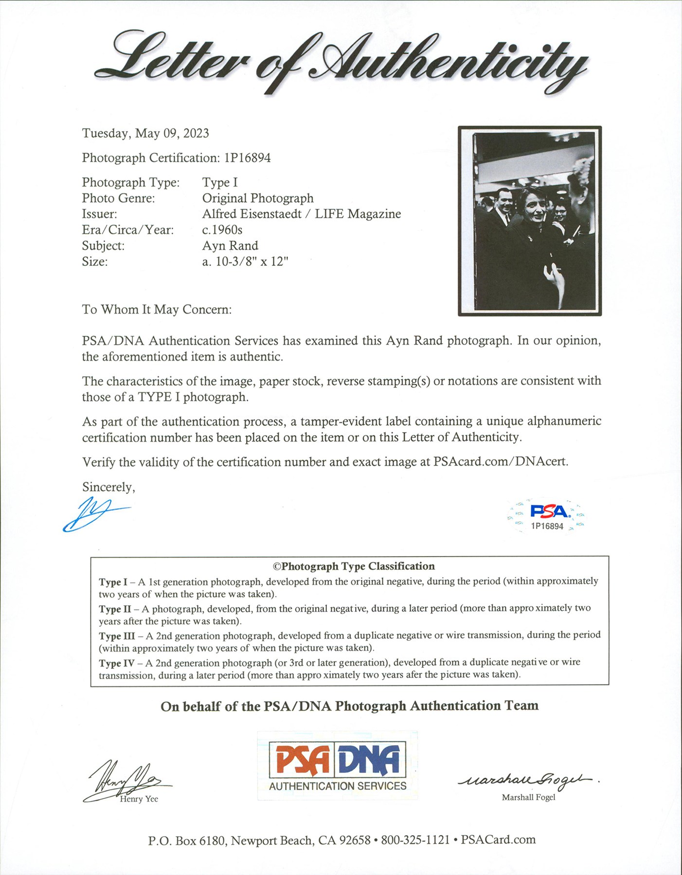 The offered black & white photo measures approx. 10.4x12". The photo shows Rand in public, with others in the background. On back of the photo is a stamped "LIFE PICTURE COLLECTION", and written by an unknown hand is blue editor's pencil: "Photo#5580570". Also, stamped on back "LIFE PHOTO By ALFRED EISENSTAEDT", an esteemed photojournalist who had over 90 of his photos on the cover of LIFE Magazine and over 2,500 photo-stories in LIFE. Eisenstaedt is most famous for his V-J Day in Times Square. That iconic shot pictured a sailor kissing a nurse to celebrate the end of World War II. Eisenstaedt was posthumously inducted in 2020 into the International Photographers Hall of Fame and Museum. The photograph comes with a PSA/DNA LOA for the Type I photograph (1P16894). The photograph is in EXCELLENT condition.