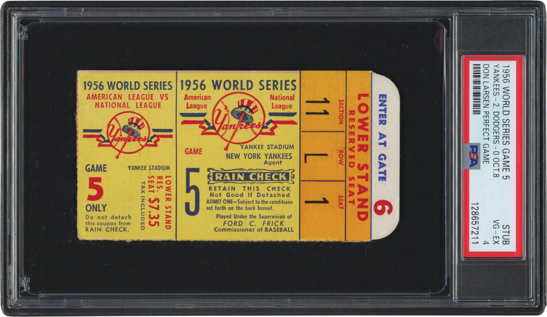 Don Larsen World Series perfect game ticket stub. This perfect piece of World Series history is encapsulated and graded VG-EX 4 by PSA. The ticket measures 4.25x2.25" and is a relic from the day that Don Larsen pitched the first and only perfect game in World Series history. Larsen needed just 97 pitches to retire 27 Dodgers in a row in the historic game at Yankee Stadium on October 8, 1956.