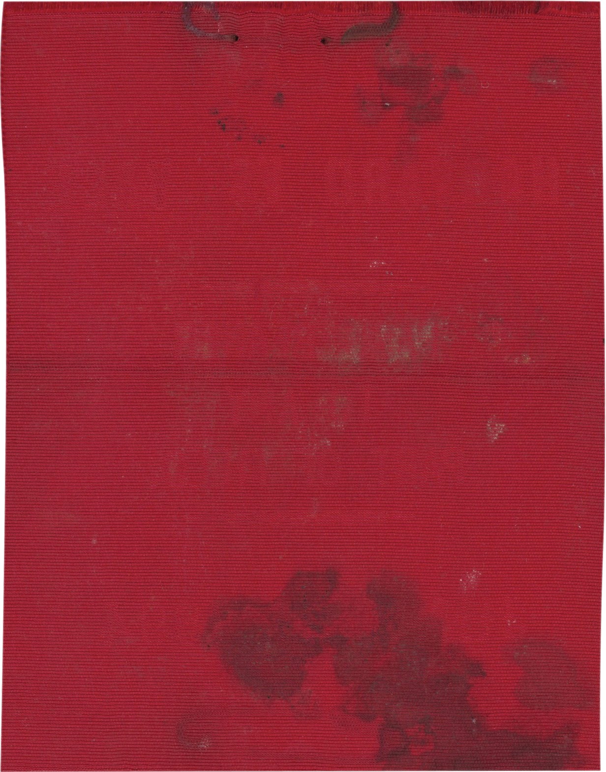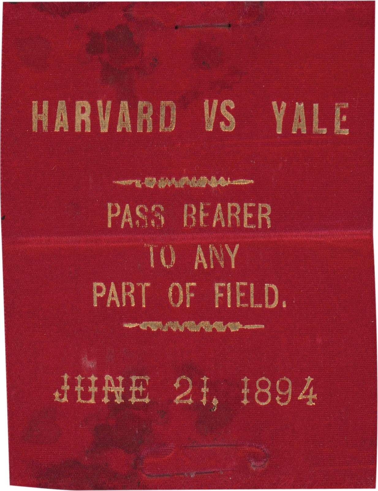 The pass to the game, cloth or cloth-like, measures approx. 3.1x4.1". The pass is in Harvard Crimson, with gold-colored letters and numerals. Machine stamped on the pass: "HARVARD VS YALE/PASS BEARER TO ANY PART OF FIELD JUNE 21, 1894." The pass appears to have been a somewhat rough cut from something larger. The pass has a horizontal fold across the middle, and there are a number of small stains, mostly above or below the lettering and numerals. The offering comes with a photocopy of a box score of the aforementioned game. The game pass makes a fine remembrance of the vintage early days of college baseball.