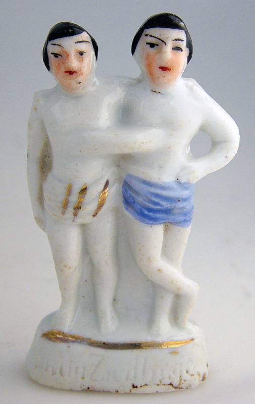 Delightful 19th century porcelain figurine of the most famous sideshow freaks that ever lived. Eng & Chang Bunker, the original Siamese Twins, from whom the term "Siamese Twin" was derived. The two brothers were born in Siam (Thailand) in 1811 and were connected at the chest. Under their managers, they gave demonstrations and lectures all over the world, particularly in U.S. locations. Interestingly, the two brothers fathered 21 children between them with two sisters to whom they were married. 3" tall figure is a spitting image of the biological oddities. Likely sold as a souvenir while the brothers were on display to the general public. This piece is believed to be German, with the words, "Siam Zwillinge" (translates as "Siamese twins") engraved on the front of the podium. Nicely painted and in Excellent condition.