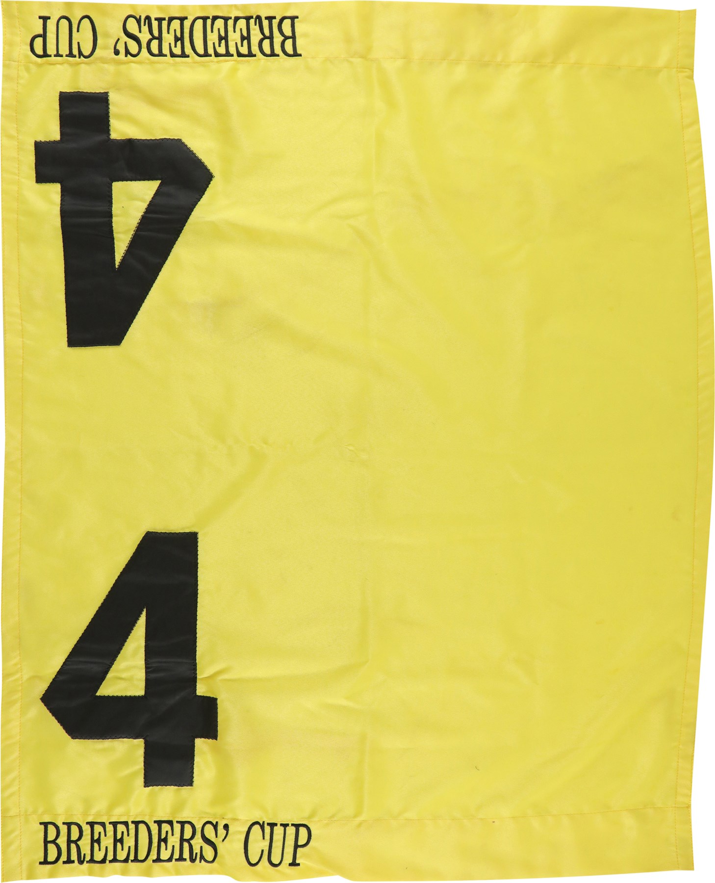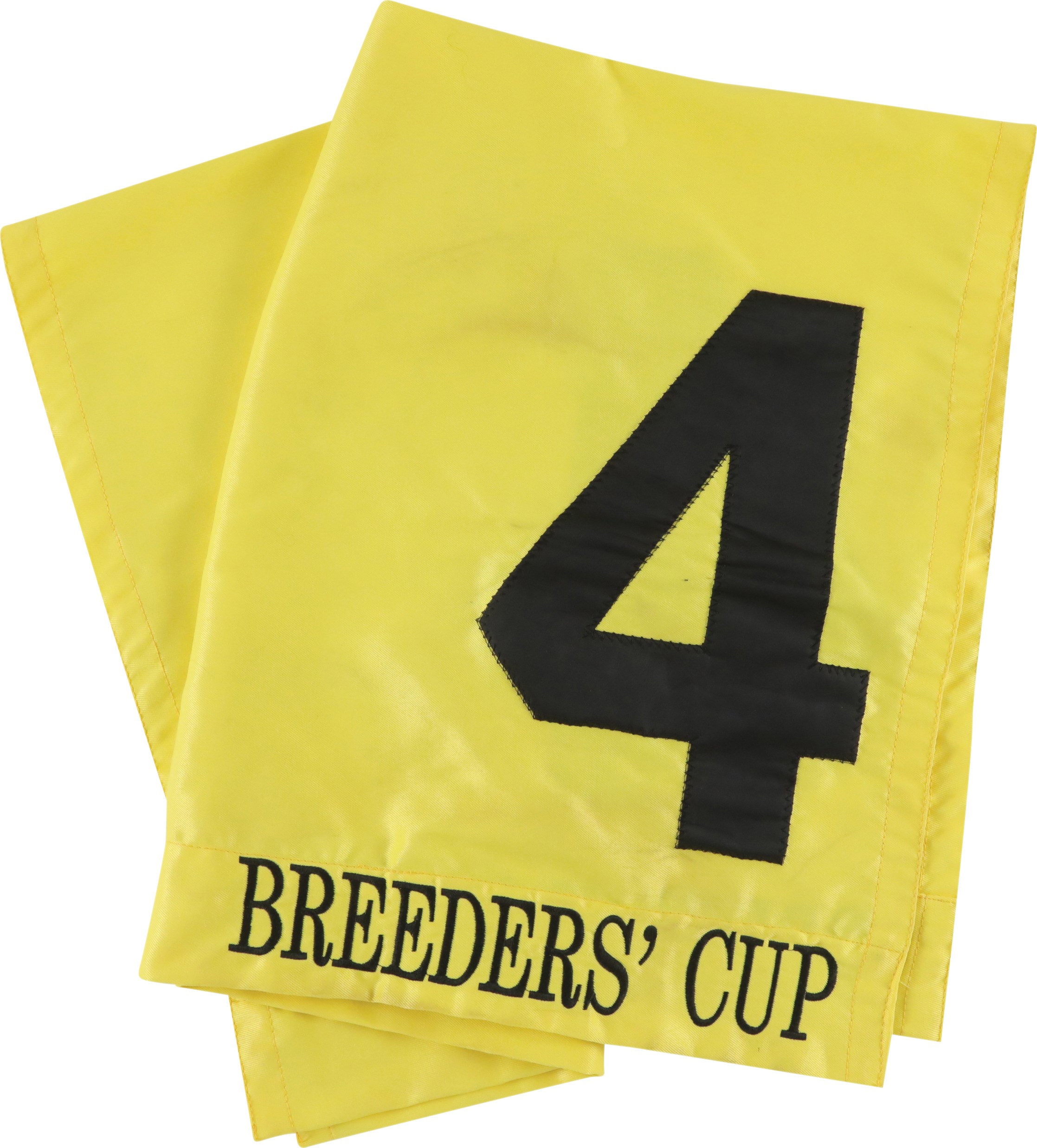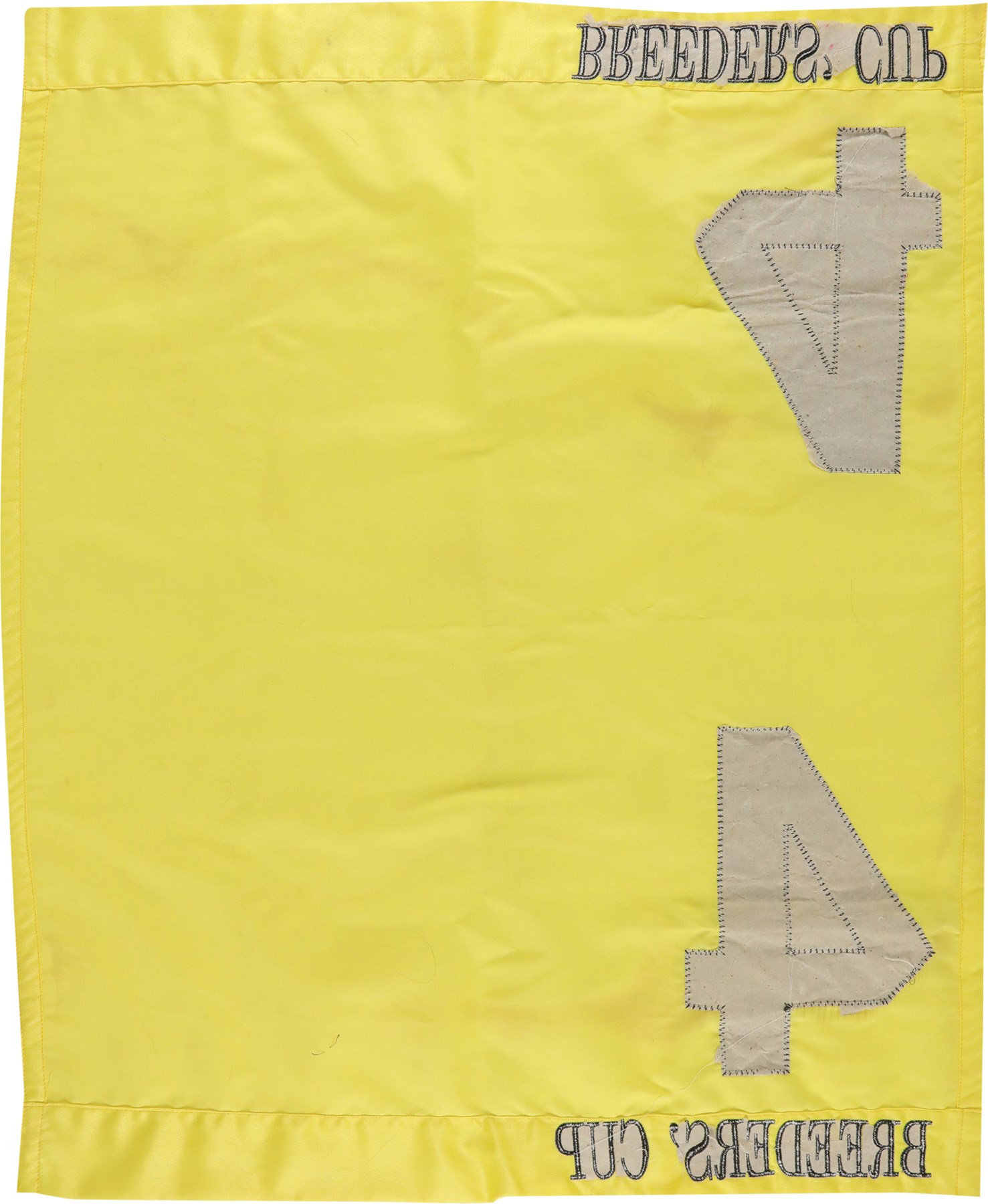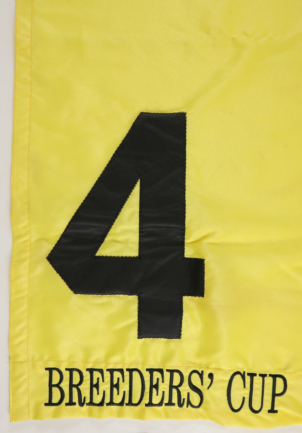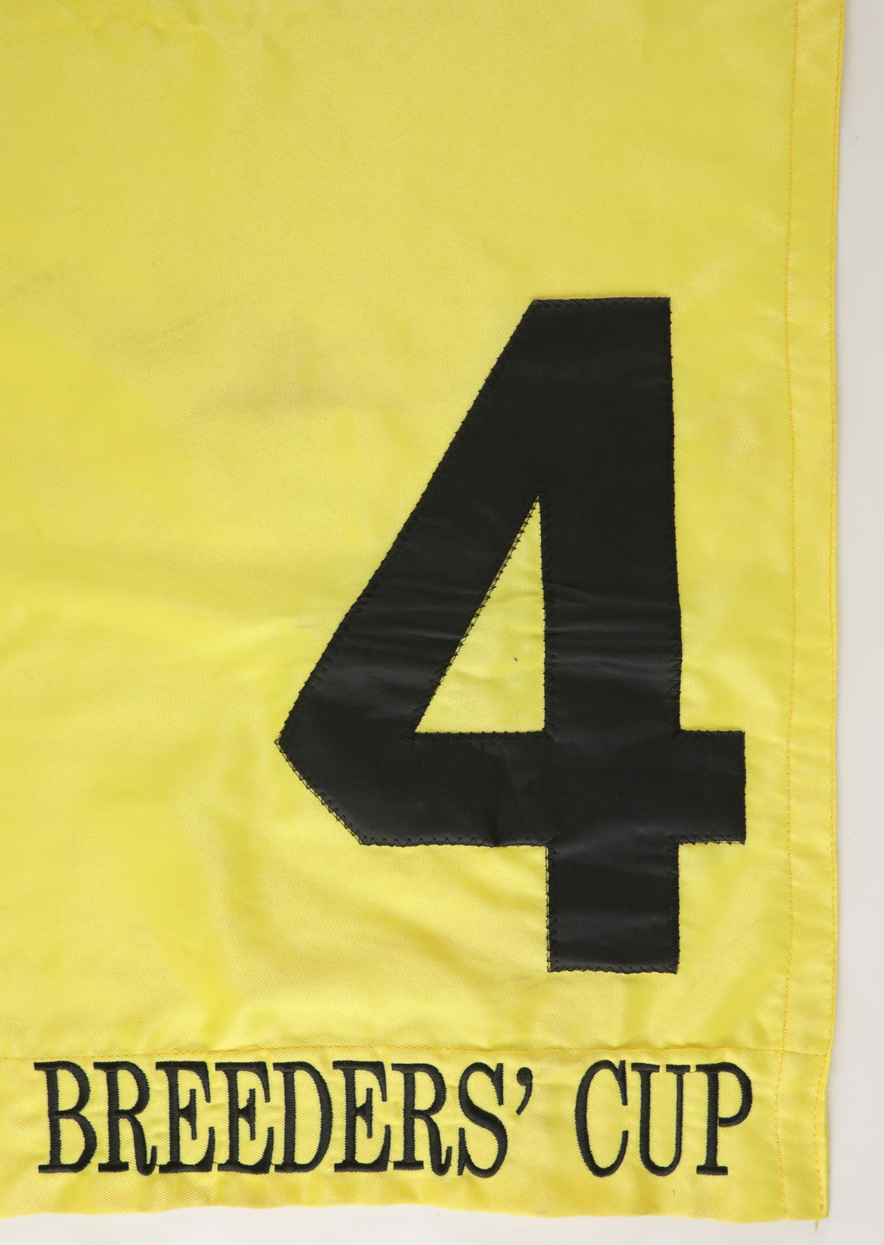 2009 Zenyatta Breeders' Cup winner race worn saddle cloth. When unfolded, the yellow and black cloth measures 31x39". "BREEDERS' CUP" (12" wide x 2" tall) and "4" (8" wide x 11" tall) are stitched to the cloth. The 2009 Breeders' Cup took place on November 6th and 7th at Santa Anita Racetrack in Arcadia, California. The race was a highly-anticipated event, mainly because the decision was made to race Zenyatta, a mare, against male horses. Zenyatta defeated 8 male horses in the riveting race. The win was historic as Zenyatta became the first female horse to win the Breeders' Cup.