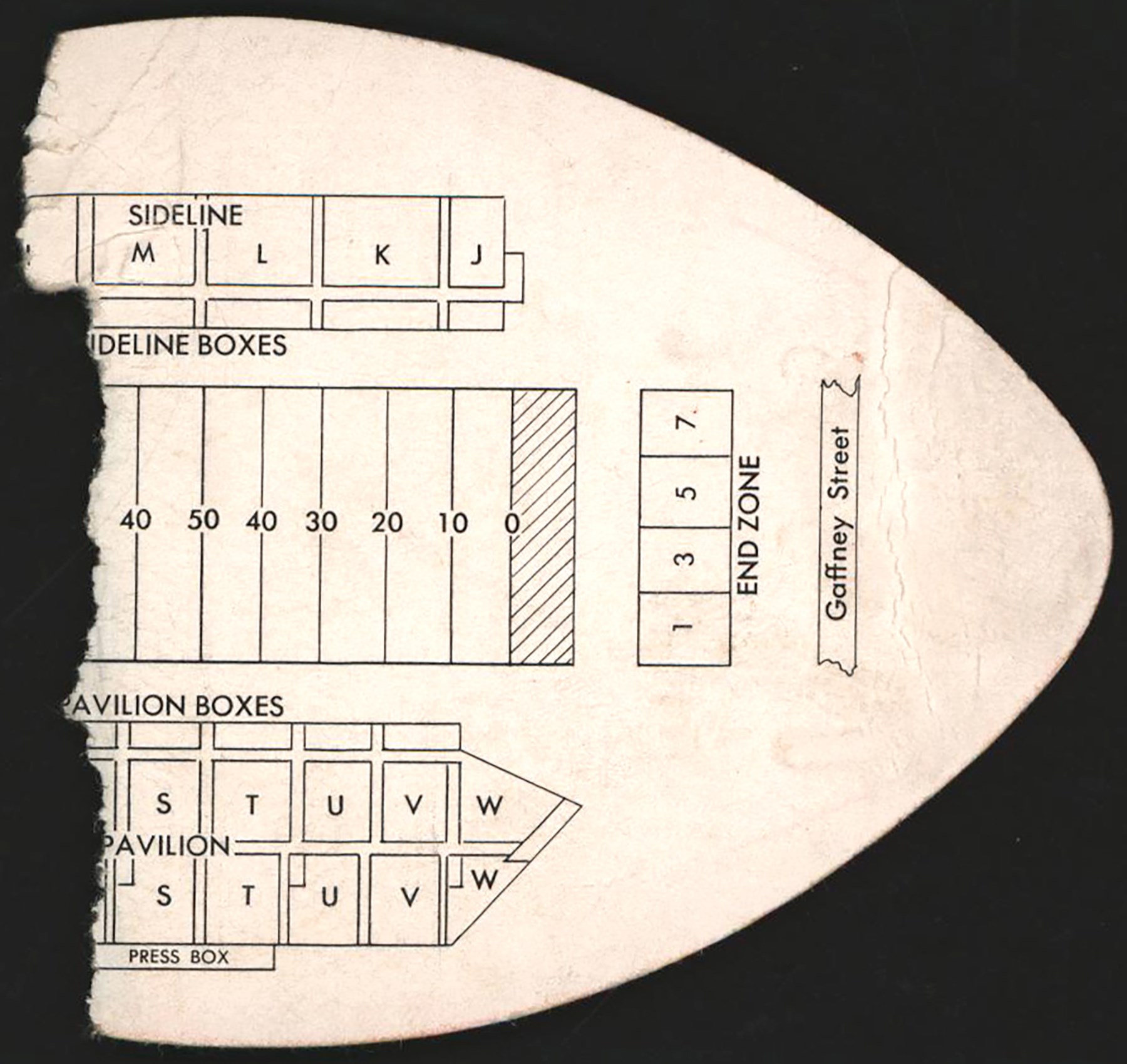 Rare Boston Patriots program and ticket stub issued for the first game in American Football League (AFL) history on September 9, 1960, at Boston University's Nickerson Field. The Patriots hosted the Denver Broncos on that historic night, with the visitors prevailing by a score of 13-10. This is the first ticket stub from this game we have ever offered and we have seen few others at auction in the past twenty-five years. The program is also scarce and represents just the second we have handled. The ticket stub (approximately 3x2.75"), which is designed in the shape of a football, displays a few light creases and is in Good to Very Good condition. The program (8.25x11") displays light wear and is in Very Good to Excellent condition. A scarce pair of souvenirs relating to the birth of the AFL.