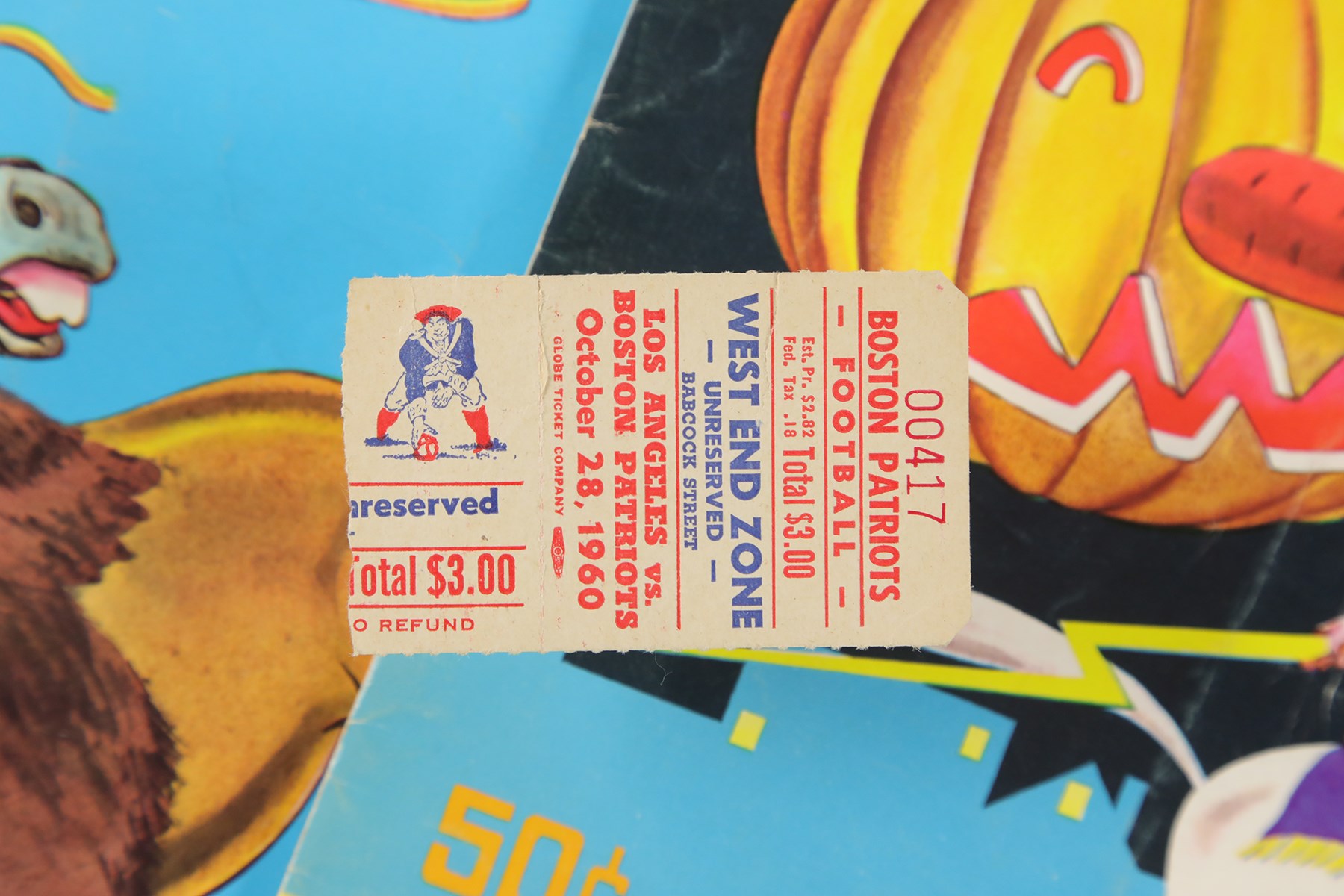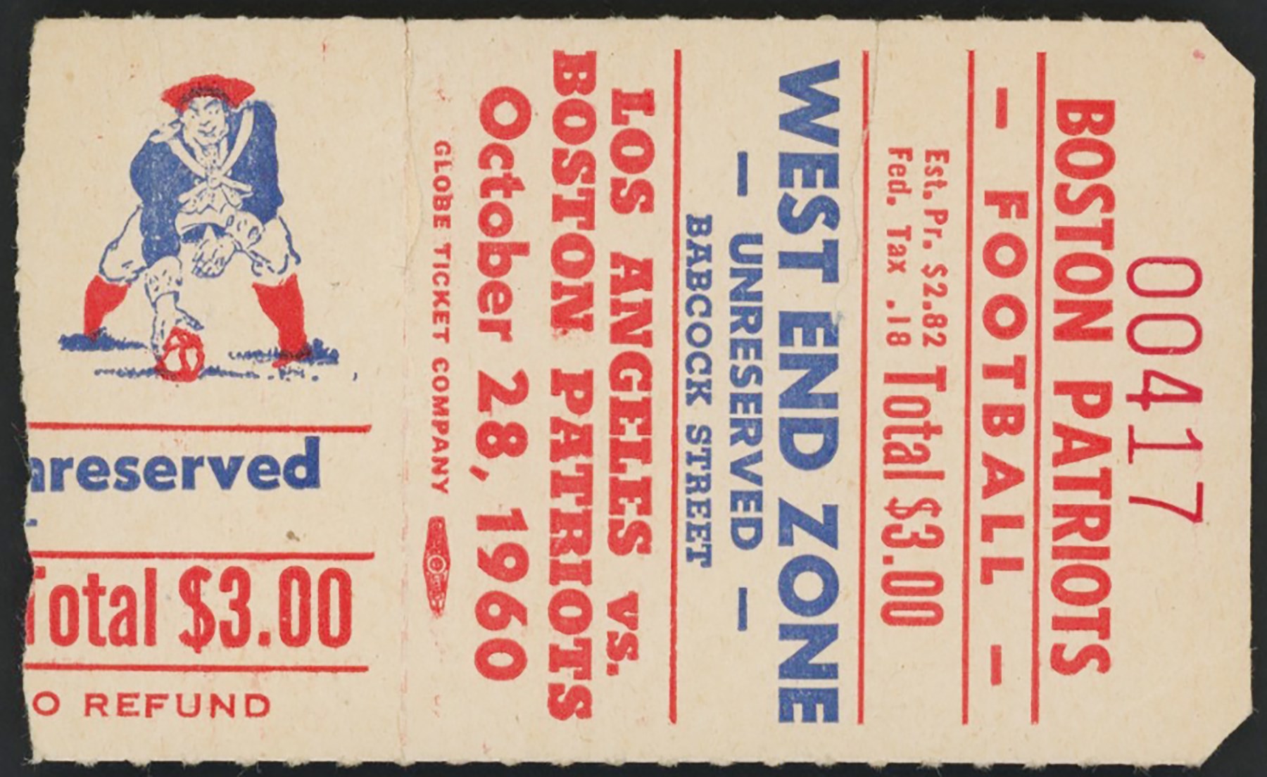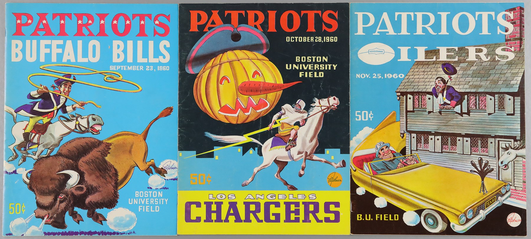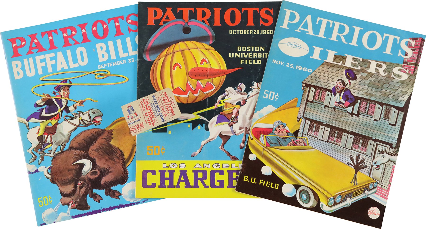 Collection of three Boston Patriots programs (8.25x11") and a ticket stub (3x1.75") dating from the American Football League's (AFL) inaugural season in 1960. Programs (3): 1) September 23rd vs.Buffalo Bills VG, with light vertical fold. 2) October 28th vs. Los Angeles Chargers. GD, with moderate creasing. 3) November 25th vs. Houston Oilers. VG-EX. Ticket Stub: October 28th vs. Los Angeles Chargers. VG.