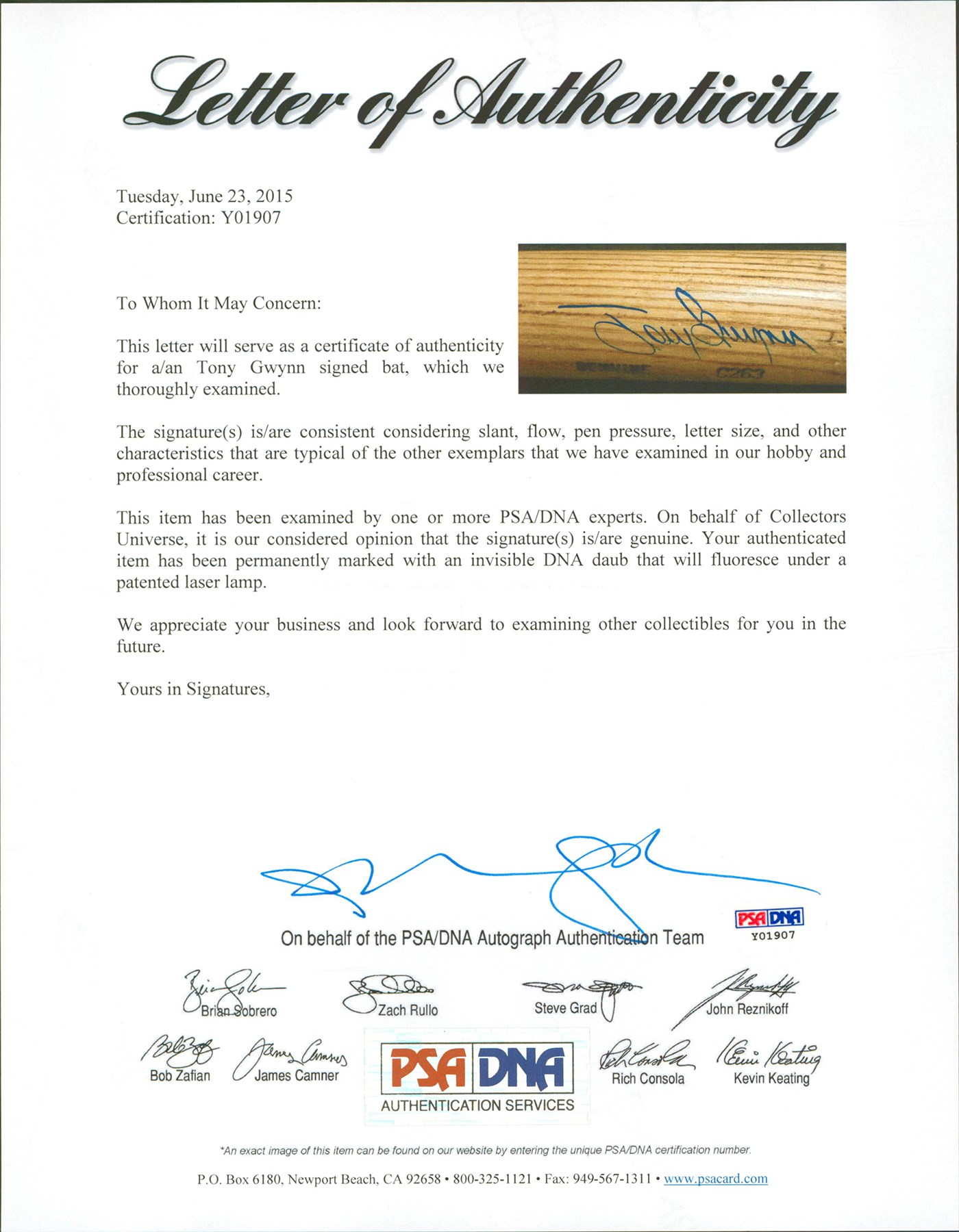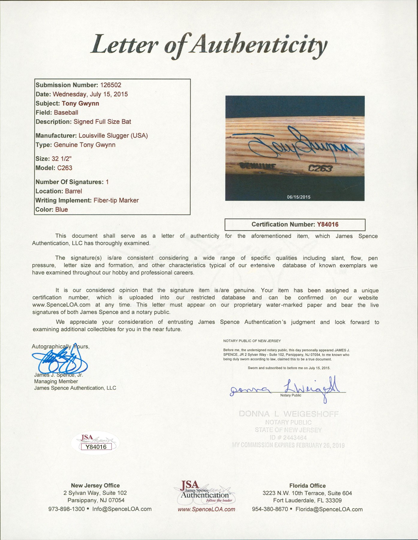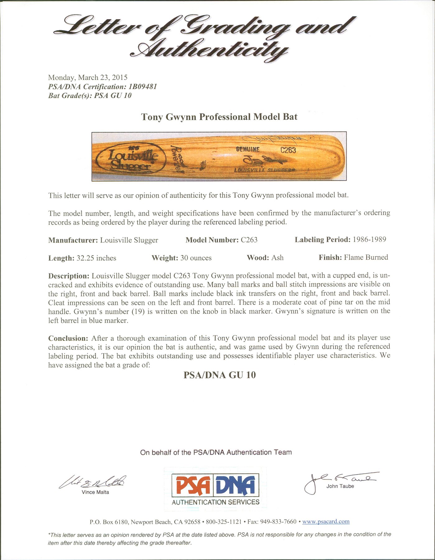 Lot # 600: 1986-89 Tony Gwynn San Diego Padres Signed Game Used Bat (PSA GU 10)