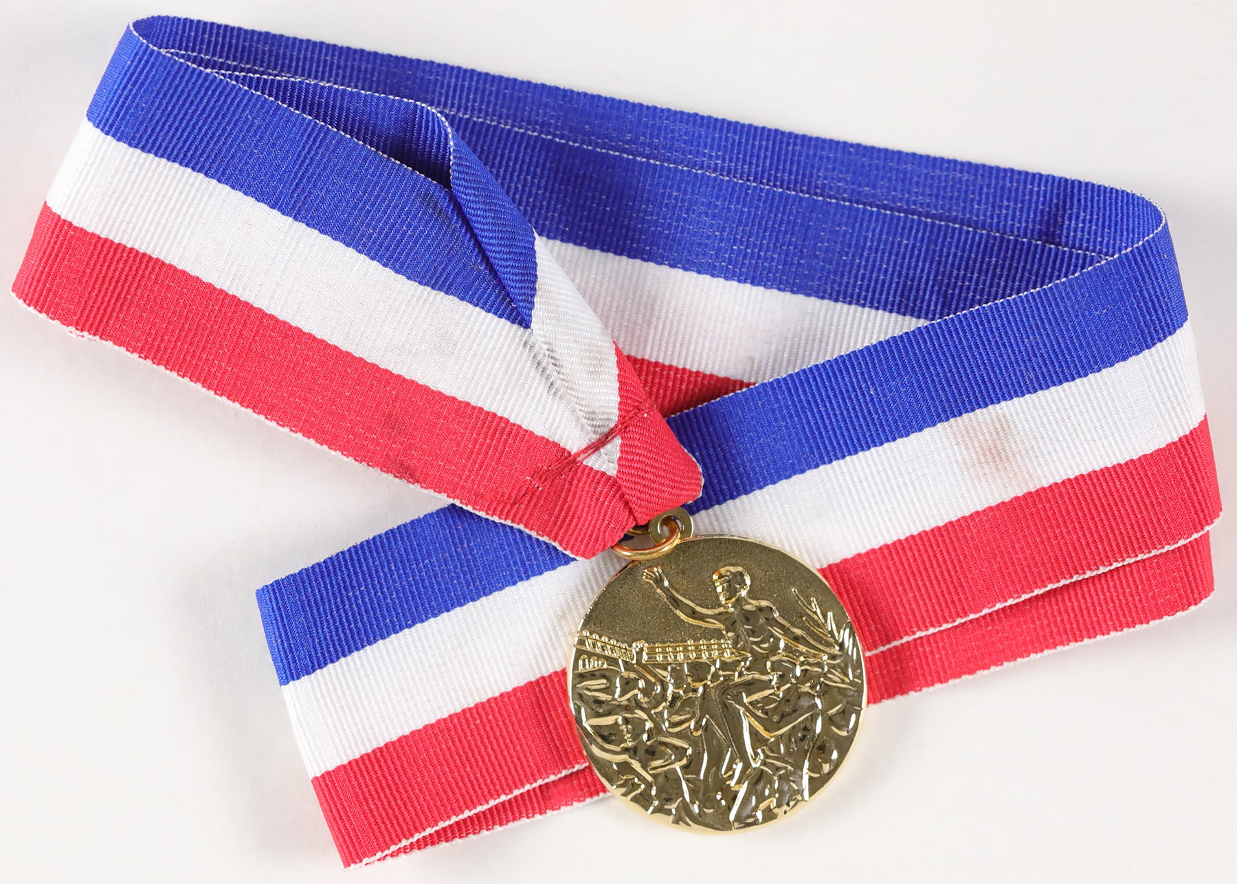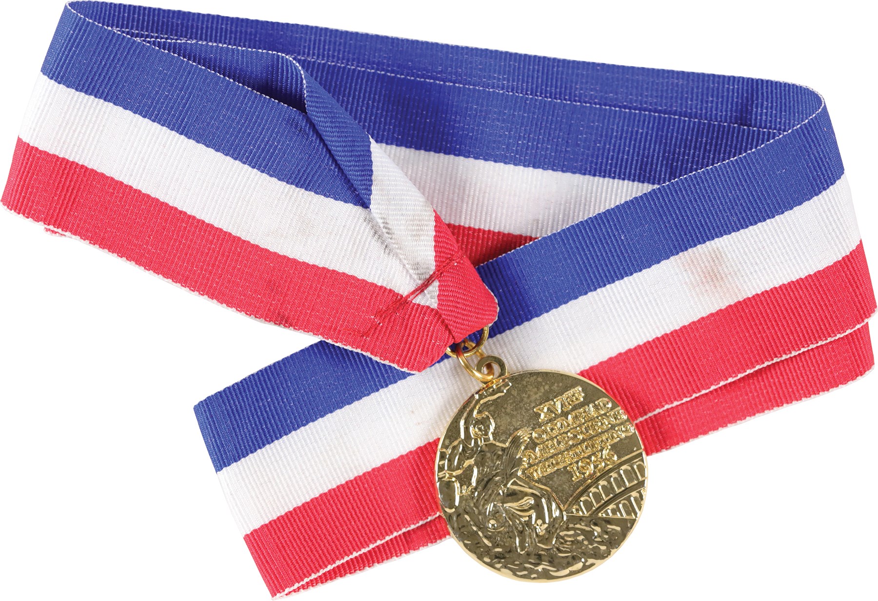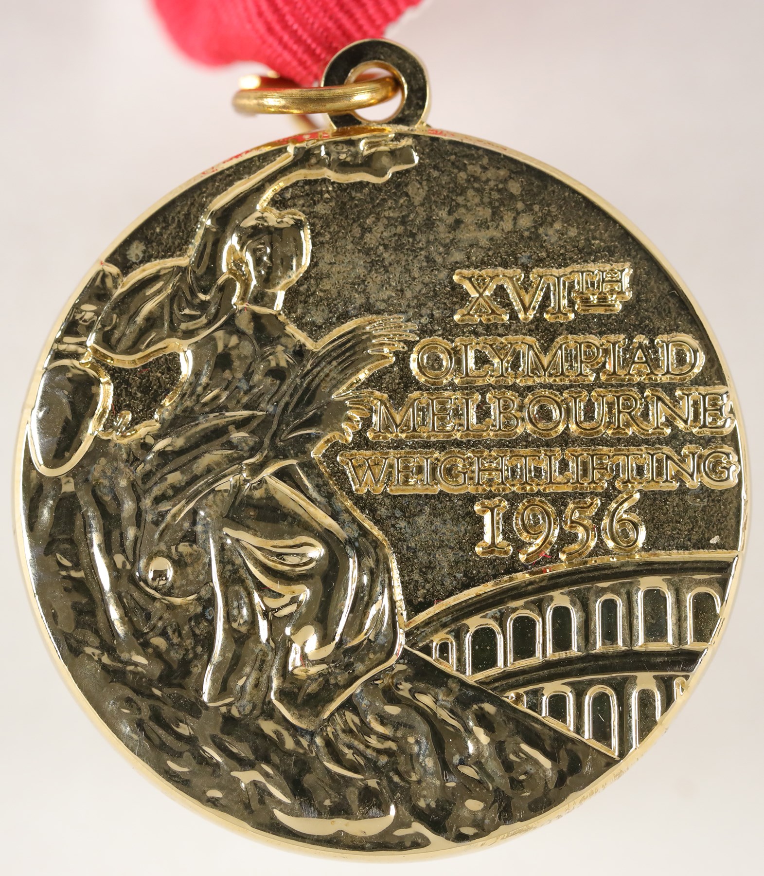 1956 Olympics replica gold medal. The red, white, and blue ribbon is 14.5" long, and 1.5" wide. There are two light scuff marks/discolorations on the ribbon. The replica gold medal attached to the ribbon is 1.5" in diameter, and reads, "XVIth OLYMPIAD, MELBOURNE, WEIGHTLIFTING, 1956." Next to the text is an image of the traditional goddess of victory, holding a palm in her left hand, and a winner's crown in her right. On the opposite side of the medal, an Olympic champion is shown being carried by a crowd of people with a stadium in the background.