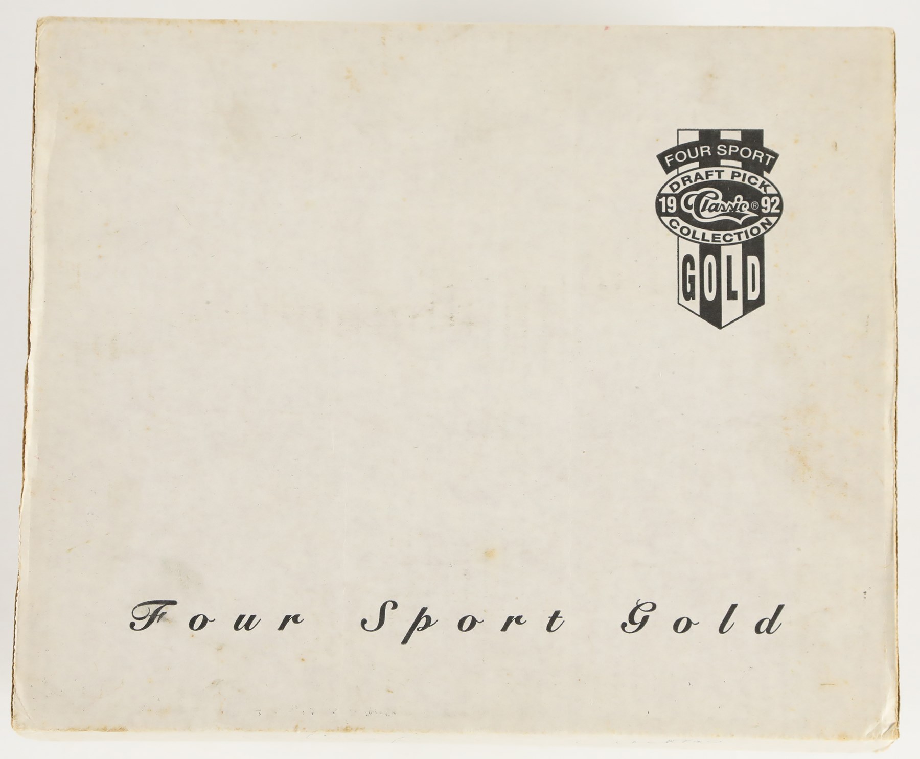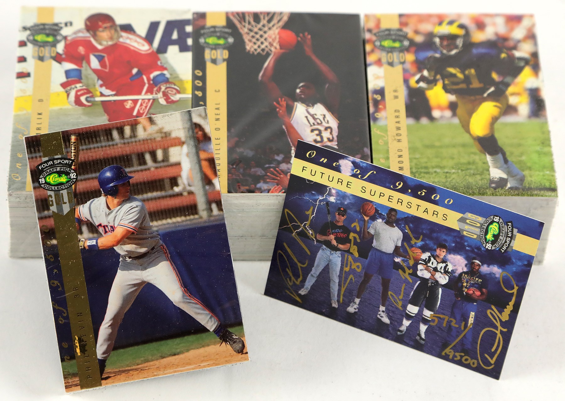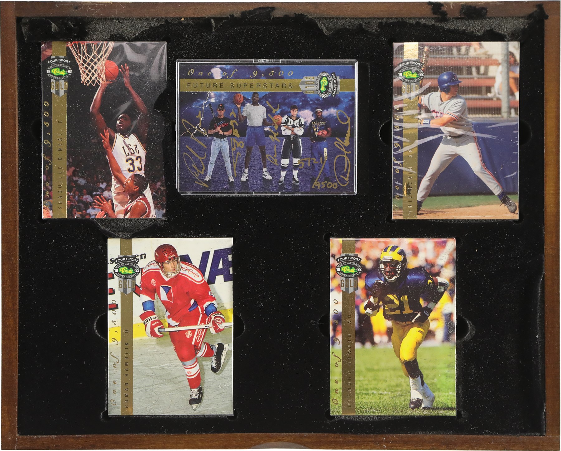 1992 Classic Four Sport Gold complete set in Presentation box. The set is still sealed in factory plastic wrap within a wooden presentation box with a metal placard with set 5721 of 9500 inscribed upon it. The set comes with a Future Superstars card which has been autographed in gold ink by Phil Nevin; Shaquille O' Neal; Roman Hamrlik; and Desmond Howard numbered 5721/9500. The hinges have come undone from the back of the box leaving the top and bottom detached from each other. Cards are assumed to be in NM or better condition.
