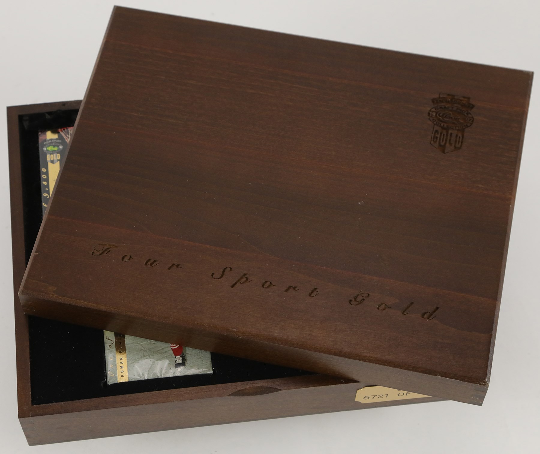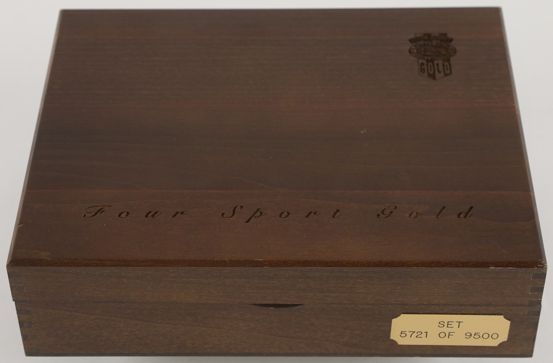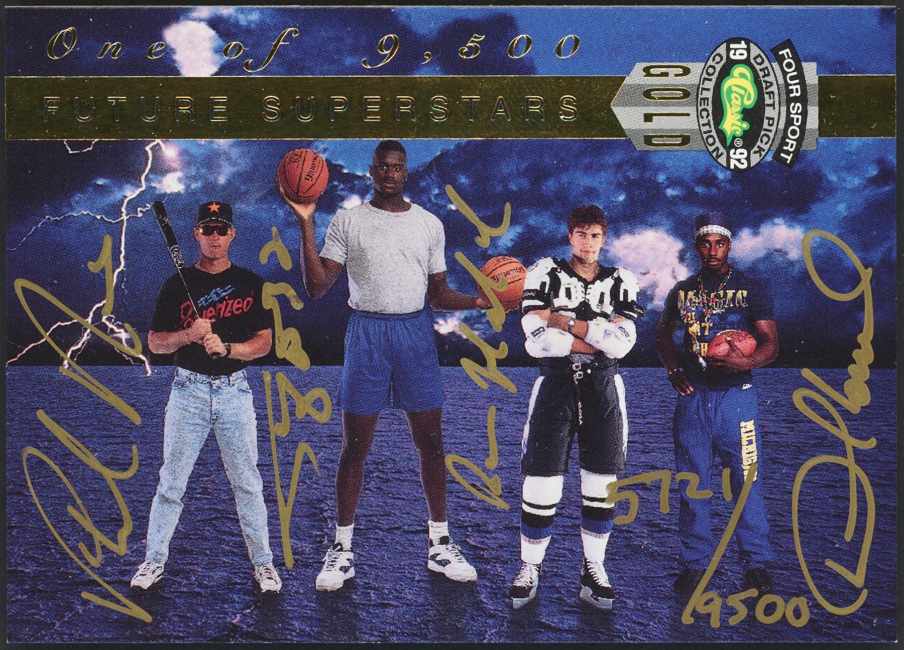 1992 Classic Four Sport Gold complete set in Presentation box. The set is still sealed in factory plastic wrap within a wooden presentation box with a metal placard with set 5721 of 9500 inscribed upon it. The set comes with a Future Superstars card which has been autographed in gold ink by Phil Nevin; Shaquille O' Neal; Roman Hamrlik; and Desmond Howard numbered 5721/9500. The hinges have come undone from the back of the box leaving the top and bottom detached from each other. Cards are assumed to be in NM or better condition.