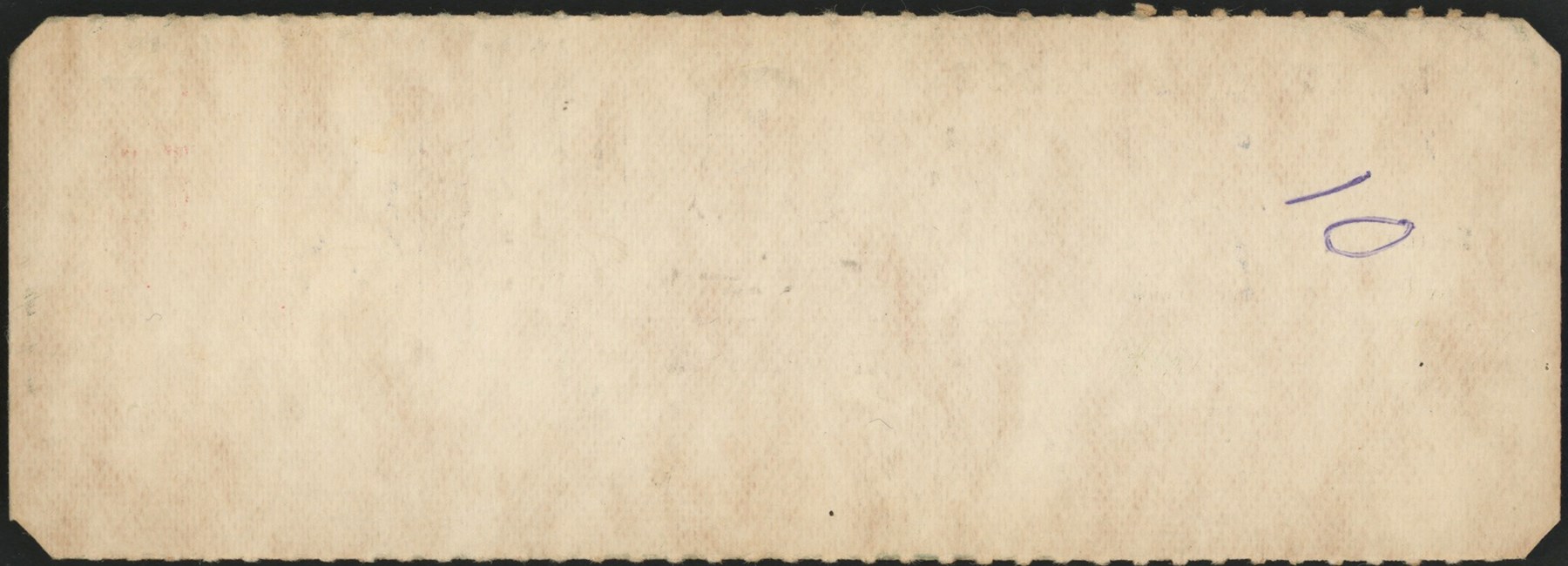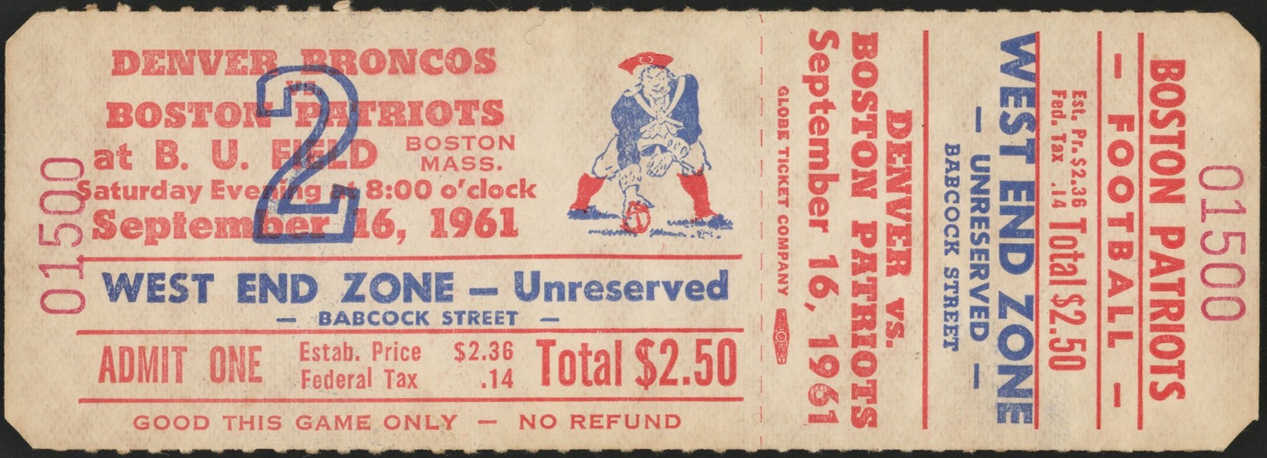 The full ticket measures 1.75x5". It reads, in part, "DENVER BRONCOS/BOSTON PATRIOTS at B.U. Field/BOSTON, MASS./SEPT. 16, 1961/WEST END ZONE/UNRESERVED/ADMIT ONE/TOTAL $2.50." Printed on back, by an unknown hand in blue ballpoint ink, is "10." The Patriots would eventually join the National Football League and become the New England Patriots, to much success, with six Super Bowl Championships. This full ticket makes a fine remembrance of the Patriots' early years. The ticket shows some slight darkening, but is in overall EXCELLENT condition.