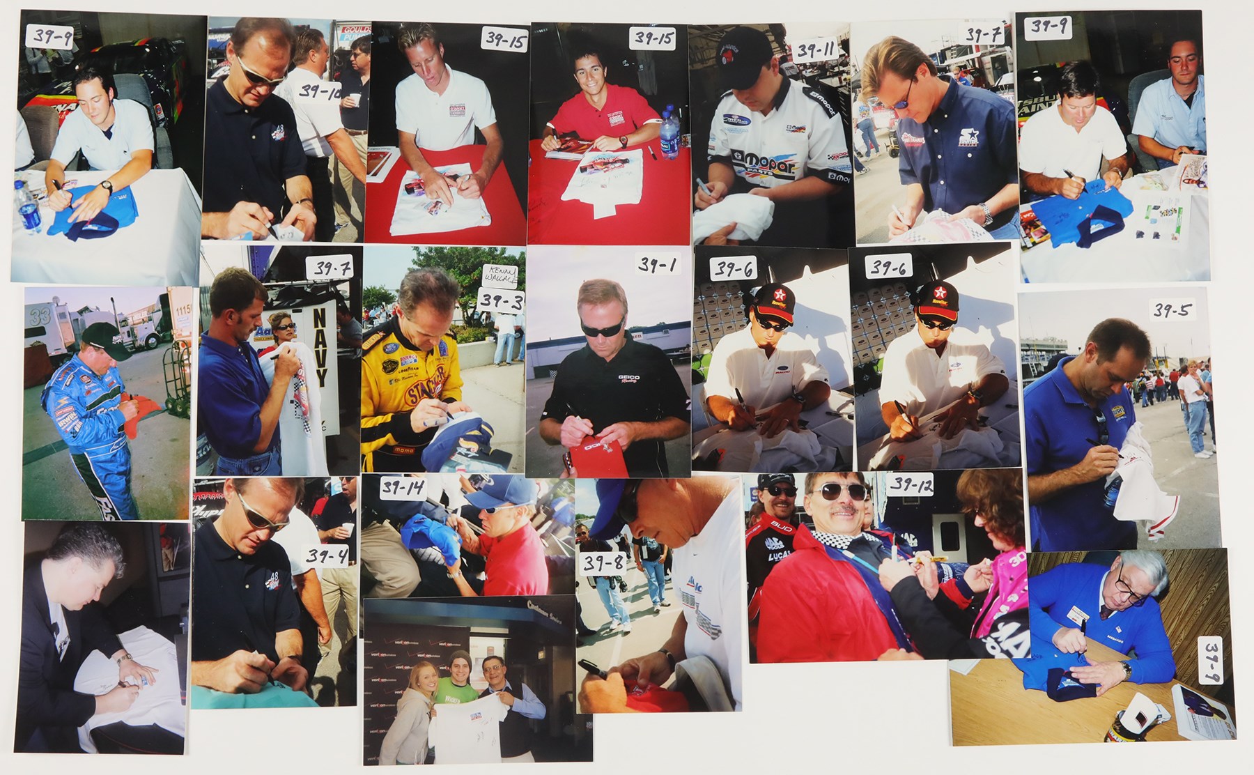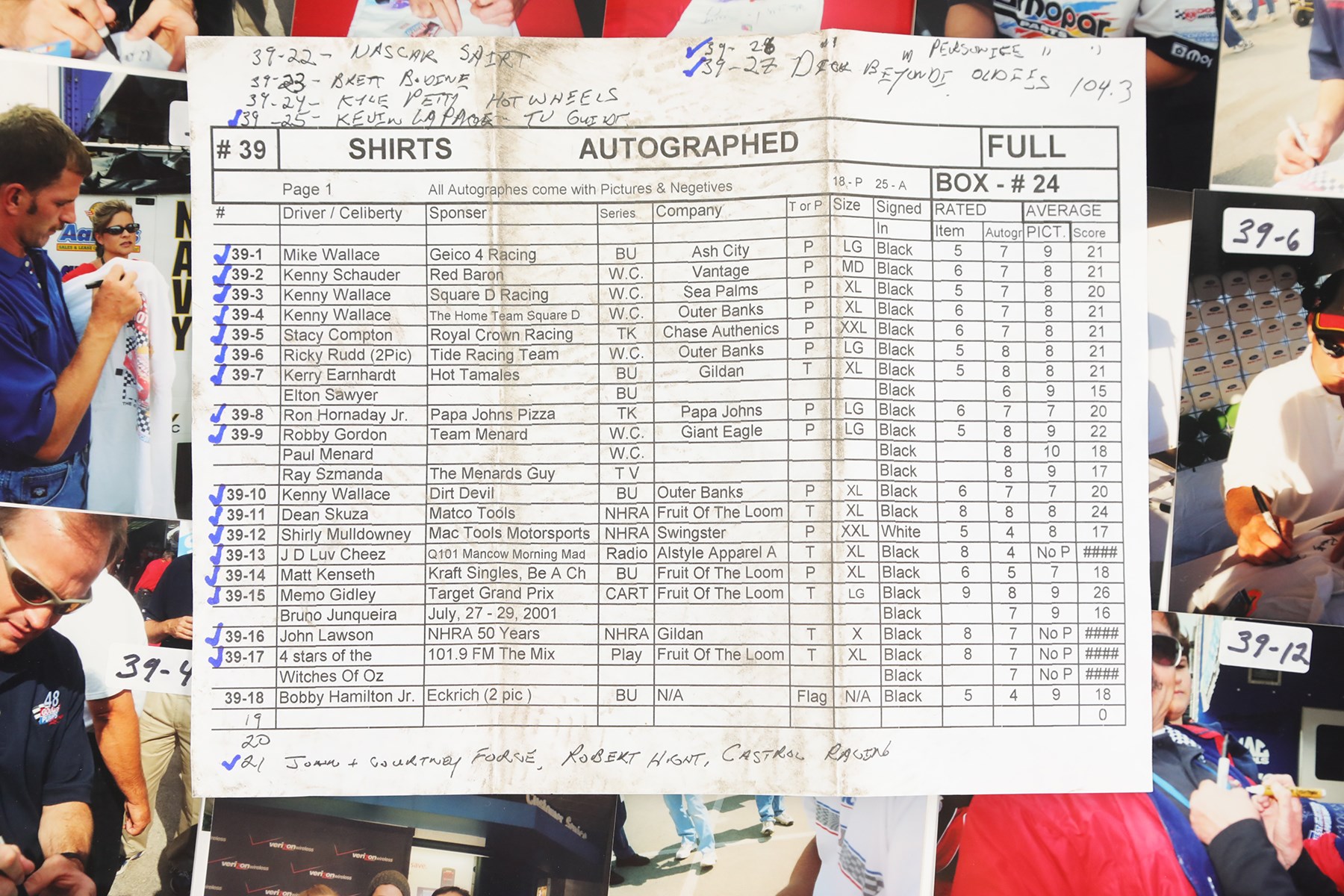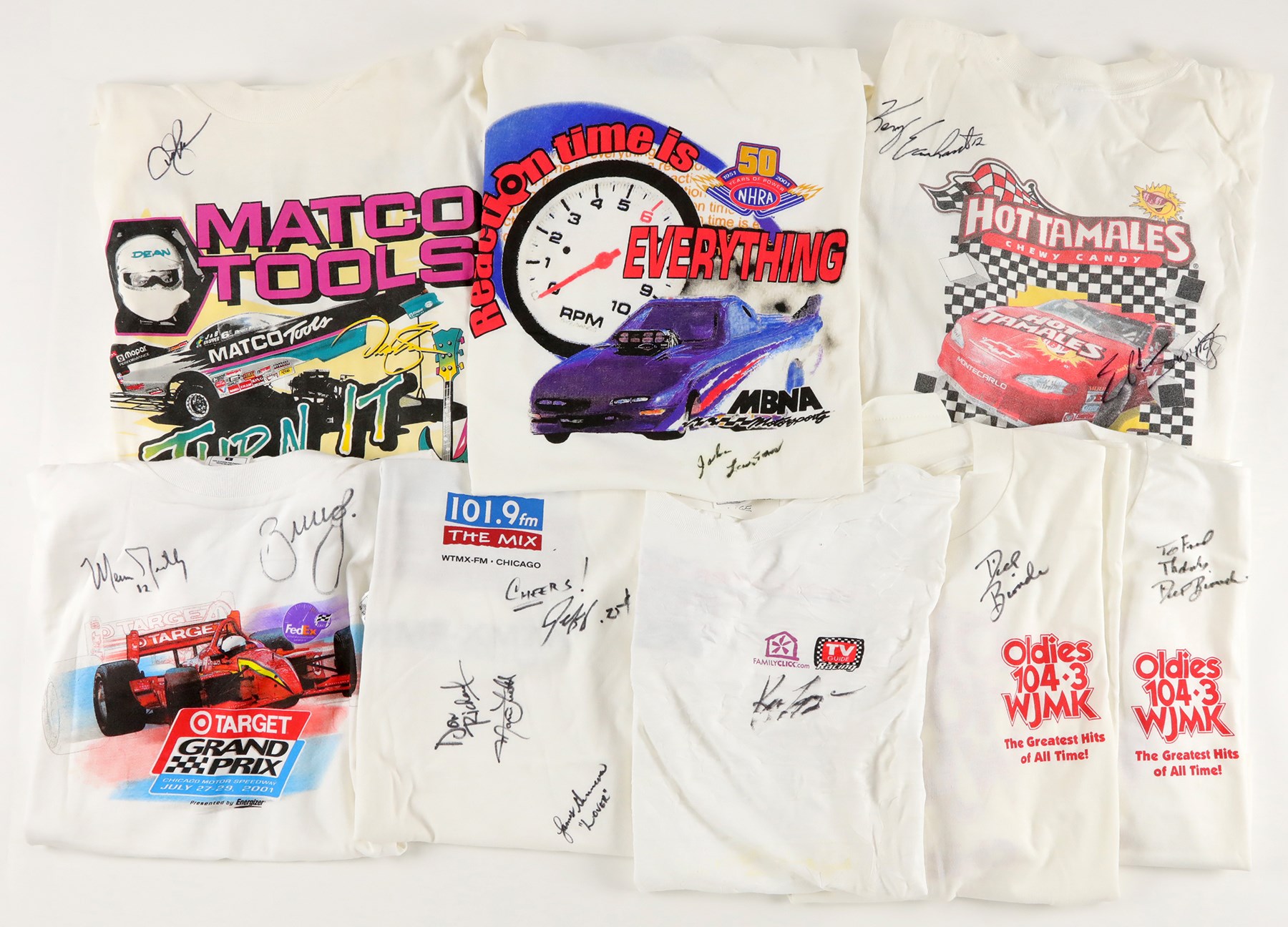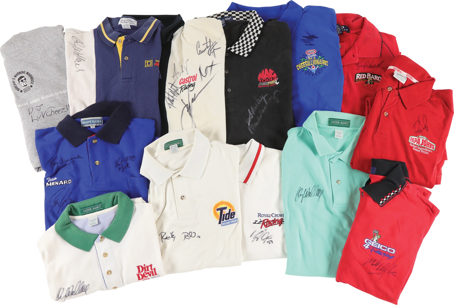 Collection of (21) shirts signed by racing stars and legends. Includes NASCAR, Hot Rod, and numerous other "Series." Shown in the photos is a detailed list of the signers, sponsor, series, company, T or P (Tee or Polo), size. Autographs include: Shirley Muldowney, Matt Kenseth, Kenny Wallace, Mike Wallace, Kerry Earnhardt, and many more. Shirts are either not worn or show light wear. Included are photos of the vast majority of racers signing their respective shirts.