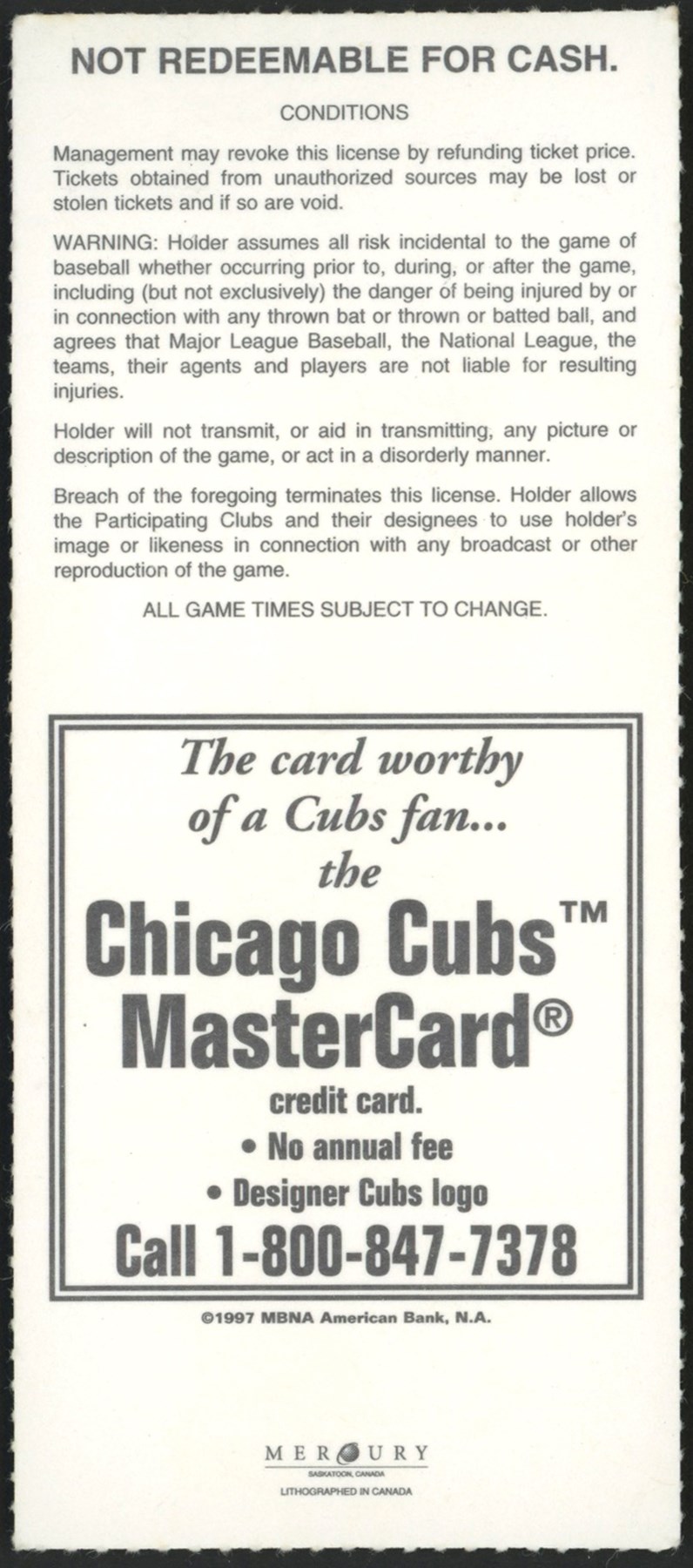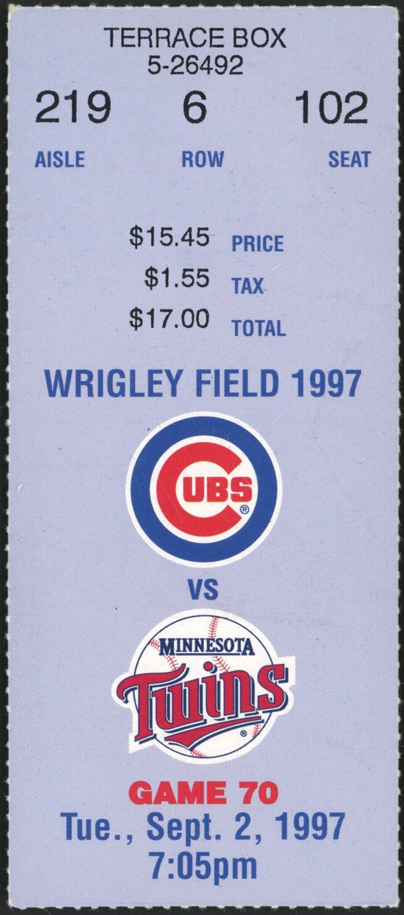 The offered stub measures approx. 1.75x4.25". It reads, in part, "TERRACE BOX/&$17.00 TOTAL/Wrigley Field 1997/CUBS vs MINNESOTA TWINS/GAME 70/Tue., Sept. 2, 1997/7:05 pm". The ticket stub is in EXCELLENT condition.