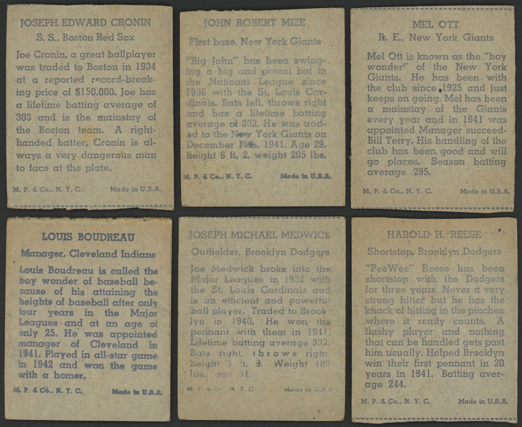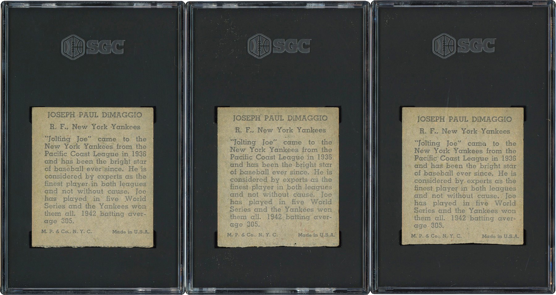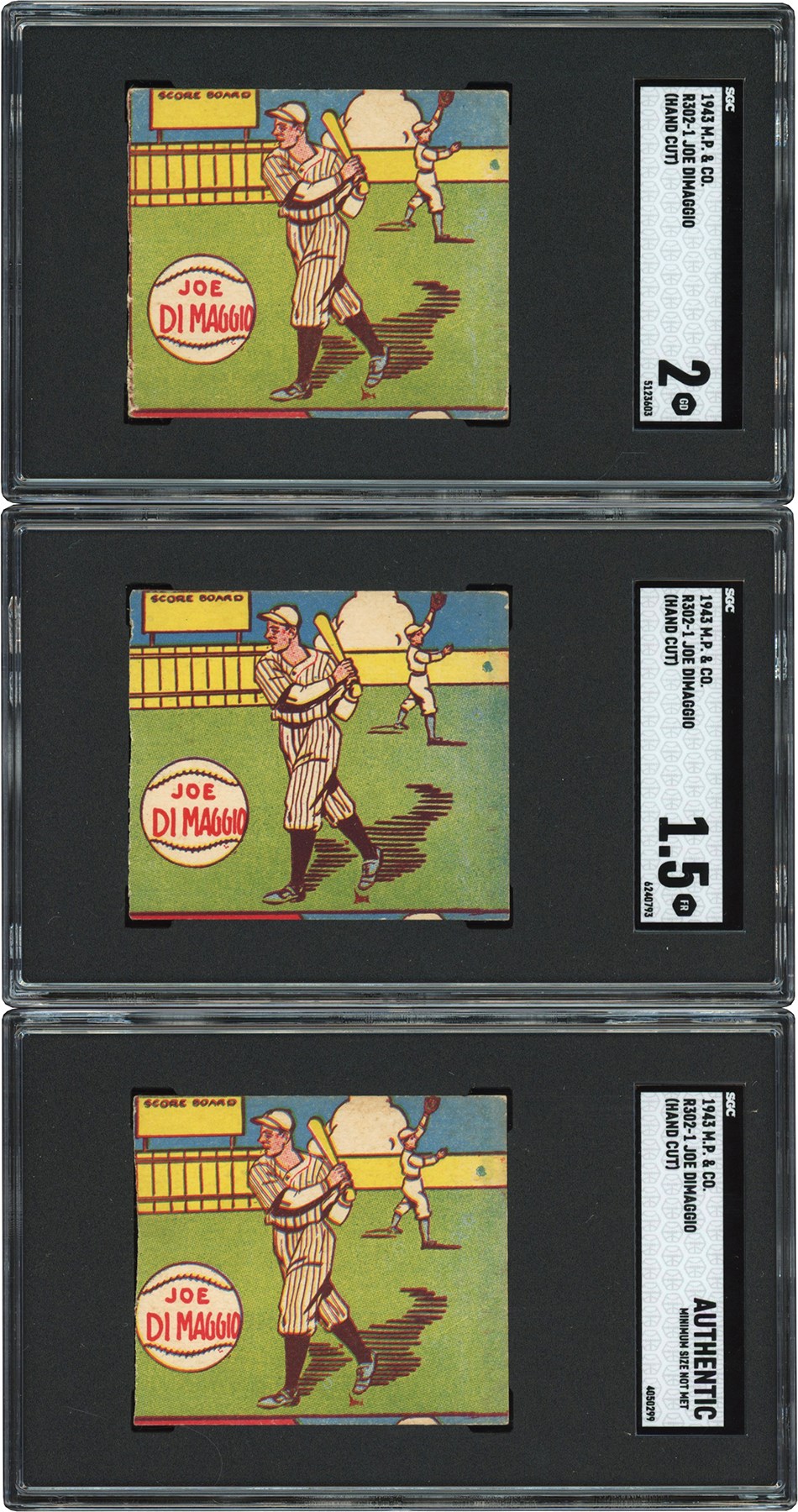 Near-complete set of 1943 R302-1 M. P. & Co. cards, consisting of twenty cards, plus twenty-five duplicates, for a total of forty-five cards. The set is MISSING the following four cards for completion: Greenberg, Hubbell, Novikoff, and Ruffing. (3) cards have been graded and encapsulated by SGC with: J DiMaggio GD 2; J DiMaggio FR 1.5; and J DiMaggio Authentic-Minimum Size Not Met. All are designated as hand cut. Ungraded examples include: Bonham (4) (1) PR (1) FR (2) GD, Boudreau (3) (1) FR (2) GD, Camilli GD, M. Cooper (4) (3) GD (1) VG, W. Cooper PR, Cronin (3) (1) PR-Missing 2 corners (2) FR, Danning PR, Dickey VG, J DiMaggio PR, Feller (2) (1) FR (1) GD, Foxx FR, Hack GD, Henrich (3) (1) PR-Missing Corner (2) GD, Medwick (3) (1) PR (1) FR (1) GD-Short, Mize FR-Short, Ott (3)-(1) PR (2) GD, Reese GD, Reiser (2)-(1) PR (1) FR, Vander Meer (4)-(2) GD (2) FR, and T Williams (2)-(1) GD (1) FR.