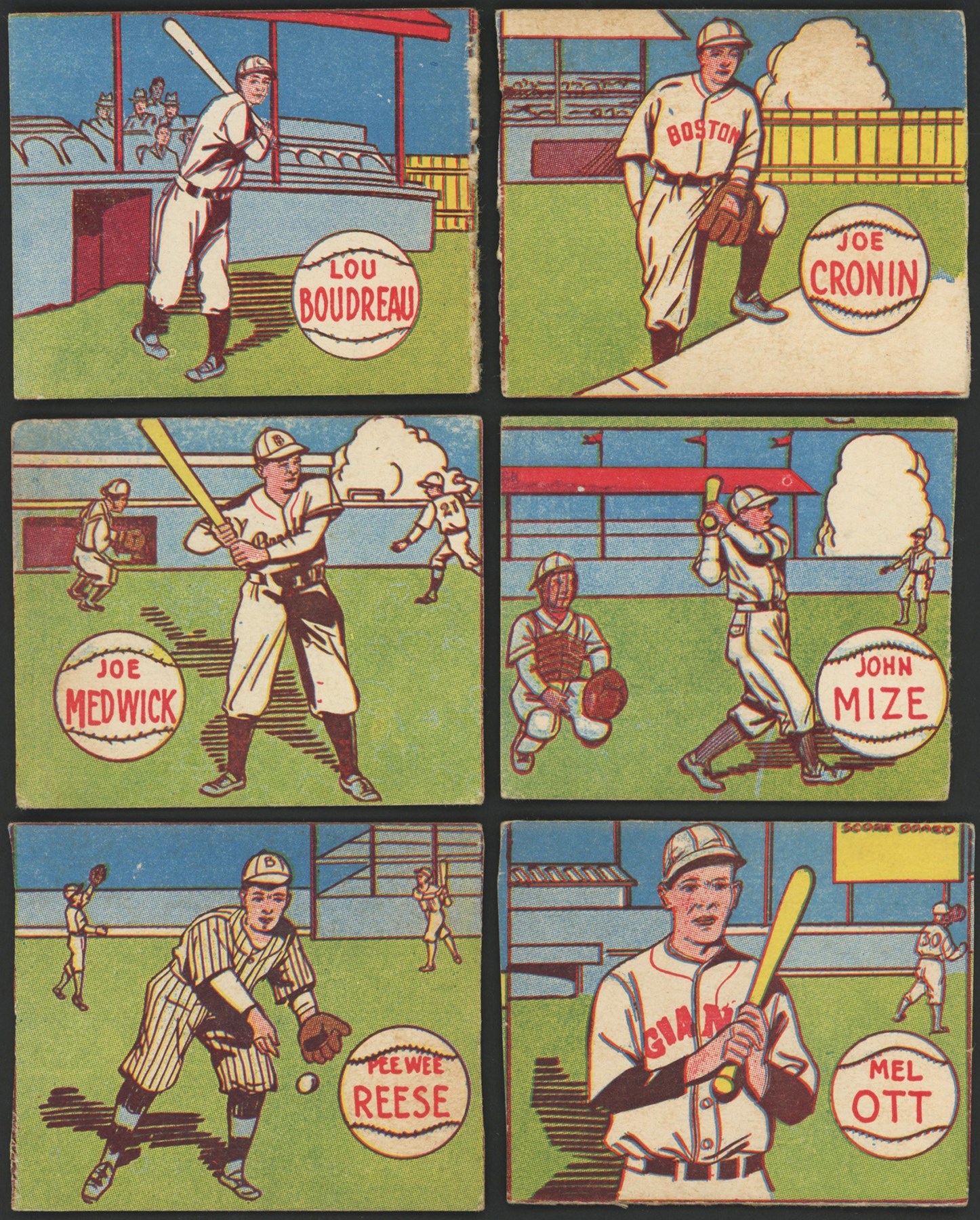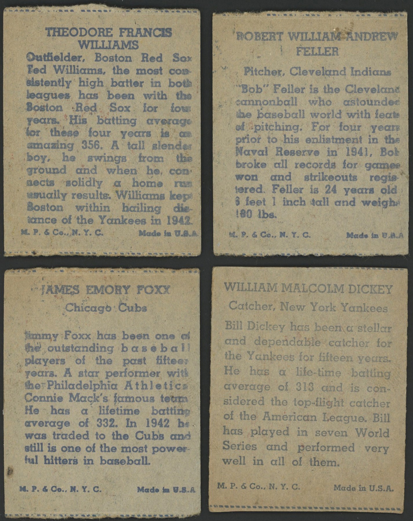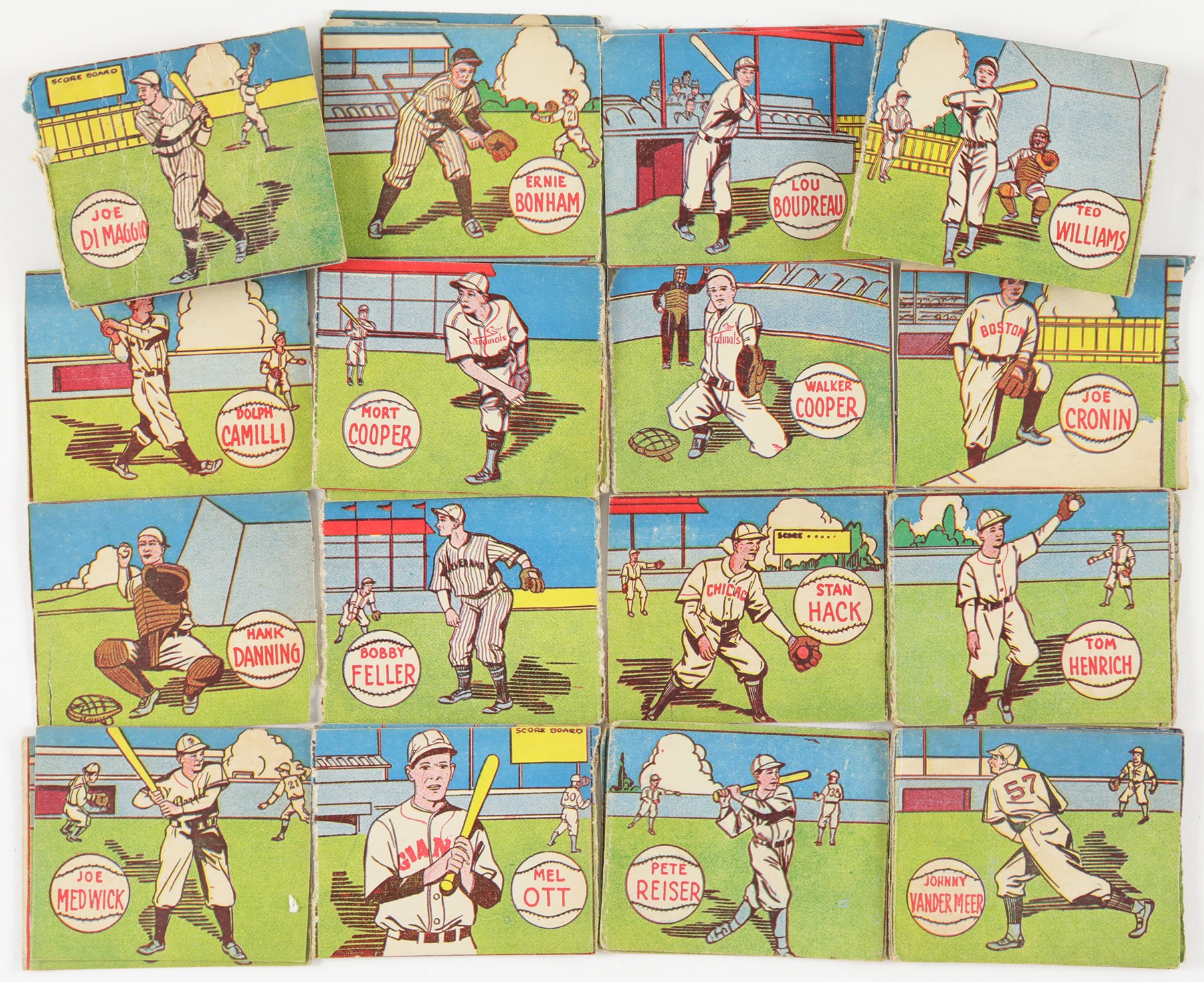 Near-complete set of 1943 R302-1 M. P. & Co. cards, consisting of twenty cards, plus twenty-five duplicates, for a total of forty-five cards. The set is MISSING the following four cards for completion: Greenberg, Hubbell, Novikoff, and Ruffing. (3) cards have been graded and encapsulated by SGC with: J DiMaggio GD 2; J DiMaggio FR 1.5; and J DiMaggio Authentic-Minimum Size Not Met. All are designated as hand cut. Ungraded examples include: Bonham (4) (1) PR (1) FR (2) GD, Boudreau (3) (1) FR (2) GD, Camilli GD, M. Cooper (4) (3) GD (1) VG, W. Cooper PR, Cronin (3) (1) PR-Missing 2 corners (2) FR, Danning PR, Dickey VG, J DiMaggio PR, Feller (2) (1) FR (1) GD, Foxx FR, Hack GD, Henrich (3) (1) PR-Missing Corner (2) GD, Medwick (3) (1) PR (1) FR (1) GD-Short, Mize FR-Short, Ott (3)-(1) PR (2) GD, Reese GD, Reiser (2)-(1) PR (1) FR, Vander Meer (4)-(2) GD (2) FR, and T Williams (2)-(1) GD (1) FR.