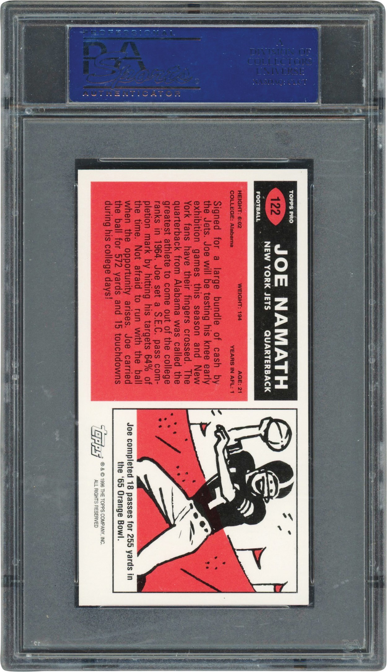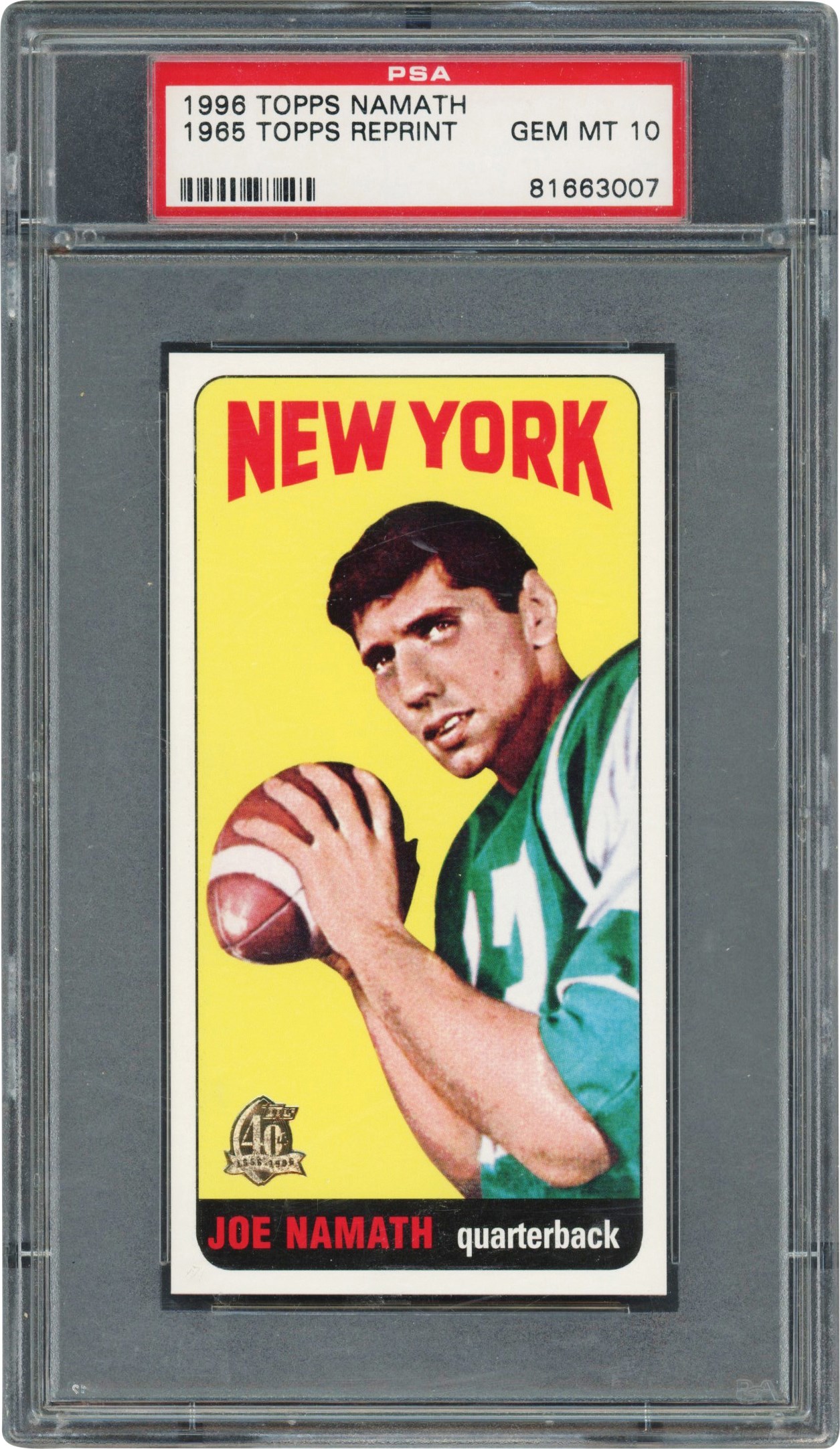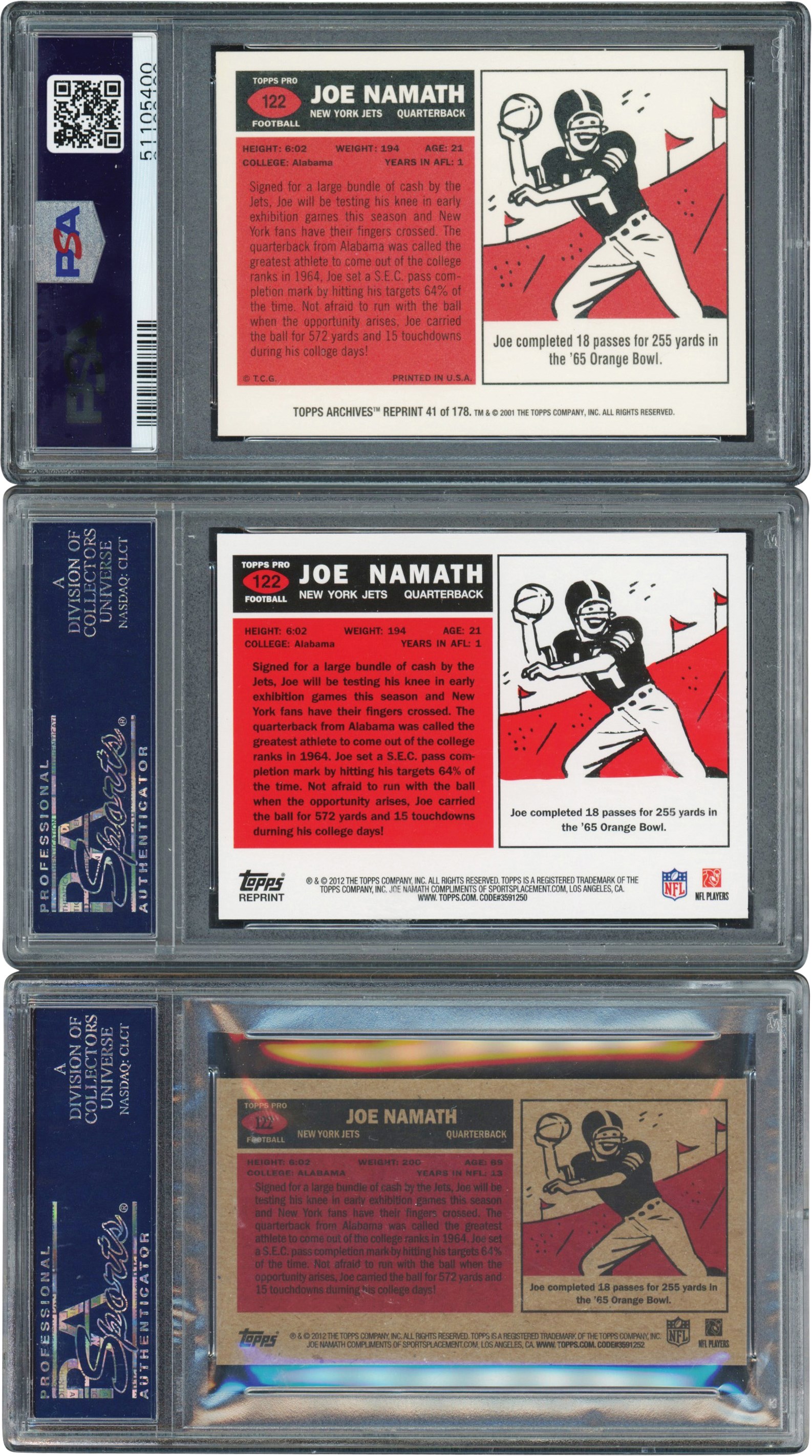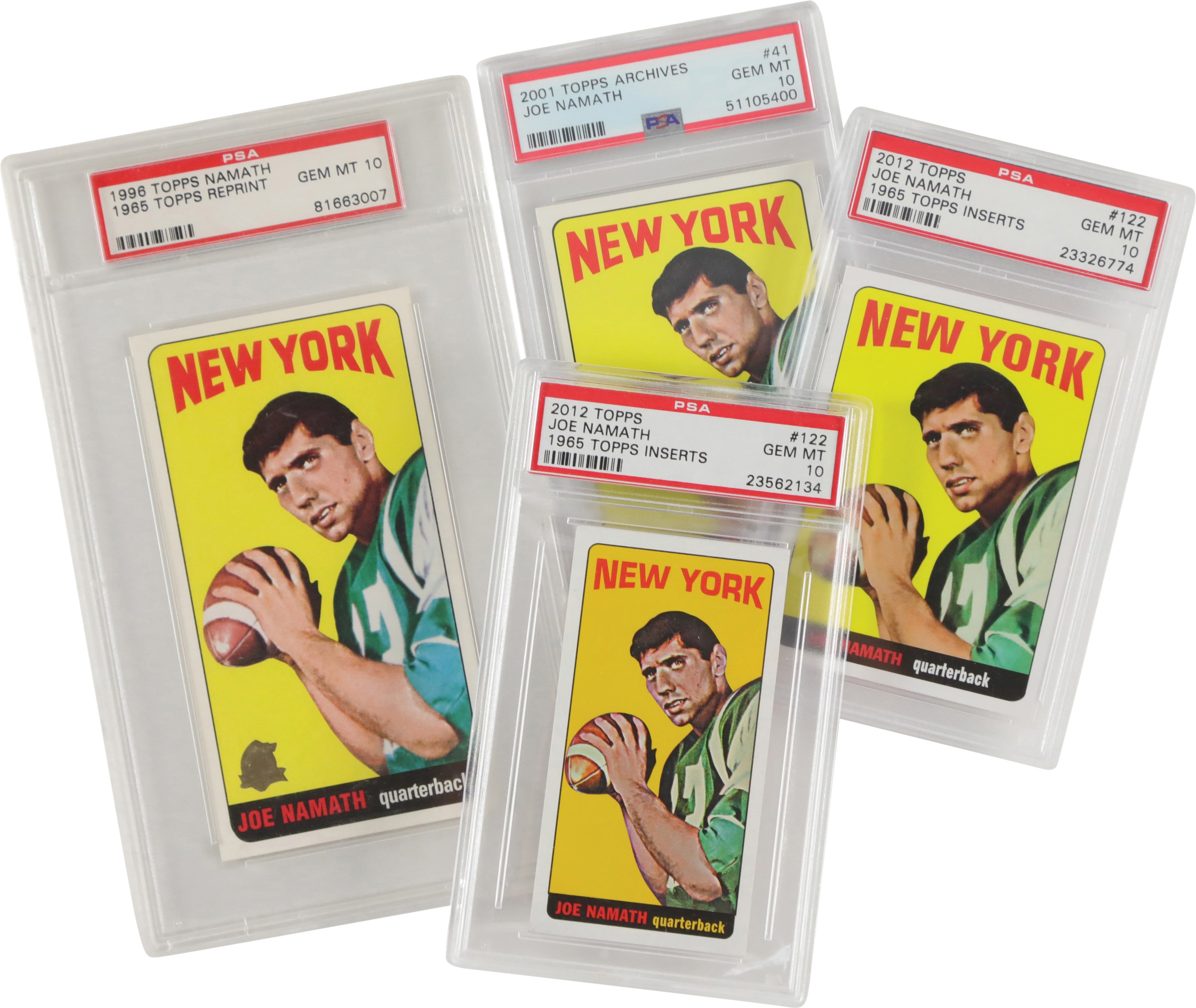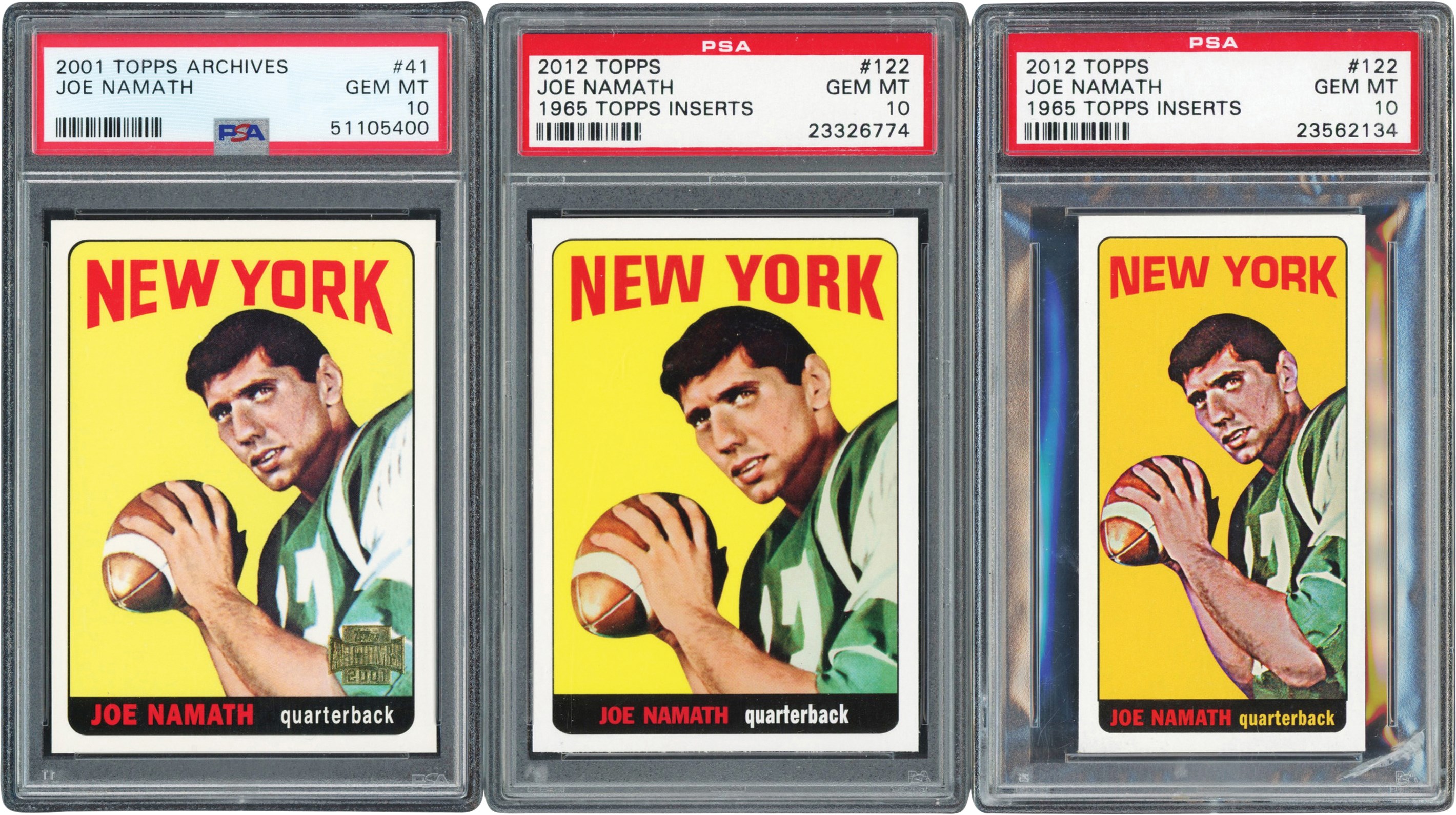 1996-2012 Topps Reprint Joe Namath Rookie card collection of (4). All of the cards have been graded and encapsulated by PSA as Gem Mint 10. The collection includes: 1996 Topps Namath 1965 Reprint Gem Mint 10; 2001 Topps Archives 41 Joe Namath Gem Mint 10; 2012 Topps 1965 Topps Inserts 122 Joe Namath Gem Mint 10; and 2012 Topps 1965 Topps Inserts Mini 122 Joe Namath Gem Mint 10.
