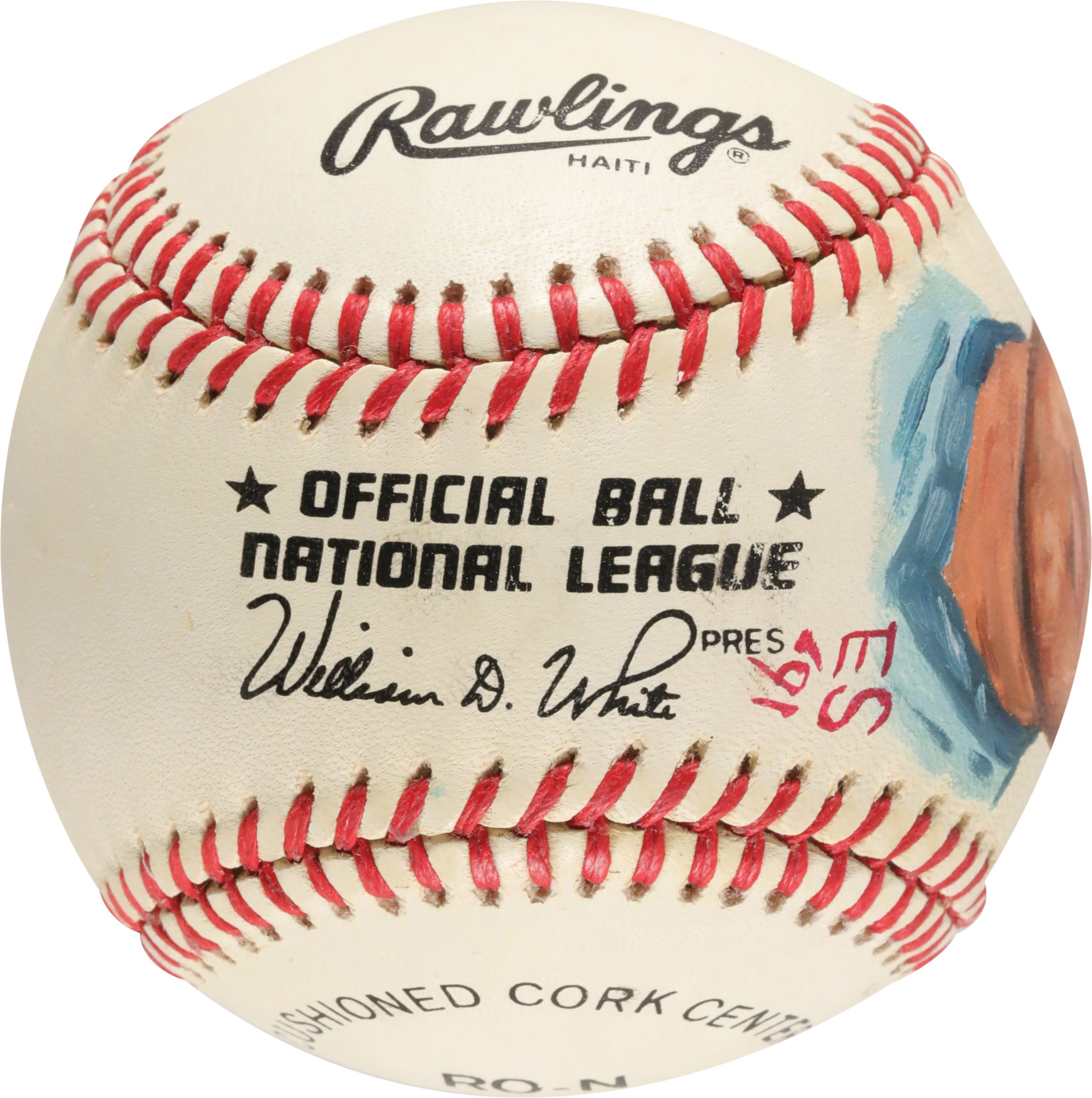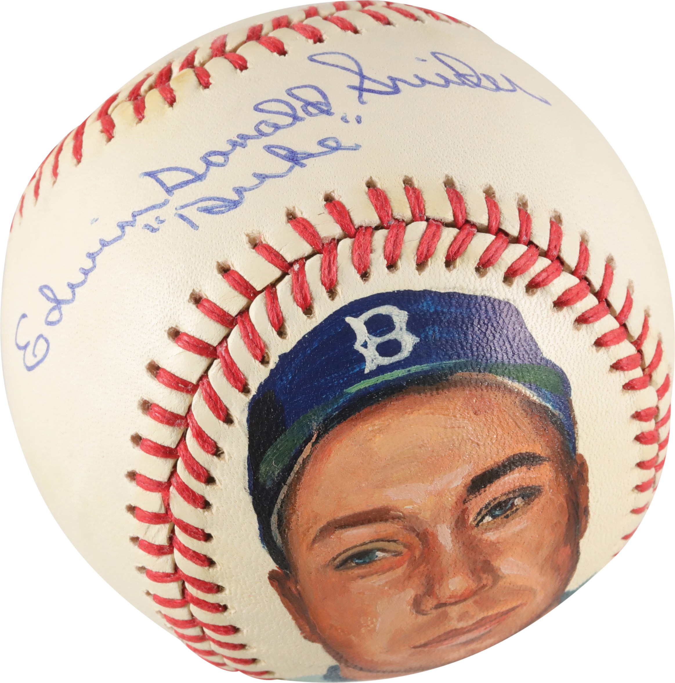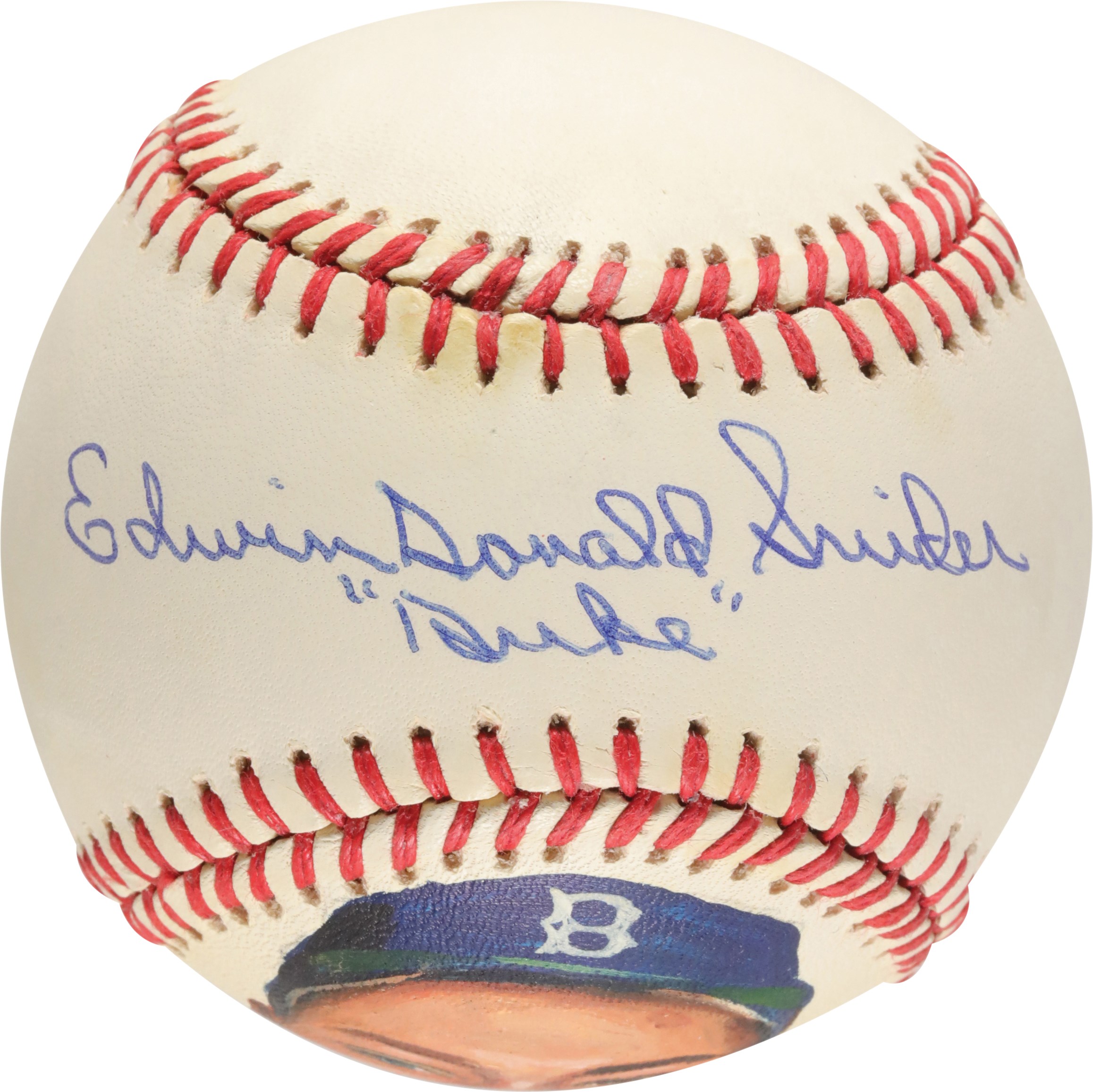 Snider, in a rare occurrence, signed his name on the ball as "Edwin Donald Snider." The Duke used a blue ballpoint pen to write "Edwin Donald Snider 'Duke'" on the sweet spot. In addition, on a side panel is a color image of Snider, hand done by an artist who signed, in red ink, "ES '91." The image of Snider shows him in a Brooklyn Dodgers cap, and it is replete with a very nuanced Snider portrait. The Official National League (Giamatti) baseball is NRMT, along with the hand done portrait of Snider. The offering comes with a PSA LOA for the signature.