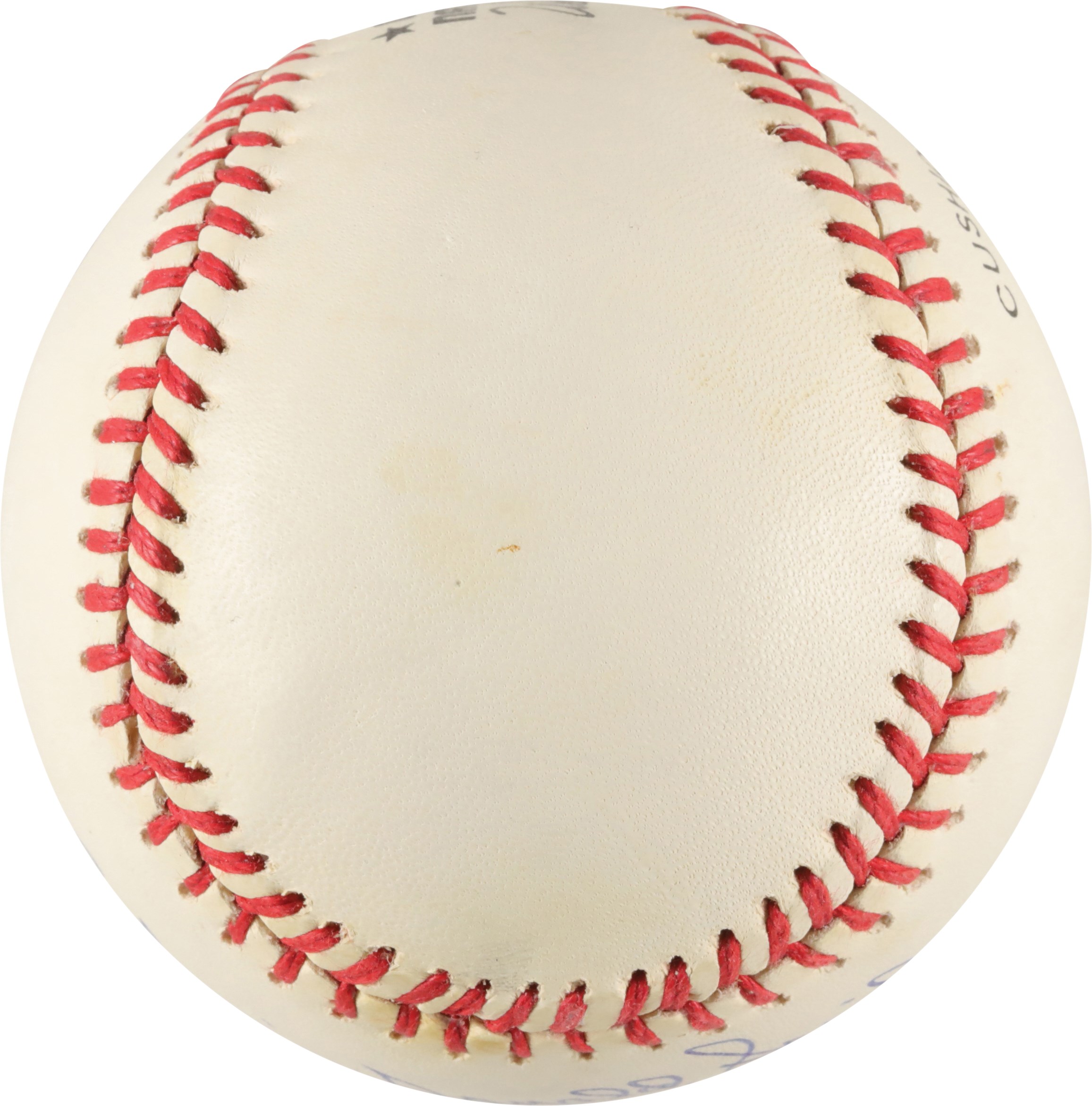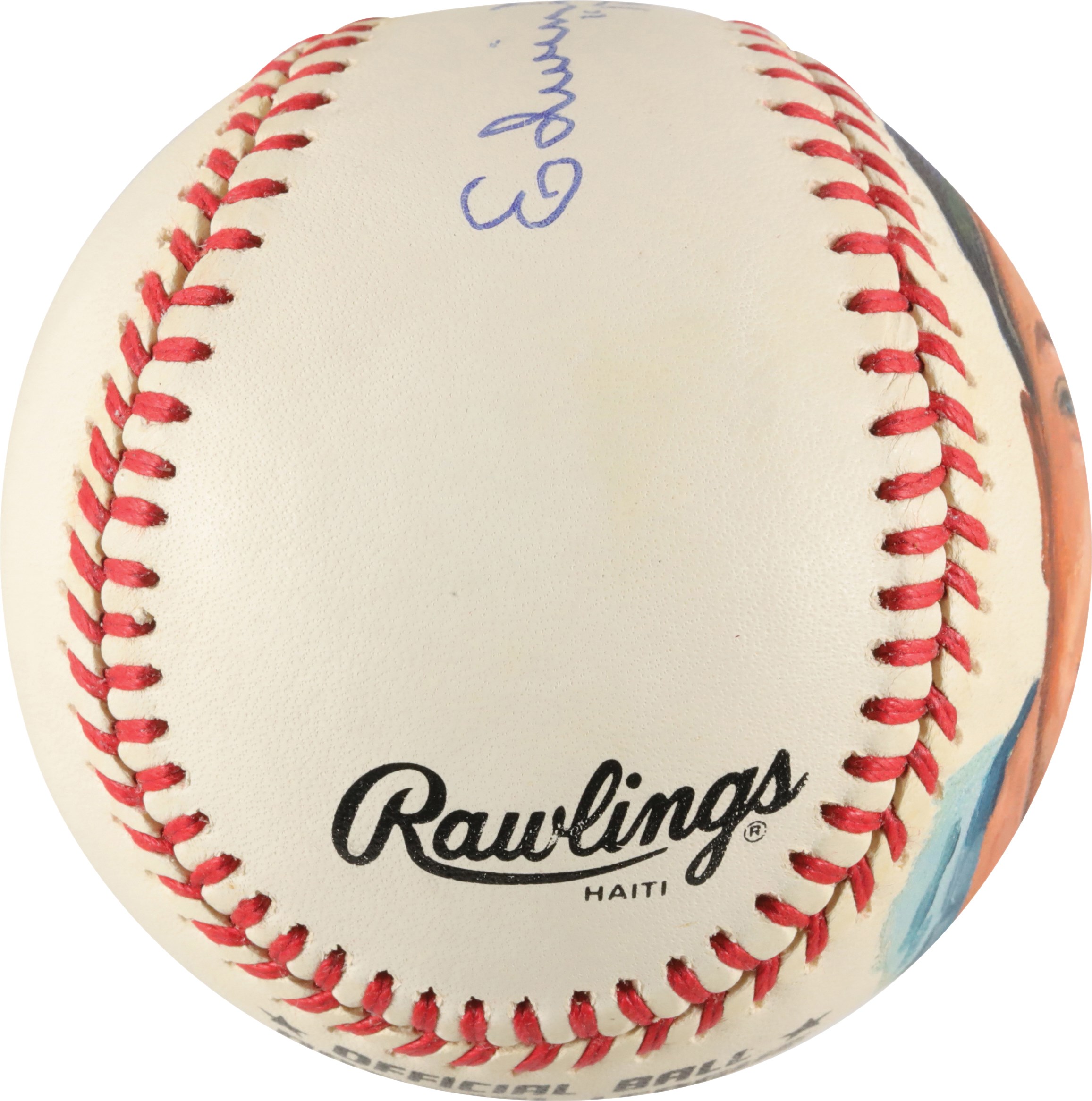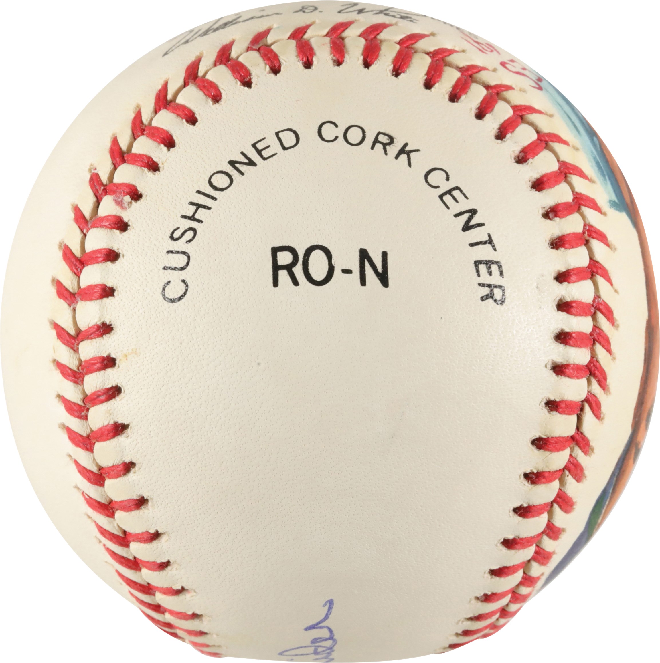 Snider, in a rare occurrence, signed his name on the ball as "Edwin Donald Snider." The Duke used a blue ballpoint pen to write "Edwin Donald Snider 'Duke'" on the sweet spot. In addition, on a side panel is a color image of Snider, hand done by an artist who signed, in red ink, "ES '91." The image of Snider shows him in a Brooklyn Dodgers cap, and it is replete with a very nuanced Snider portrait. The Official National League (Giamatti) baseball is NRMT, along with the hand done portrait of Snider. The offering comes with a PSA LOA for the signature.