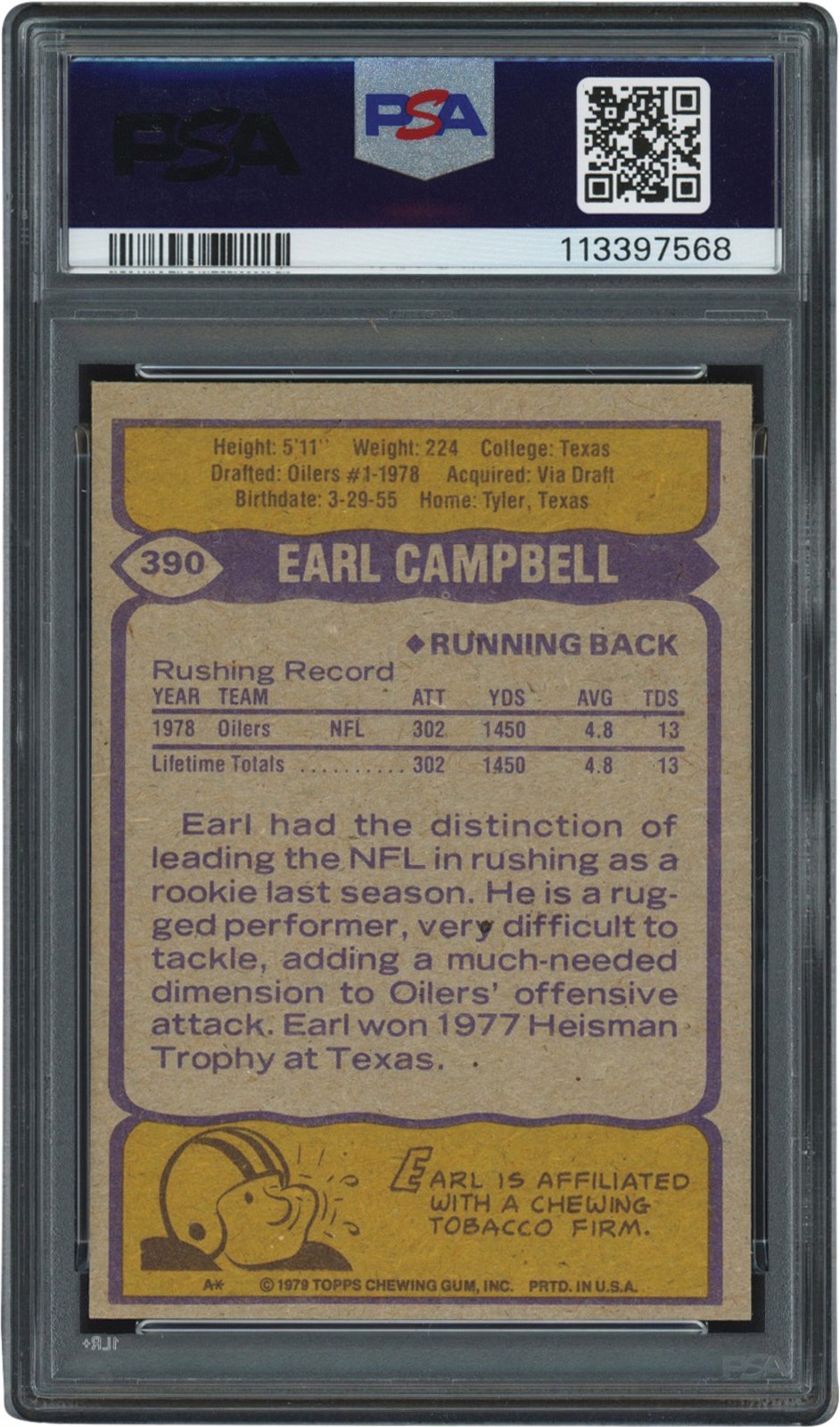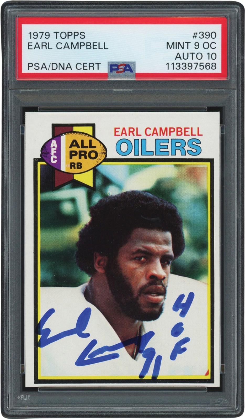1979 Topps Football 390 Earl Campbell autographed (R) card. The card and autograph have been graded and encapsulated by PSA MT 9 (OC) with an Auto grade of 10. The autograph was done in blue Sharpie across the chest of Campbell with HOF 91 inscription. The card itself retains its white borders with smooth edges. Centering is off left to right and top to bottom. All four corners appear sharp. The reverse is clean.