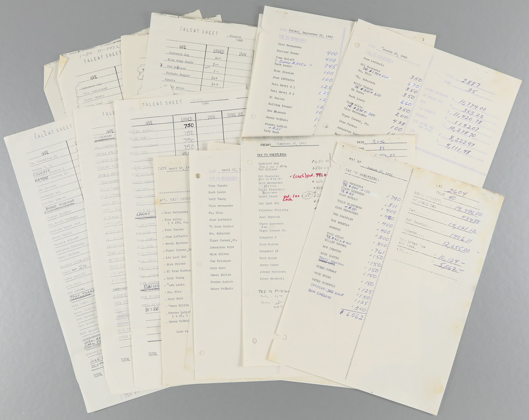 Lot of 31 talent sheets from 1980-85 Texas wrestling. Each sheet of paper measures 8.5x11" and includes historical names in wrestling history. Some of the names that are written and/or typed on these sheets are: Bruiser Brody, Hacksaw Butch Reed, Jake Roberts, Junkyard Dog, Ted DiBiase, Mr. Wrestling II, Tony Atlas, Kamala, Hacksaw Jim Duggan, Skandor Akbar, Toru Tanaka, Dusty Rhodes, King Kong Bundy, Dick Slater, Lord Humongous, Buzz Sawyer, and many more. There are staple holes in top left corners of most of the pages. Overall, the pages are in very good to excellent condition. These papers were used to keep track of the money owed to the wrestlers for their event appearances in Houston, Texas.